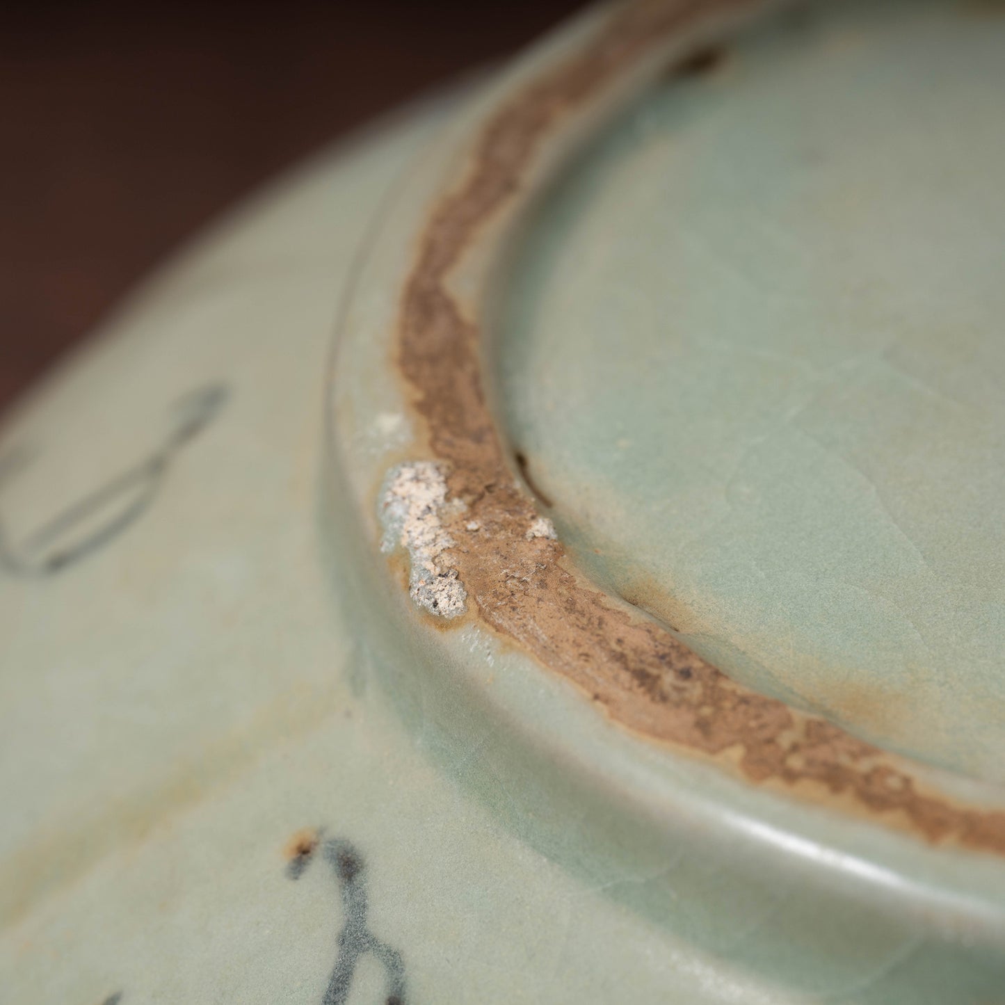 Five stone marks remain on the bottom, and a thick layer of devitrifying celadon glaze is applied to the entire surface except for the base.