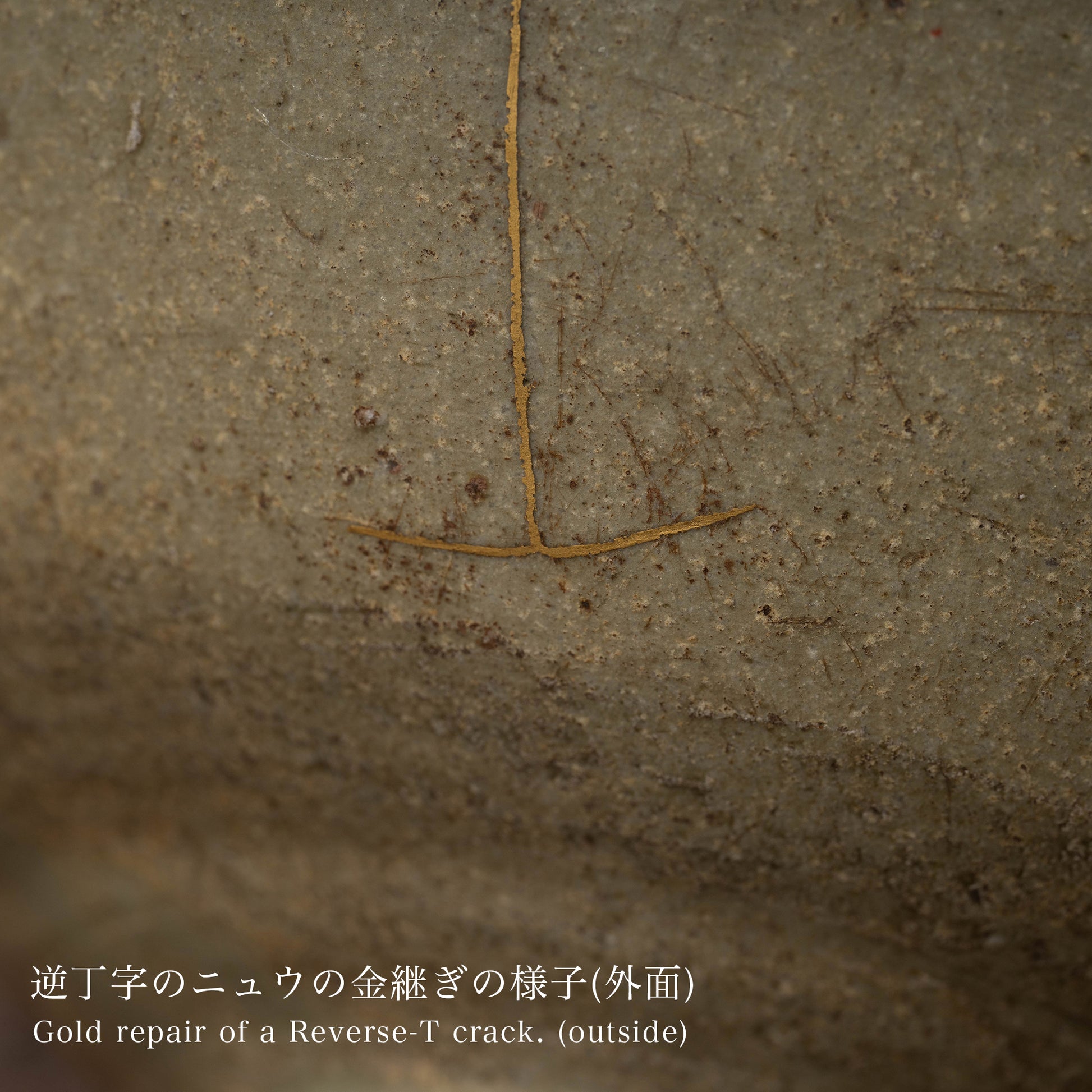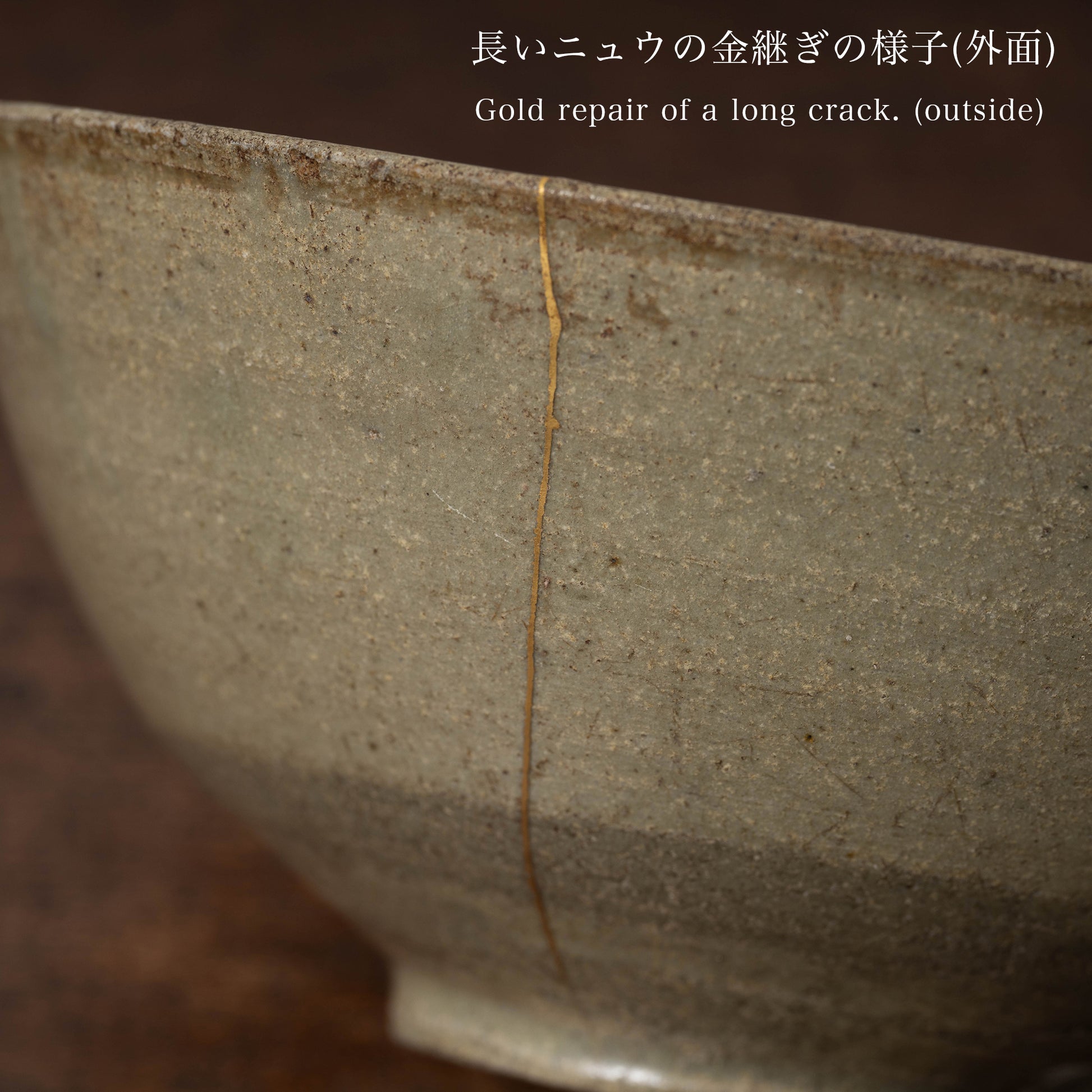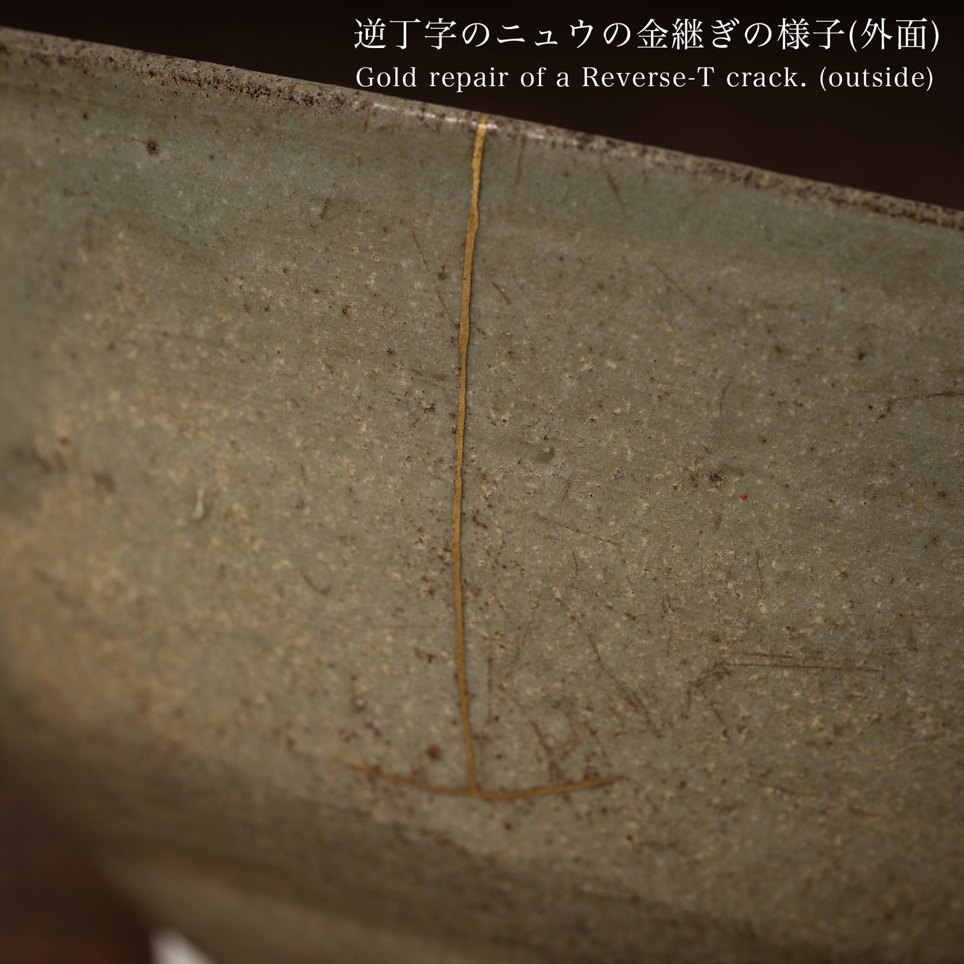 胴にある特徴的なニュウは金継ぎで直してあり、一つは見込みまで走るよう長く、もう一つは先端を横切るよう逆さの丁の字のようです。