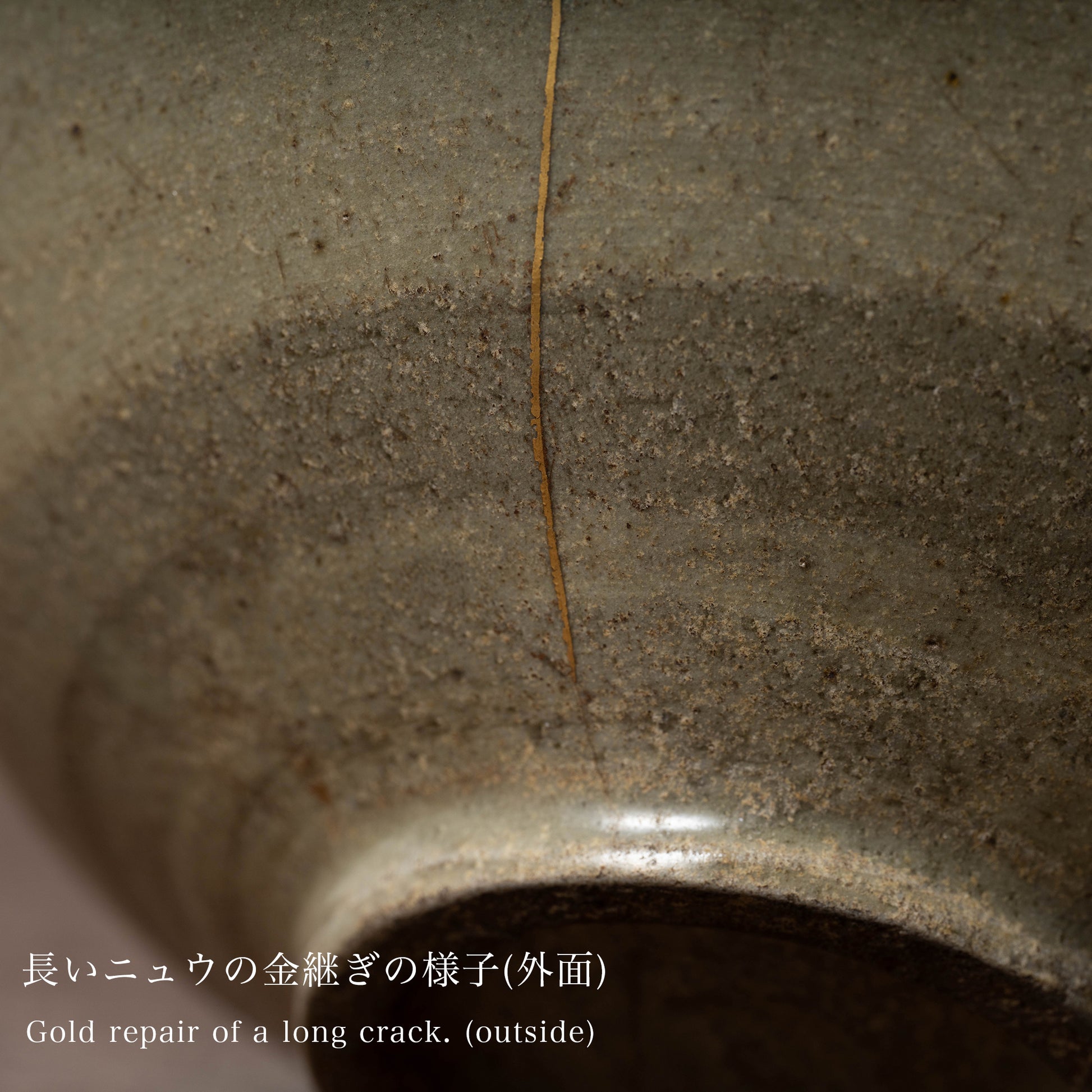 短い丁字のニュウ:口縁部から腰にかけてニュウが入っています。ニュウ外面まで入っており金継ぎで直してあります。