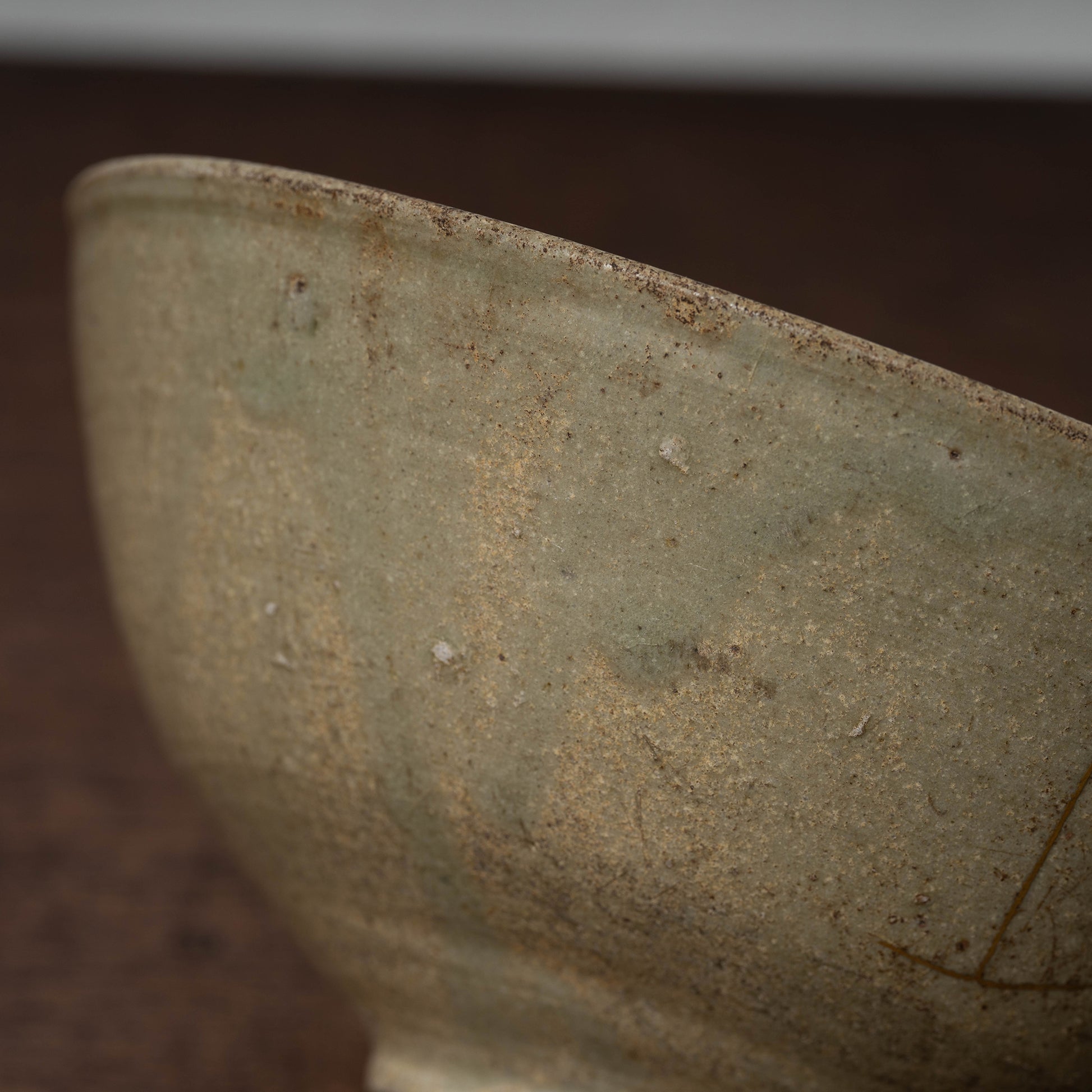 長いニュウ:口縁部から見込みにかけて長いニュウが入っています。外面まで入っており、口から見込みの段差あたりまで金継ぎで直し、段差から先は漆のみで埋めてあると考えられます。ニュウの横にあるのは釉薬のみのニュウです。