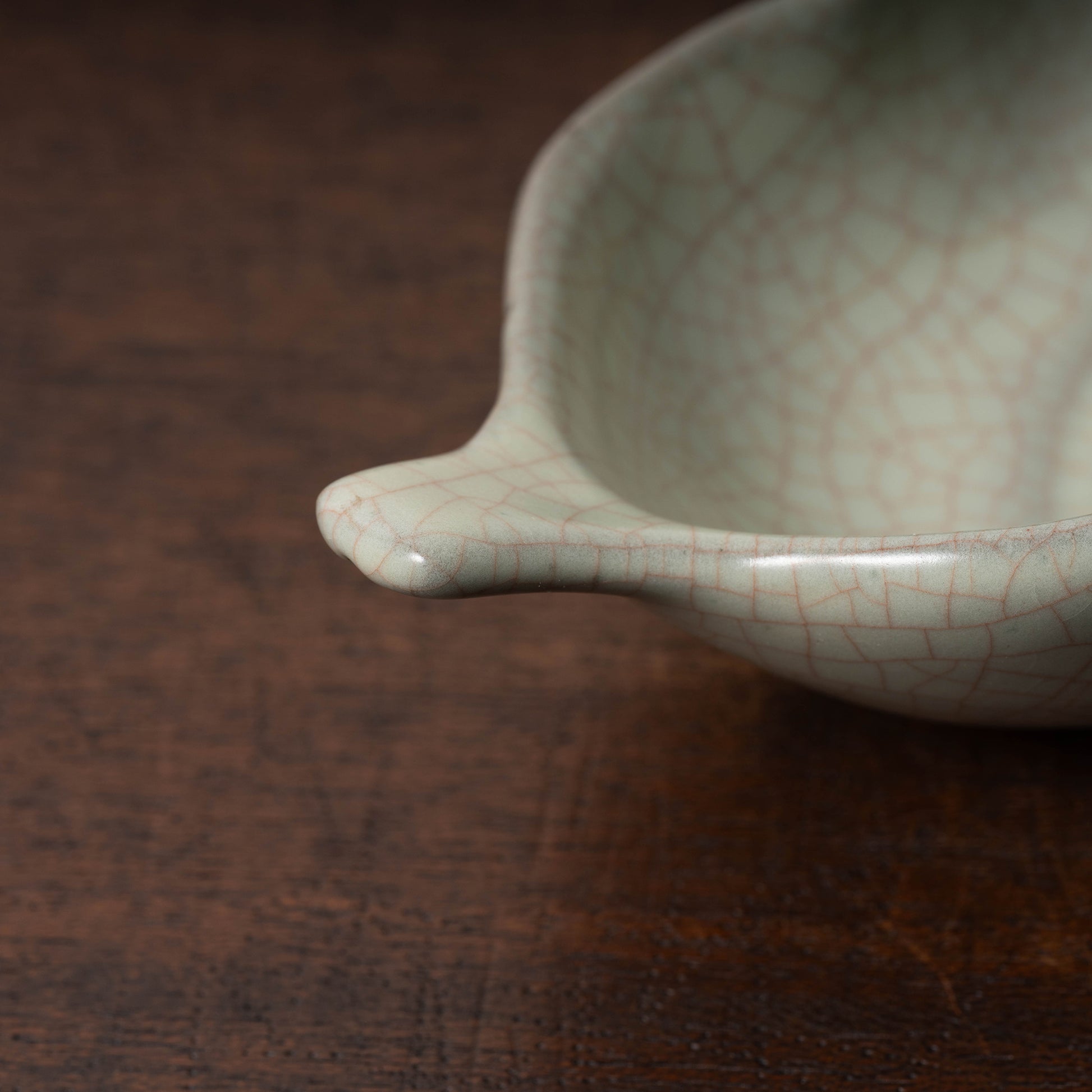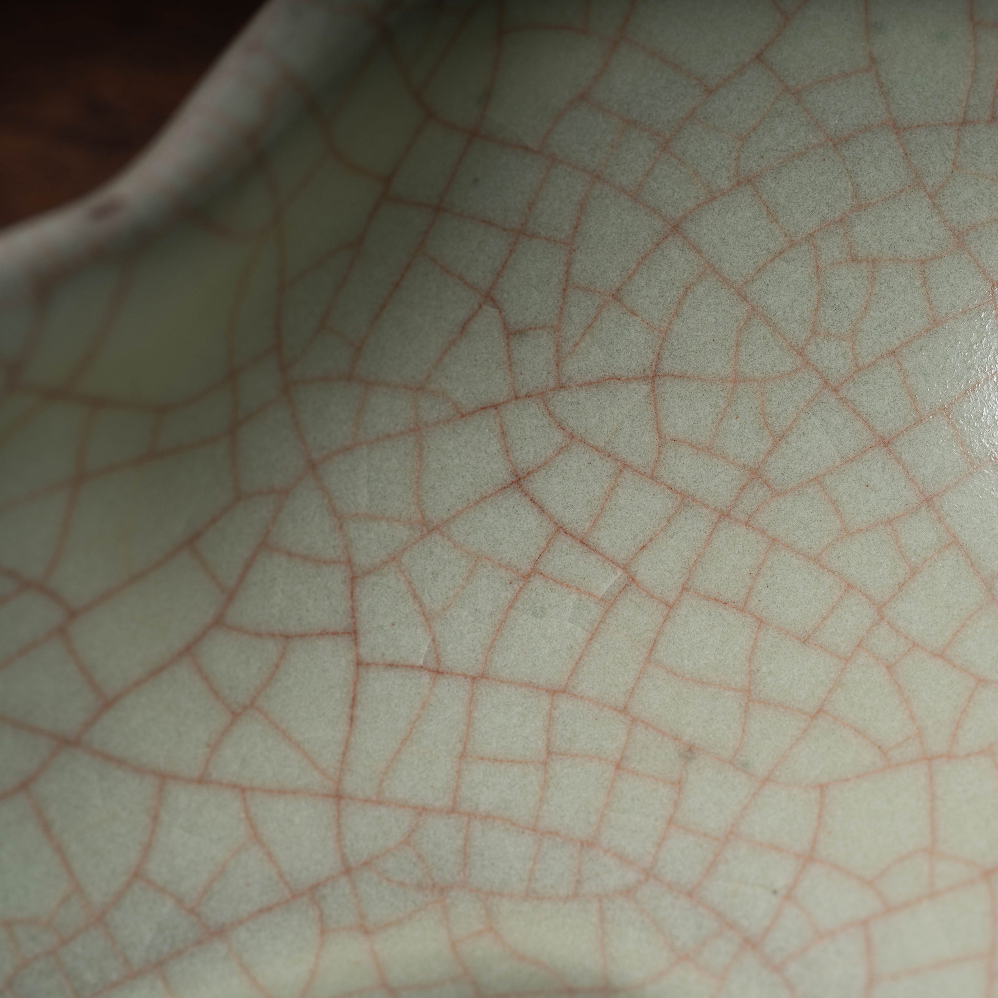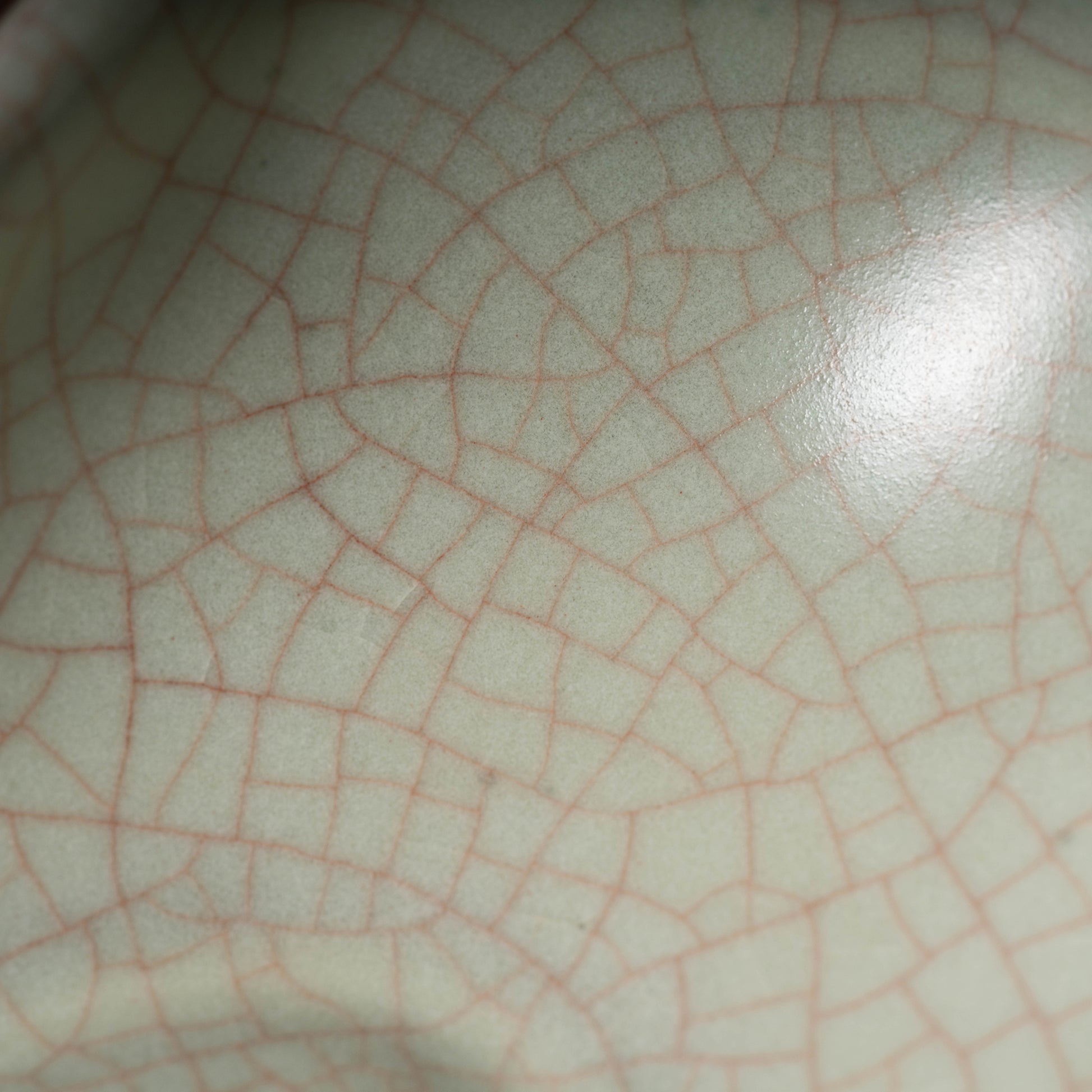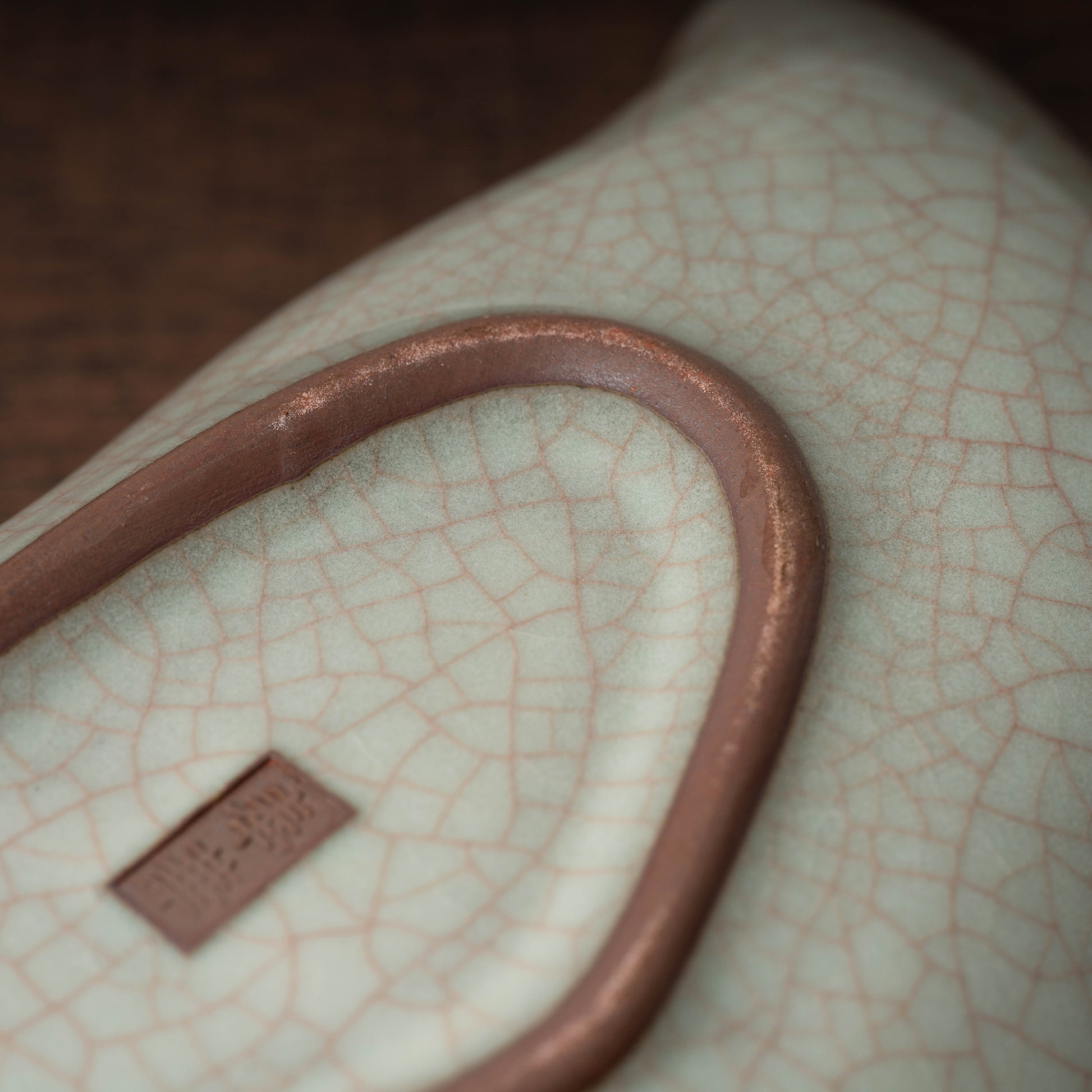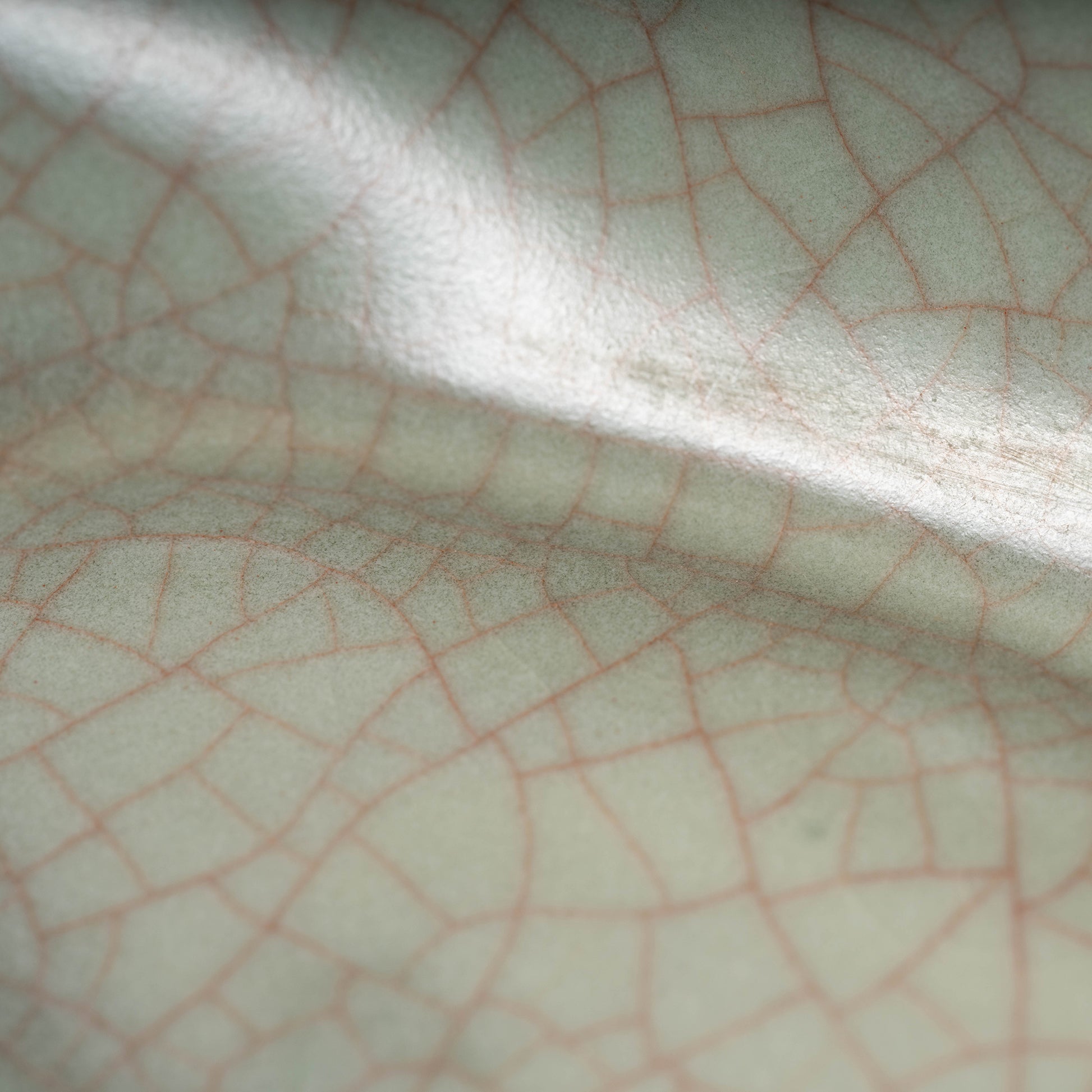 全体には宋代哥窯に倣った哥釉掛かり、柔らかな淡い緑色の釉調です。
