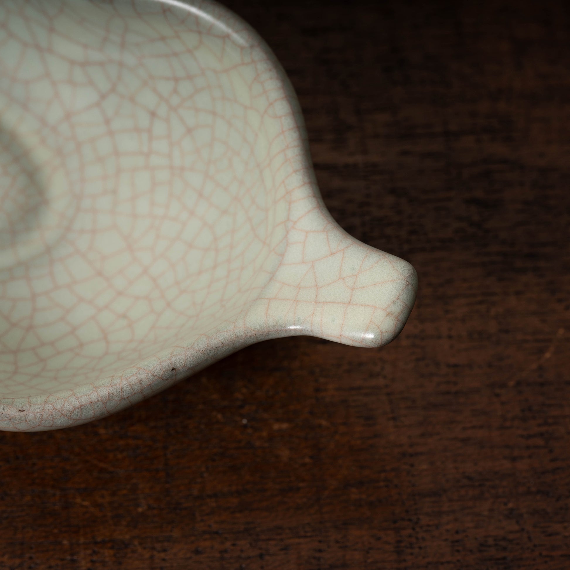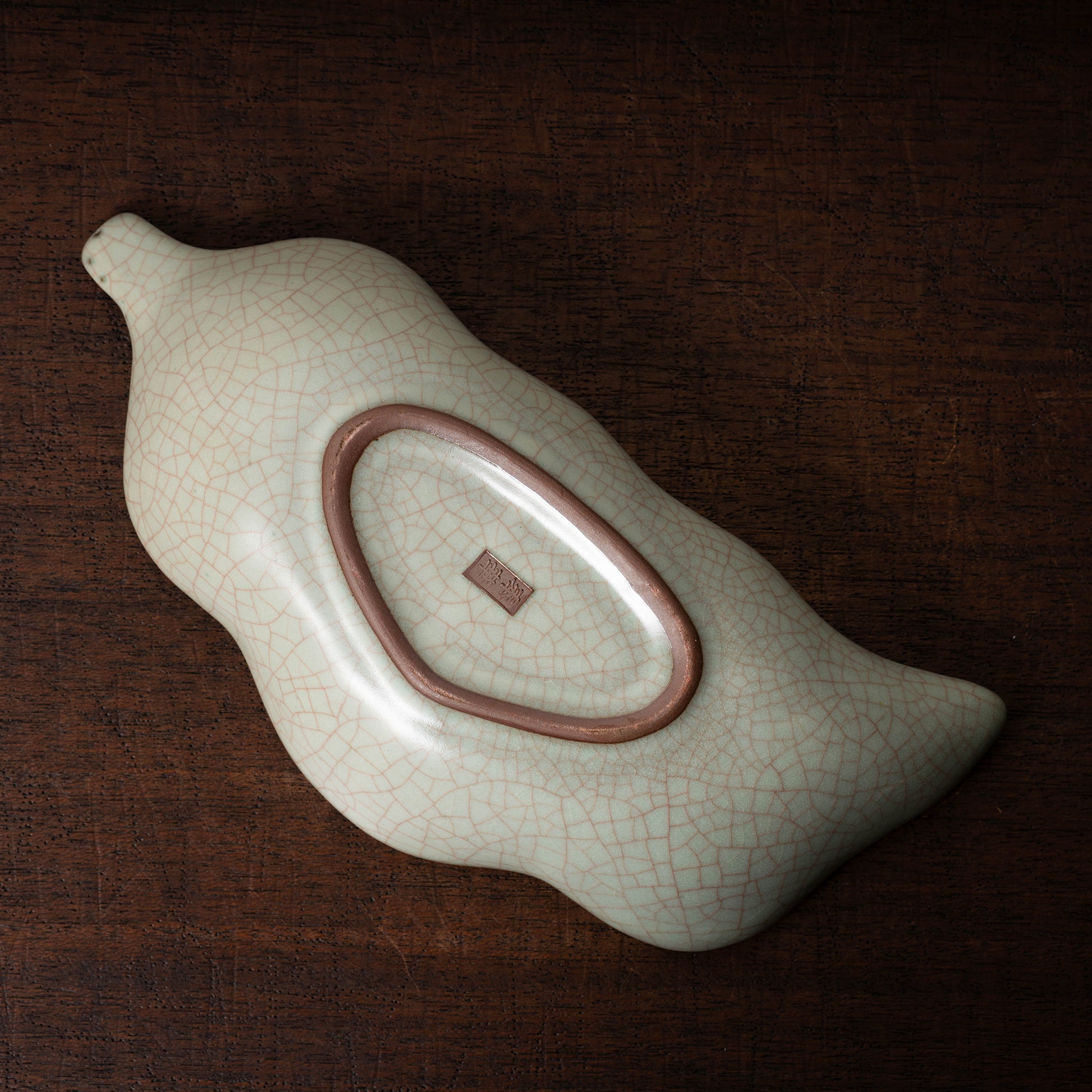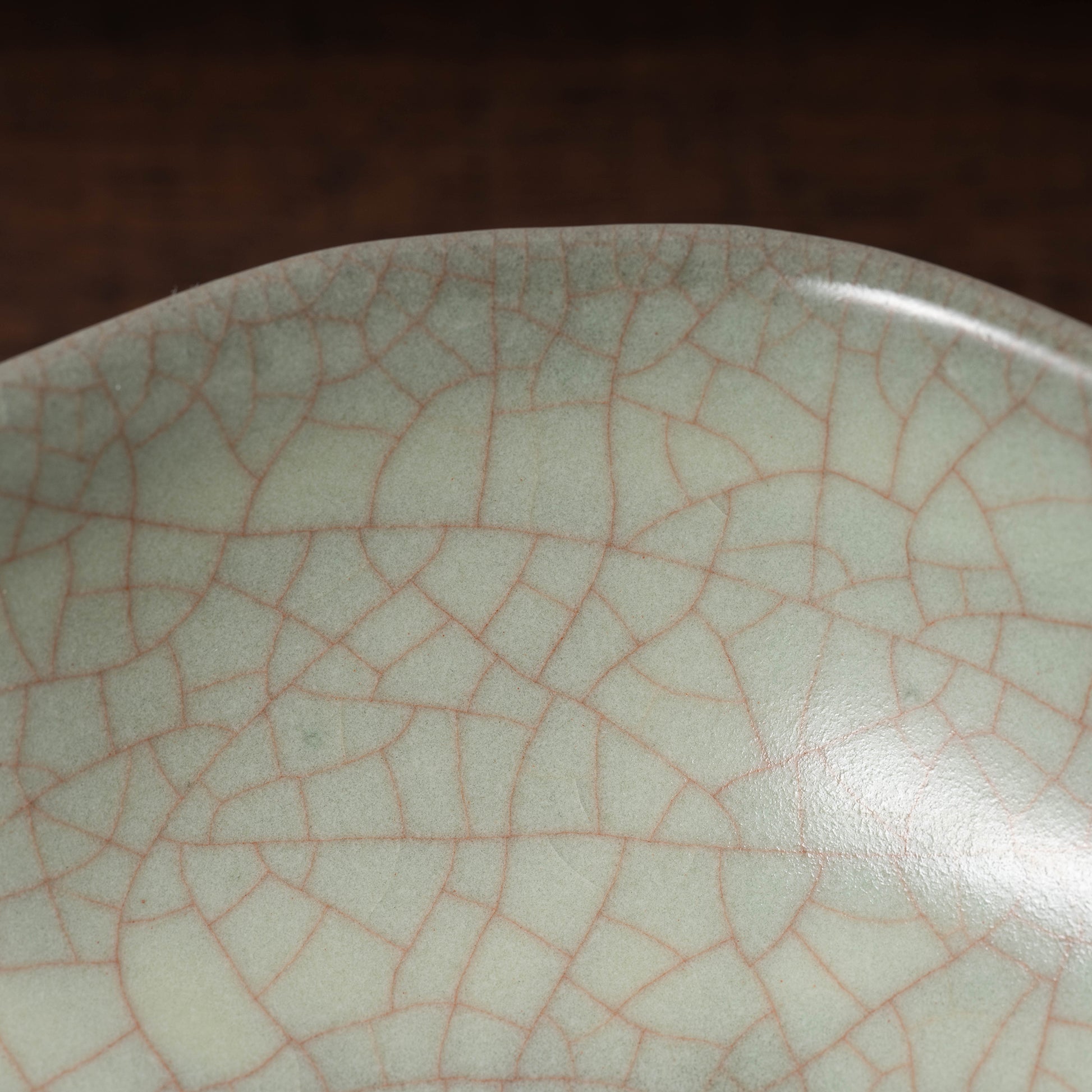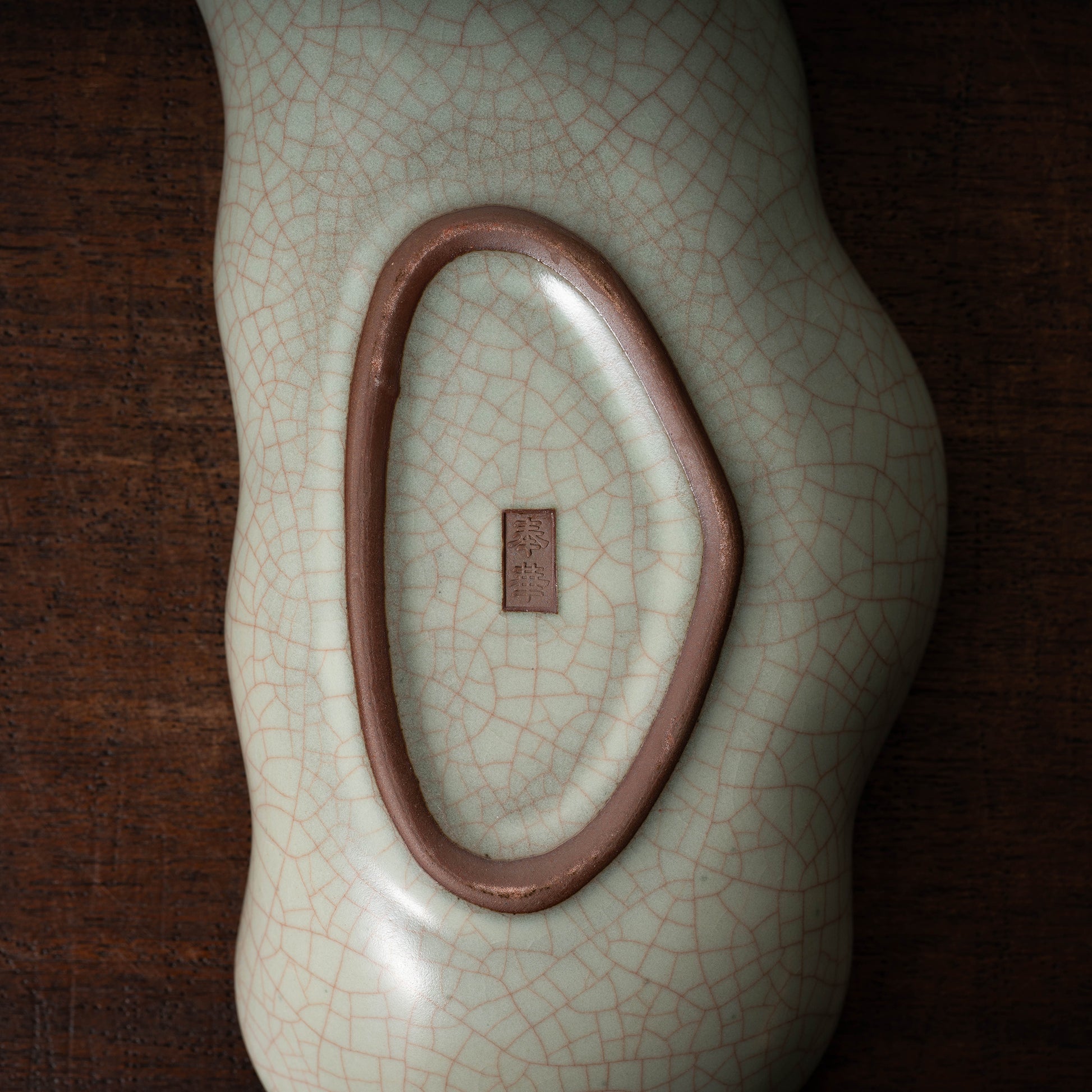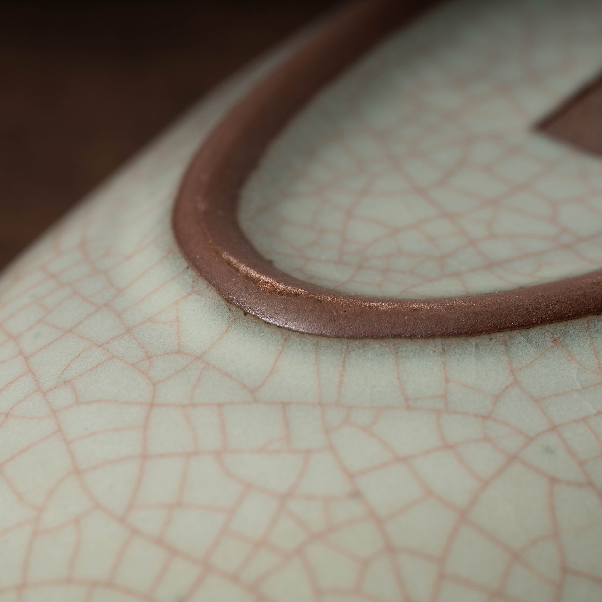 全体には宋代哥窯に倣った哥釉掛かり、柔らかな淡い緑色の釉調です。