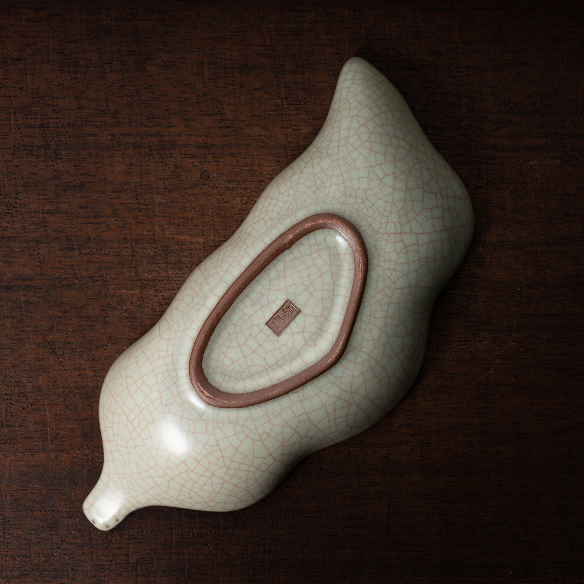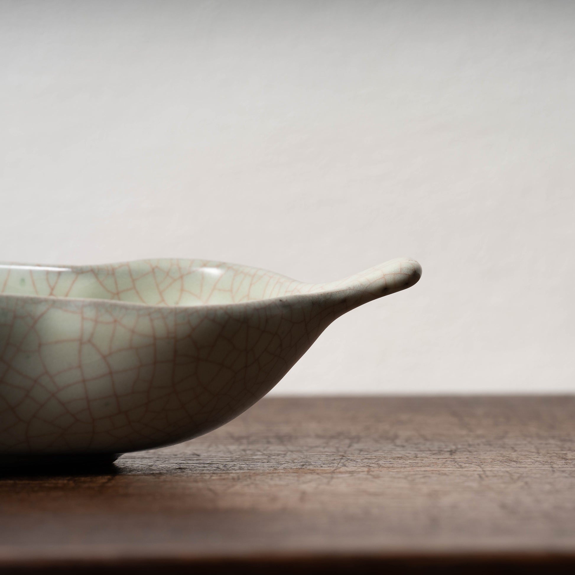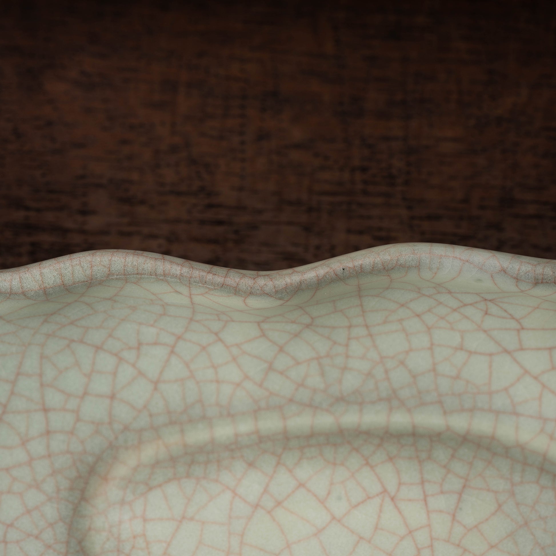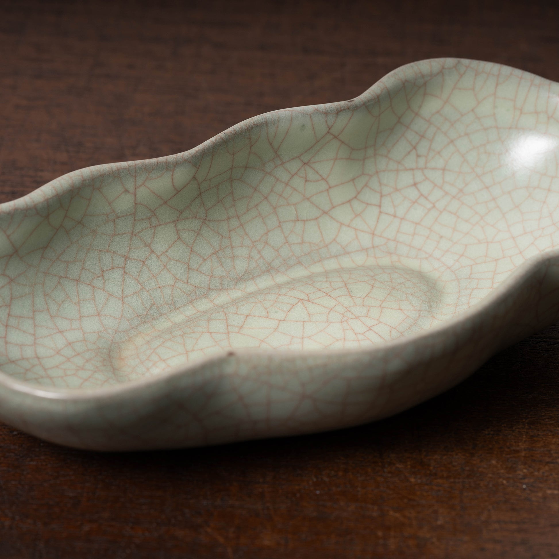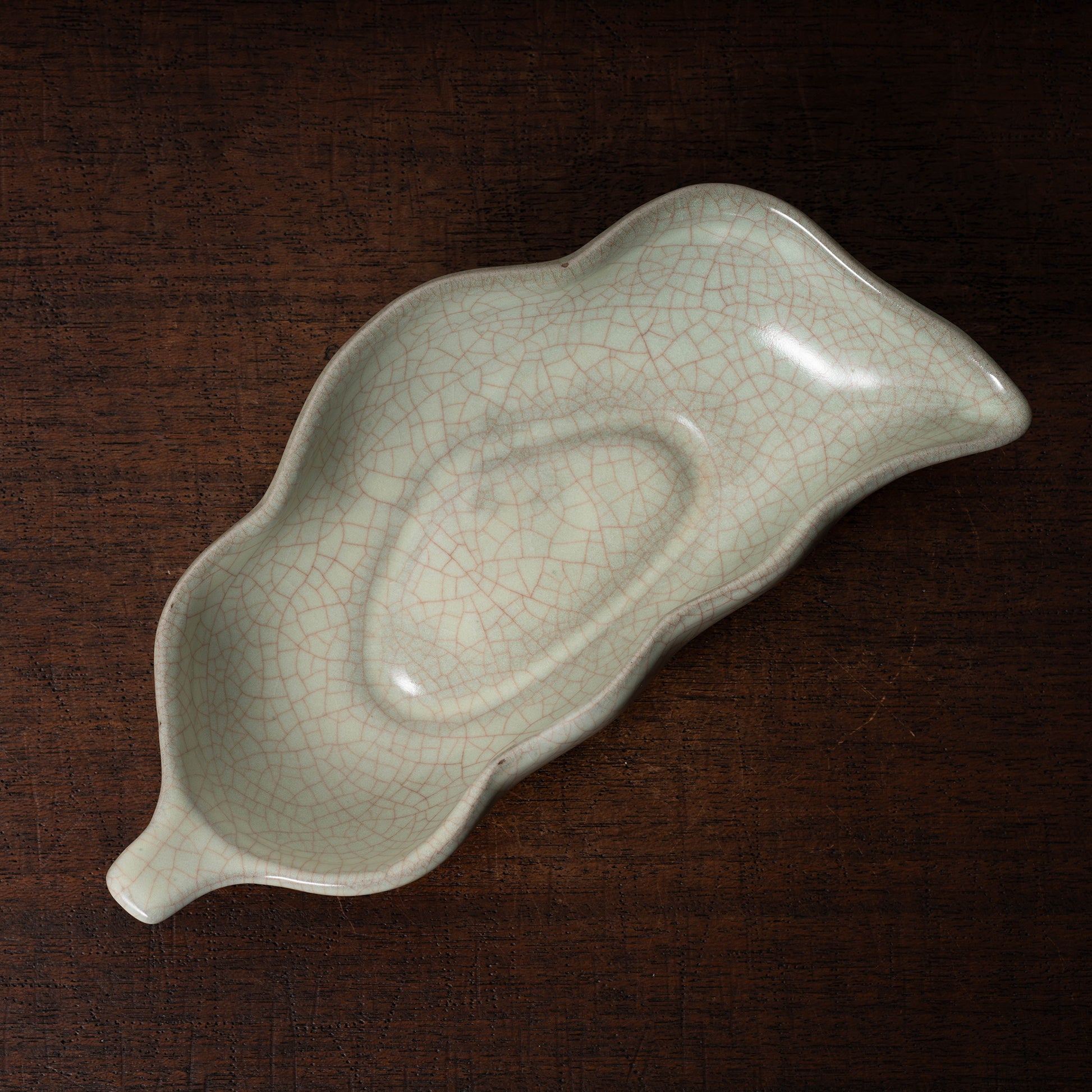 全体には宋代哥窯に倣った哥釉掛かり、柔らかな淡い緑色の釉調です。