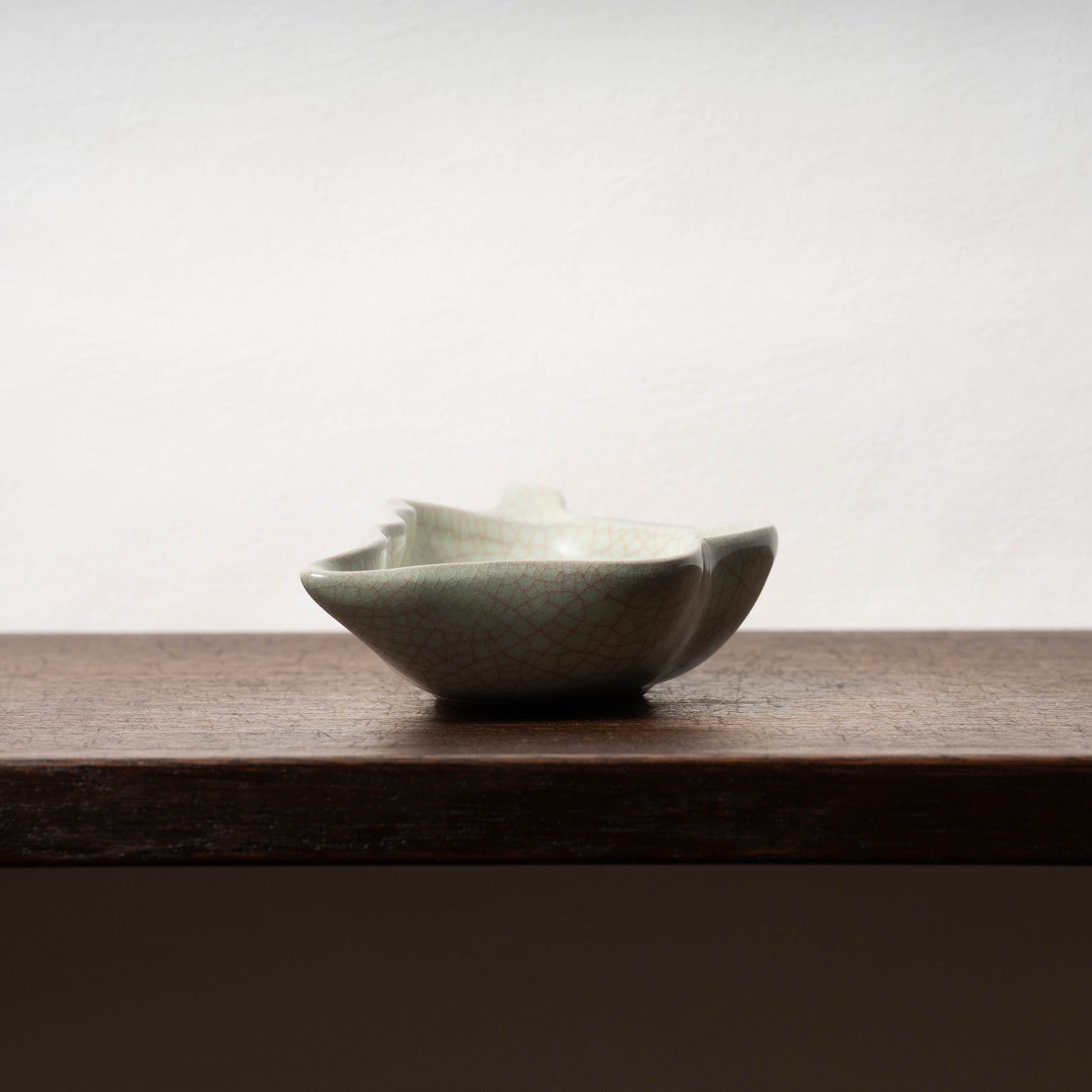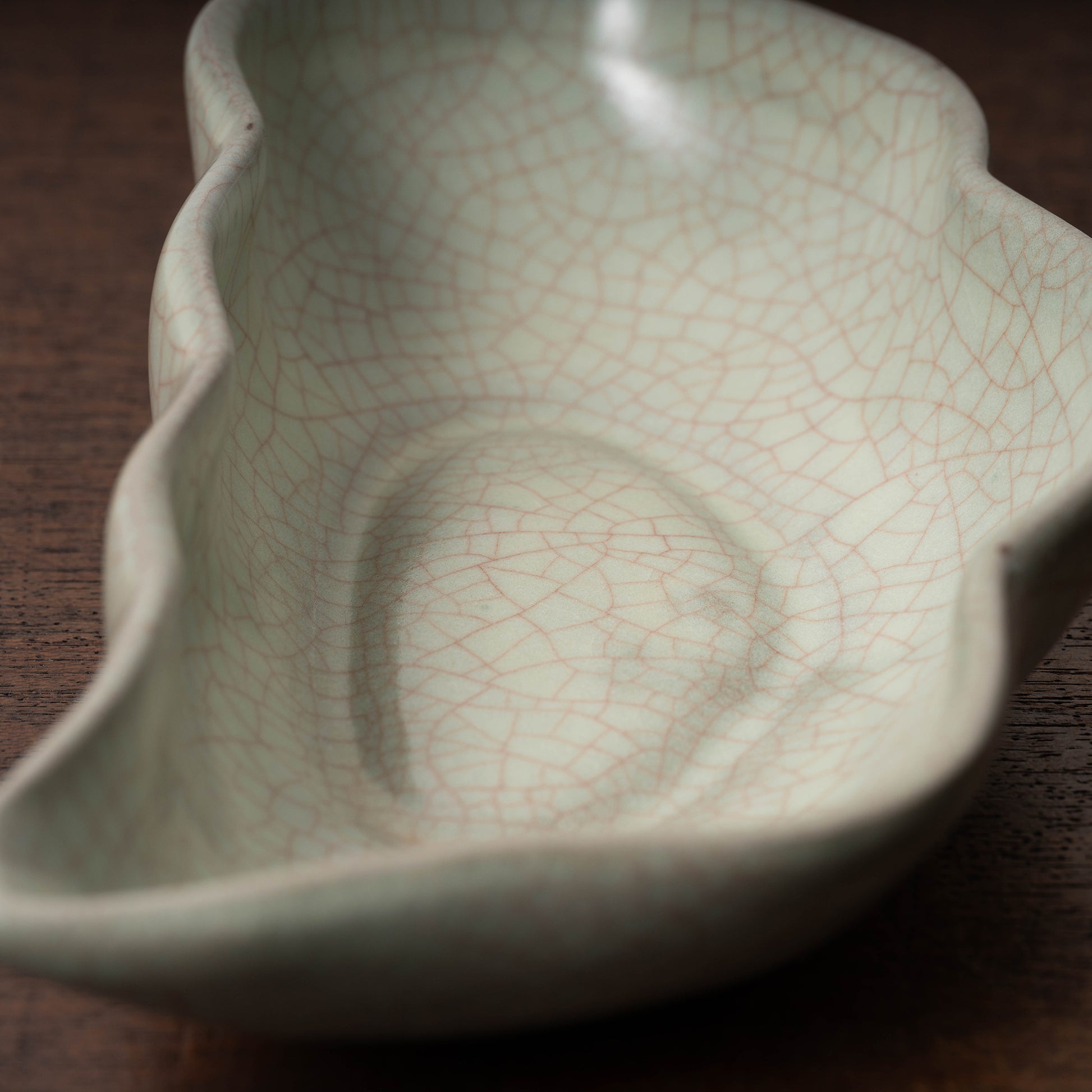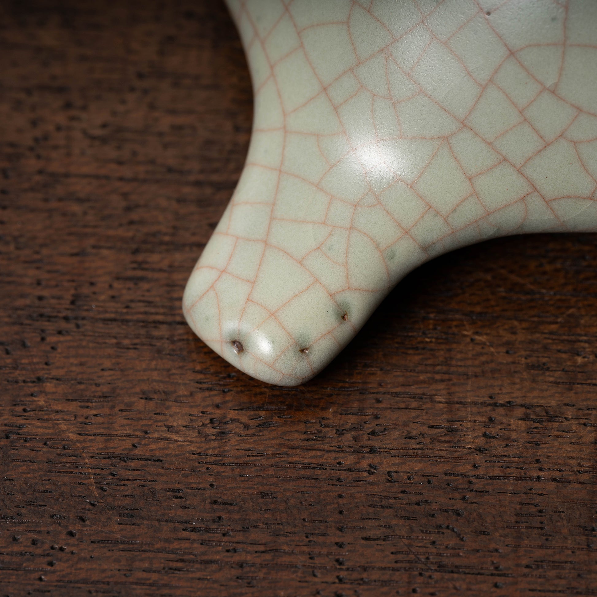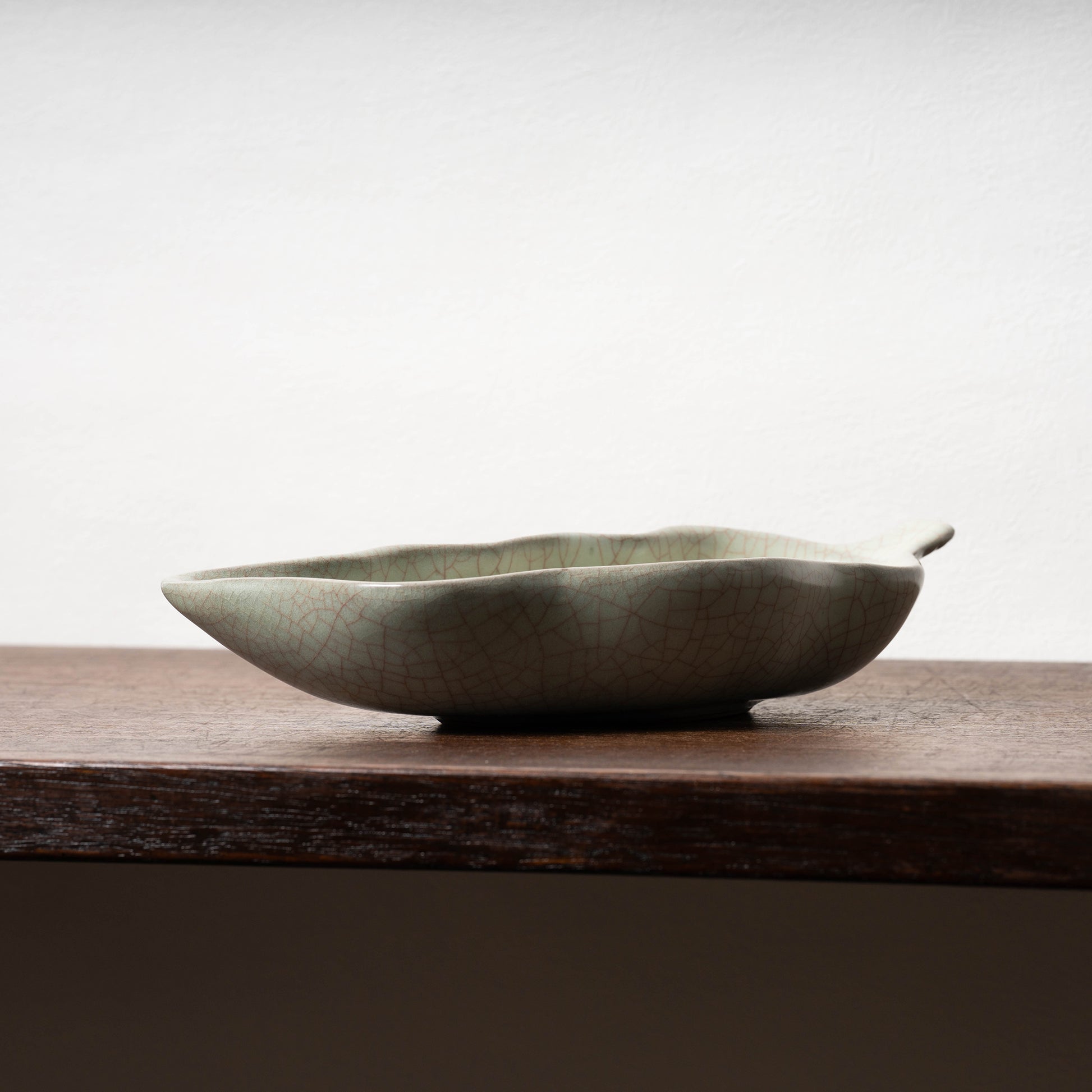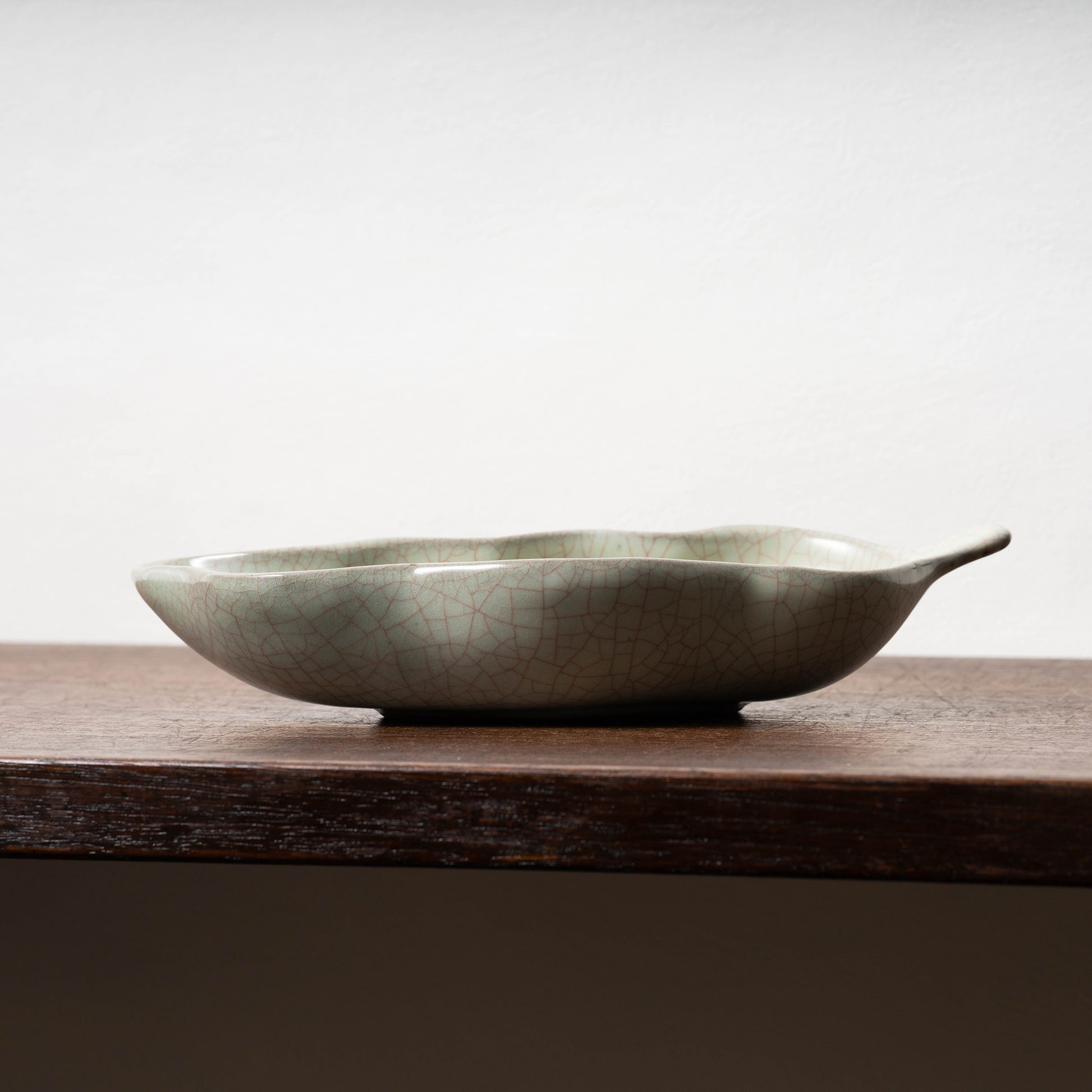 全体には宋代哥窯に倣った哥釉掛かり、柔らかな淡い緑色の釉調です。