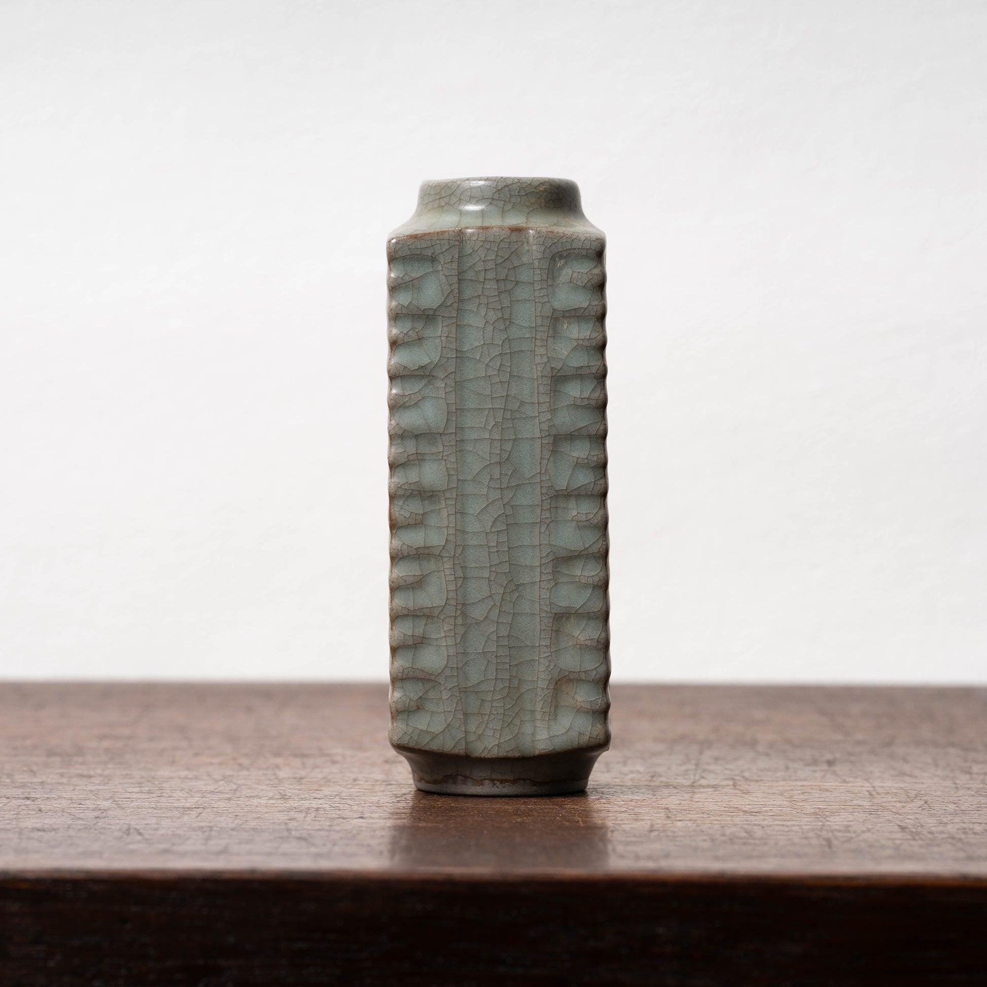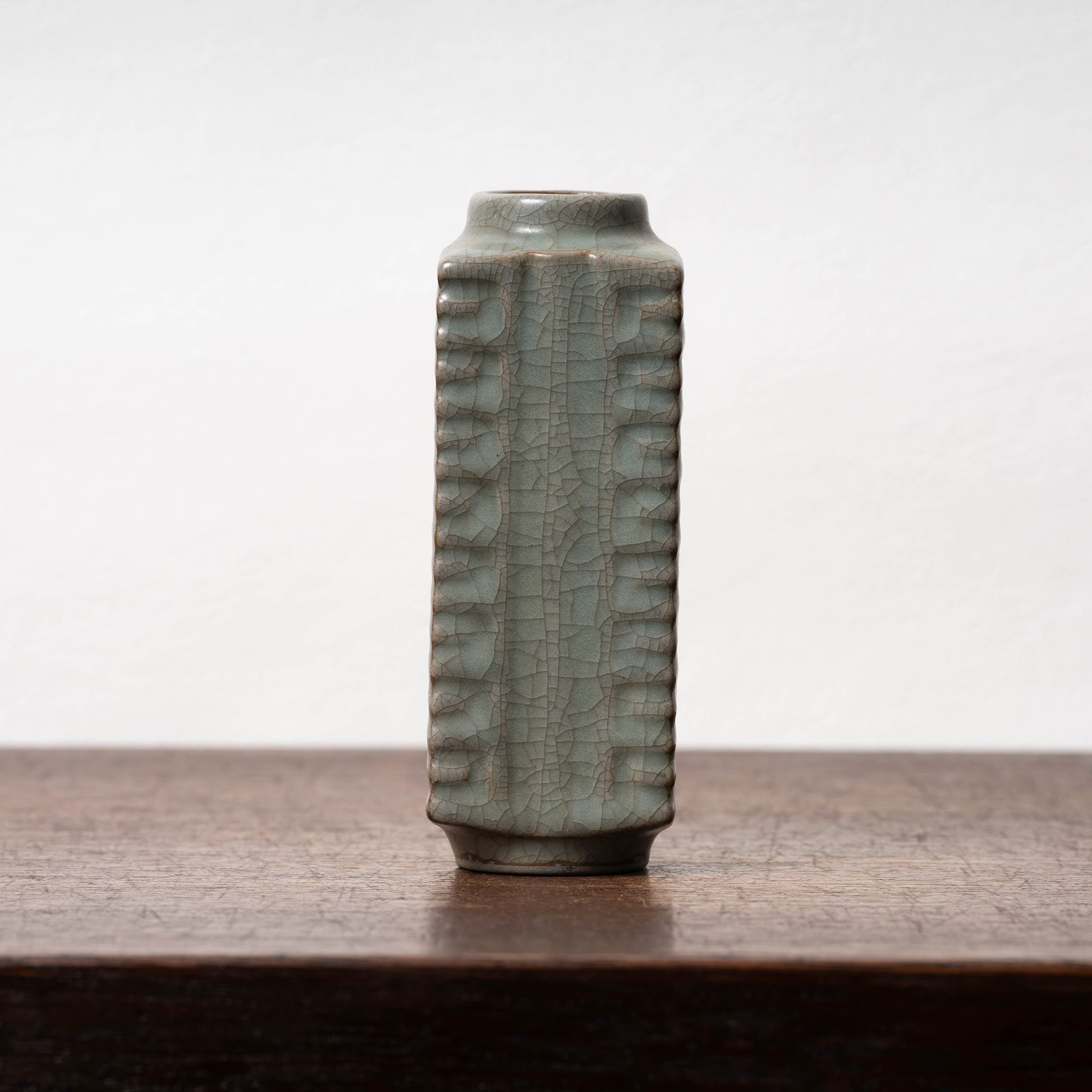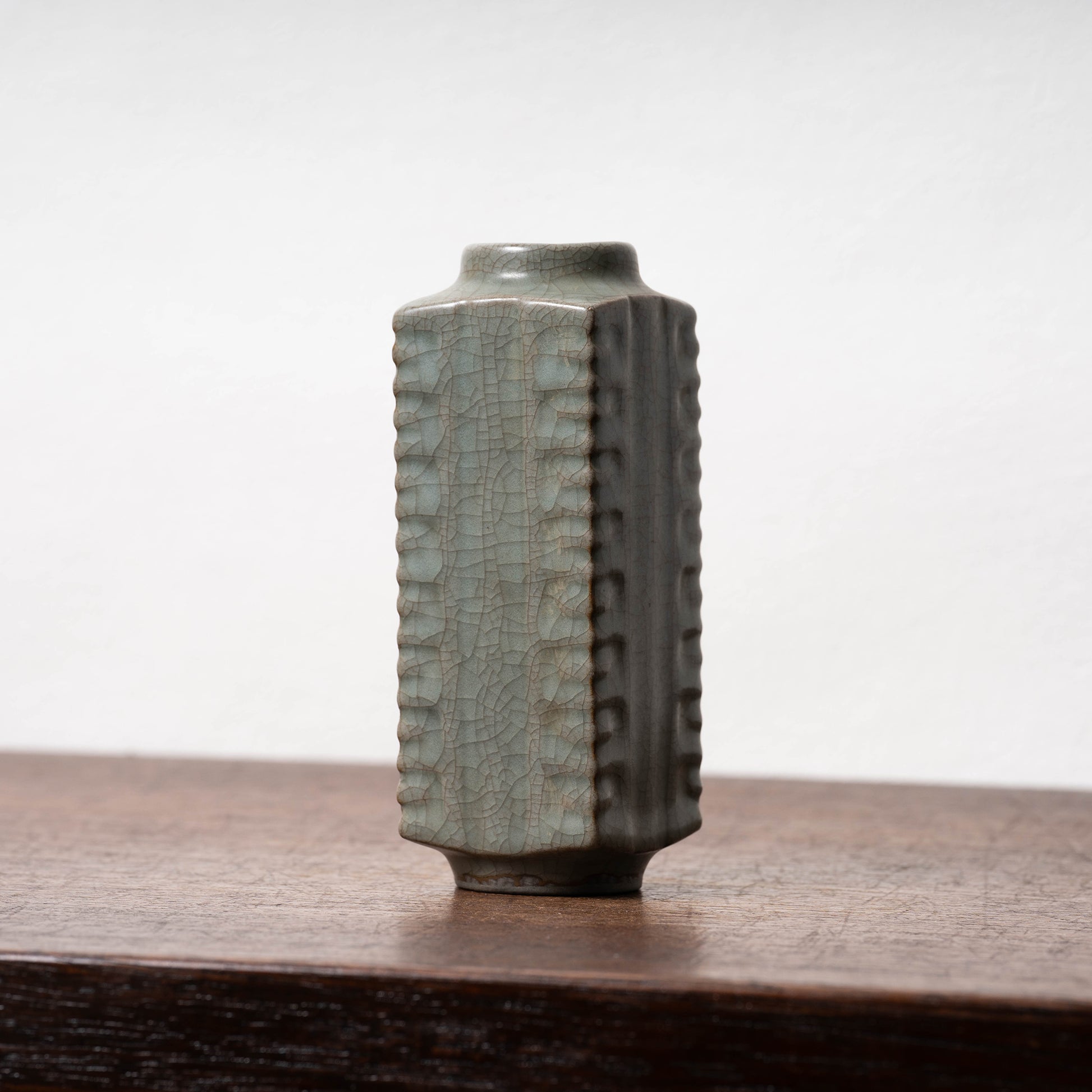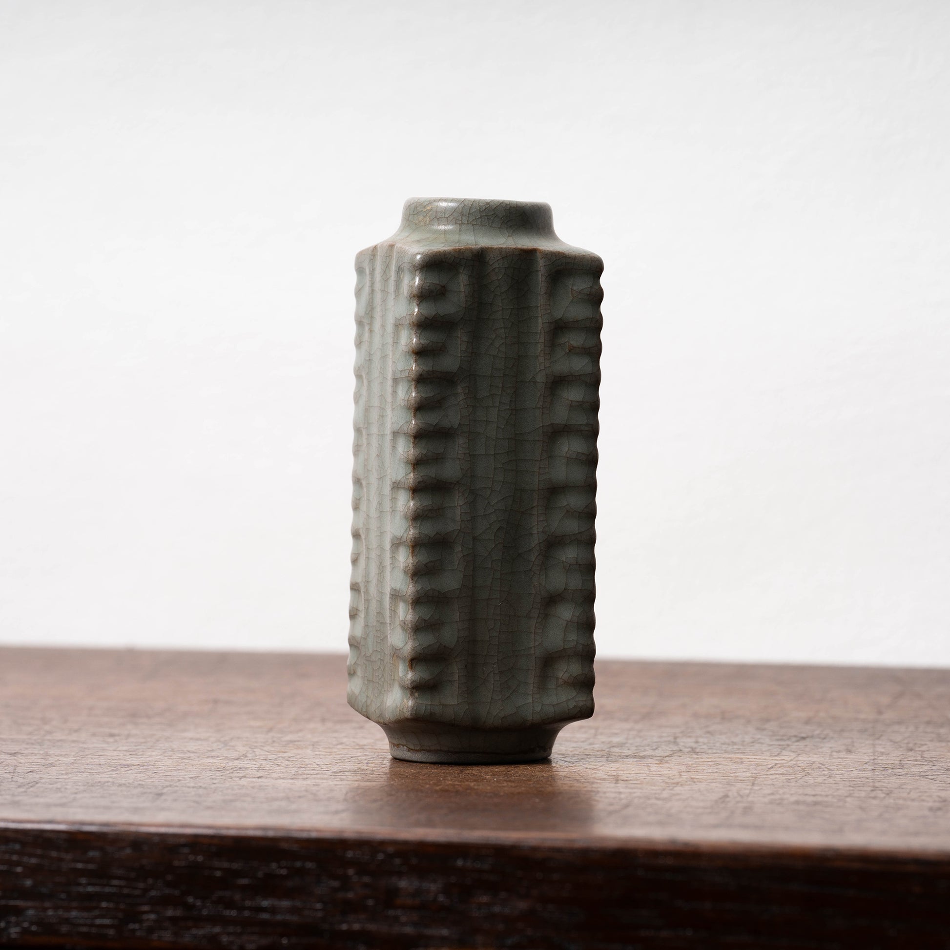 この形は瓶は玉器の琮(そう)を模しており、元々は石を削ってつくられた品です。