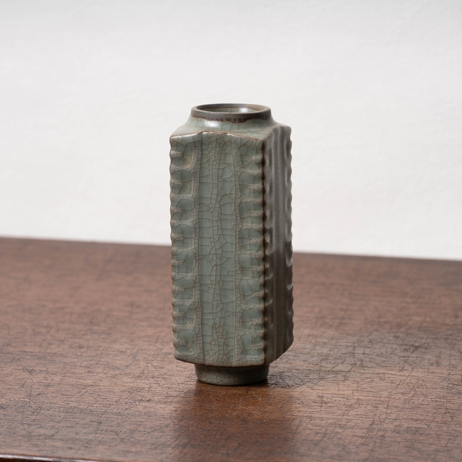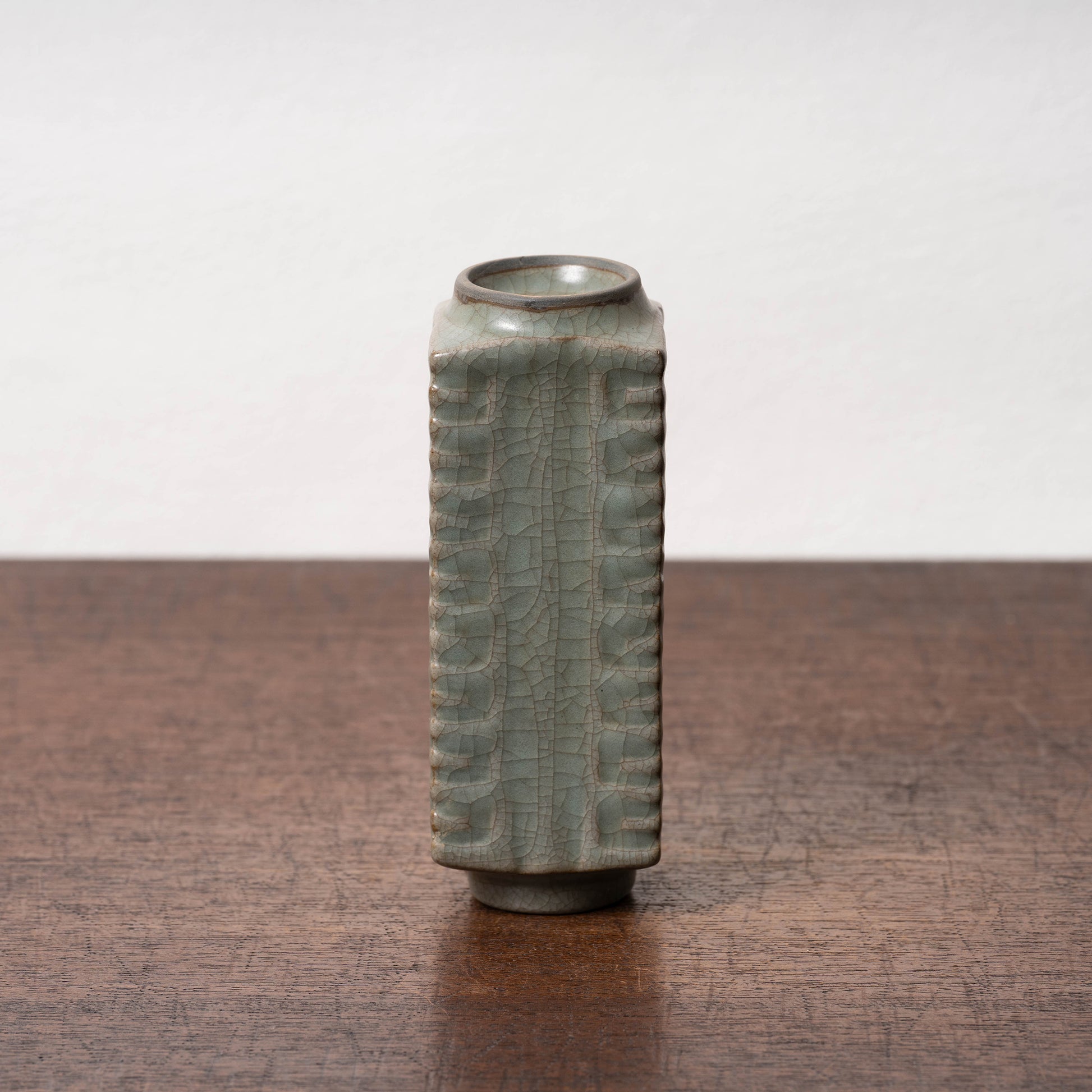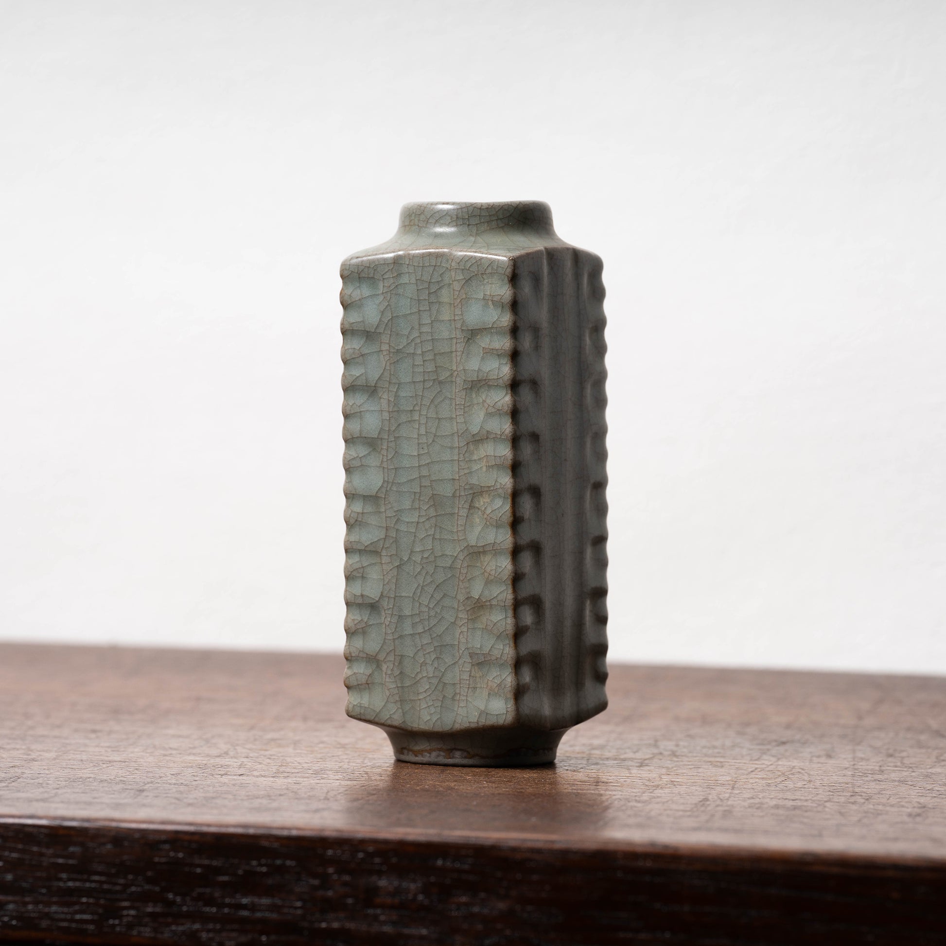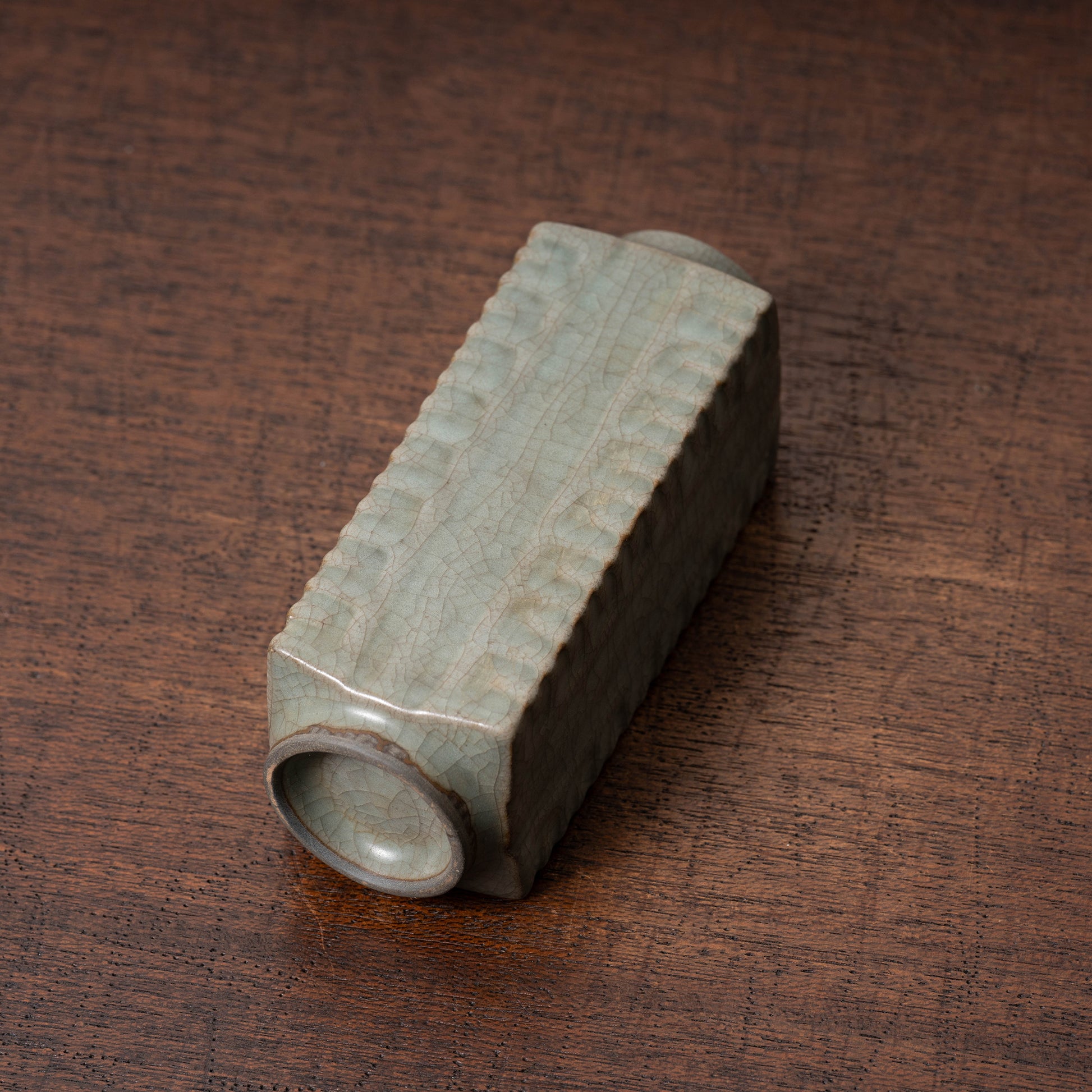 この形は瓶は玉器の琮(そう)を模しており、元々は石を削ってつくられた品です。