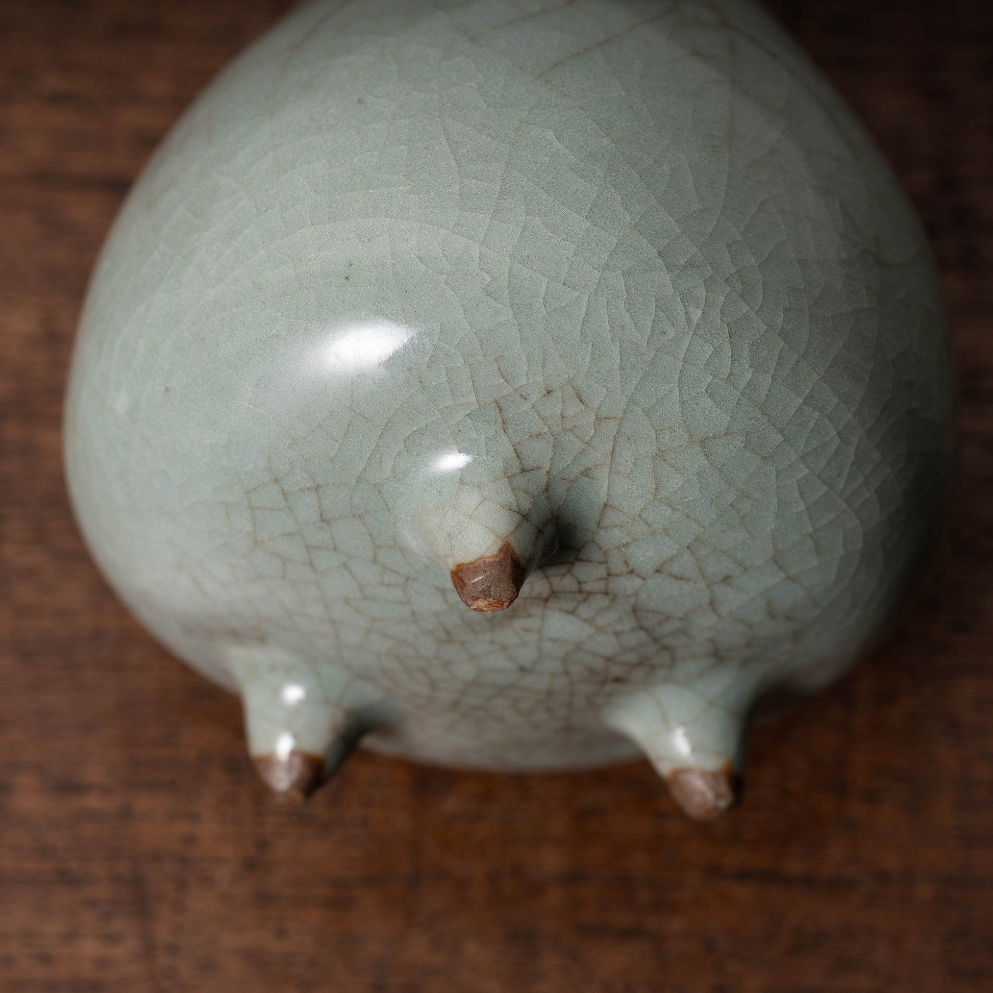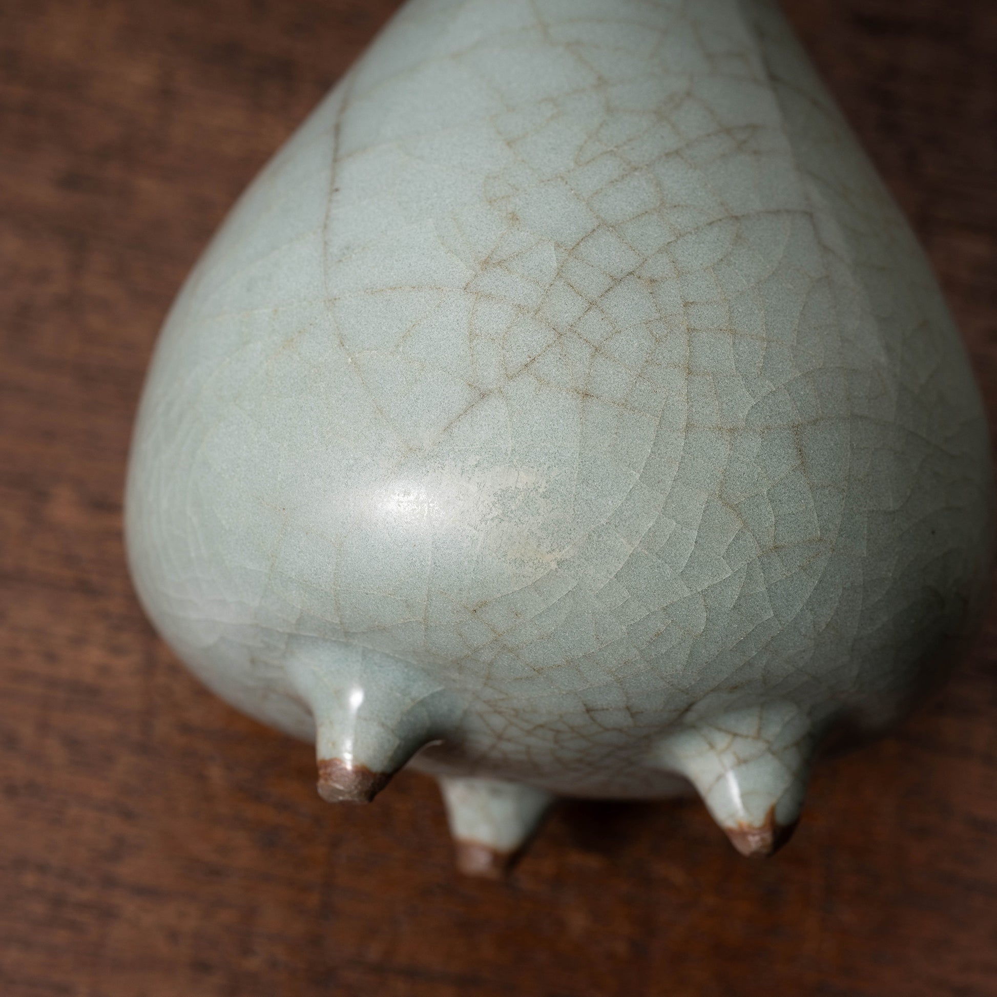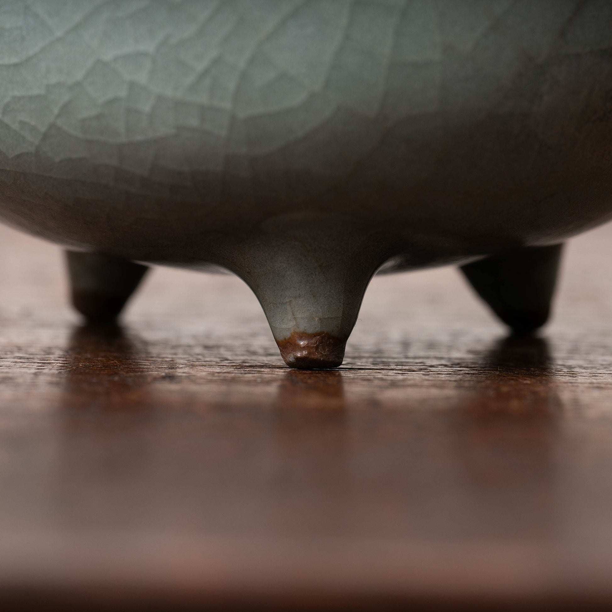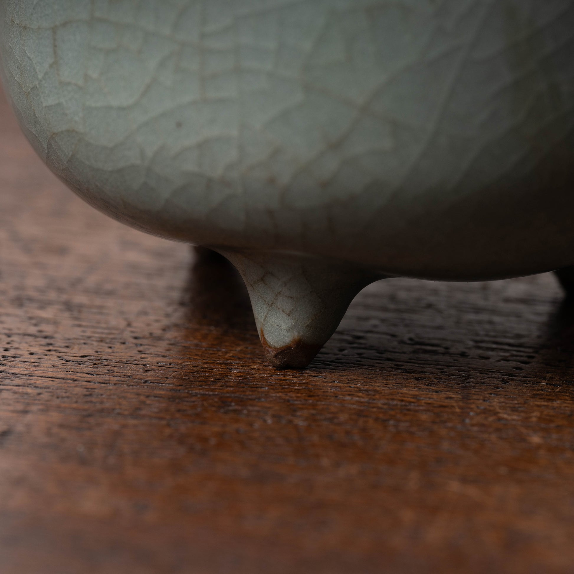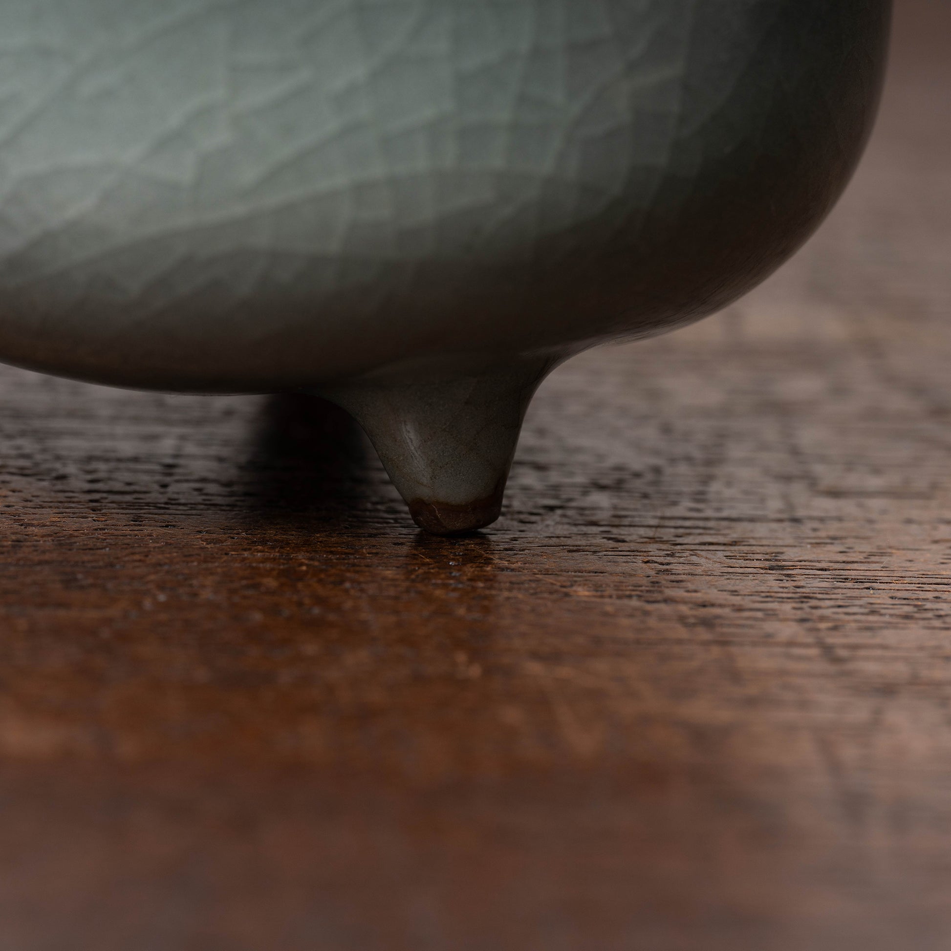 足の根本を露胎し、全体にはやや灰色がかった南宋官窯独特の青磁釉が掛けられます。