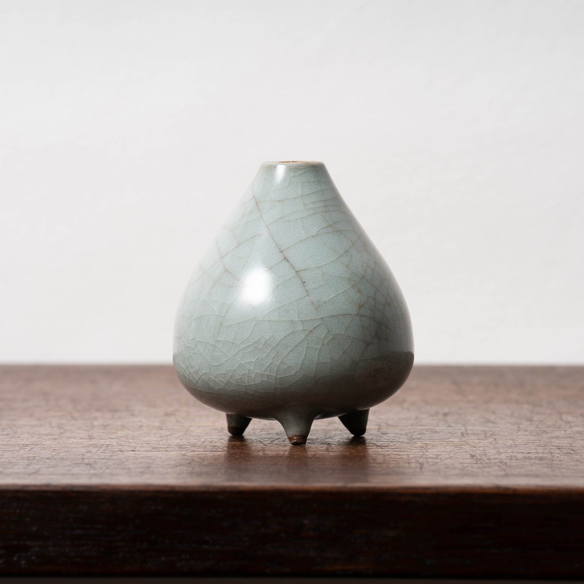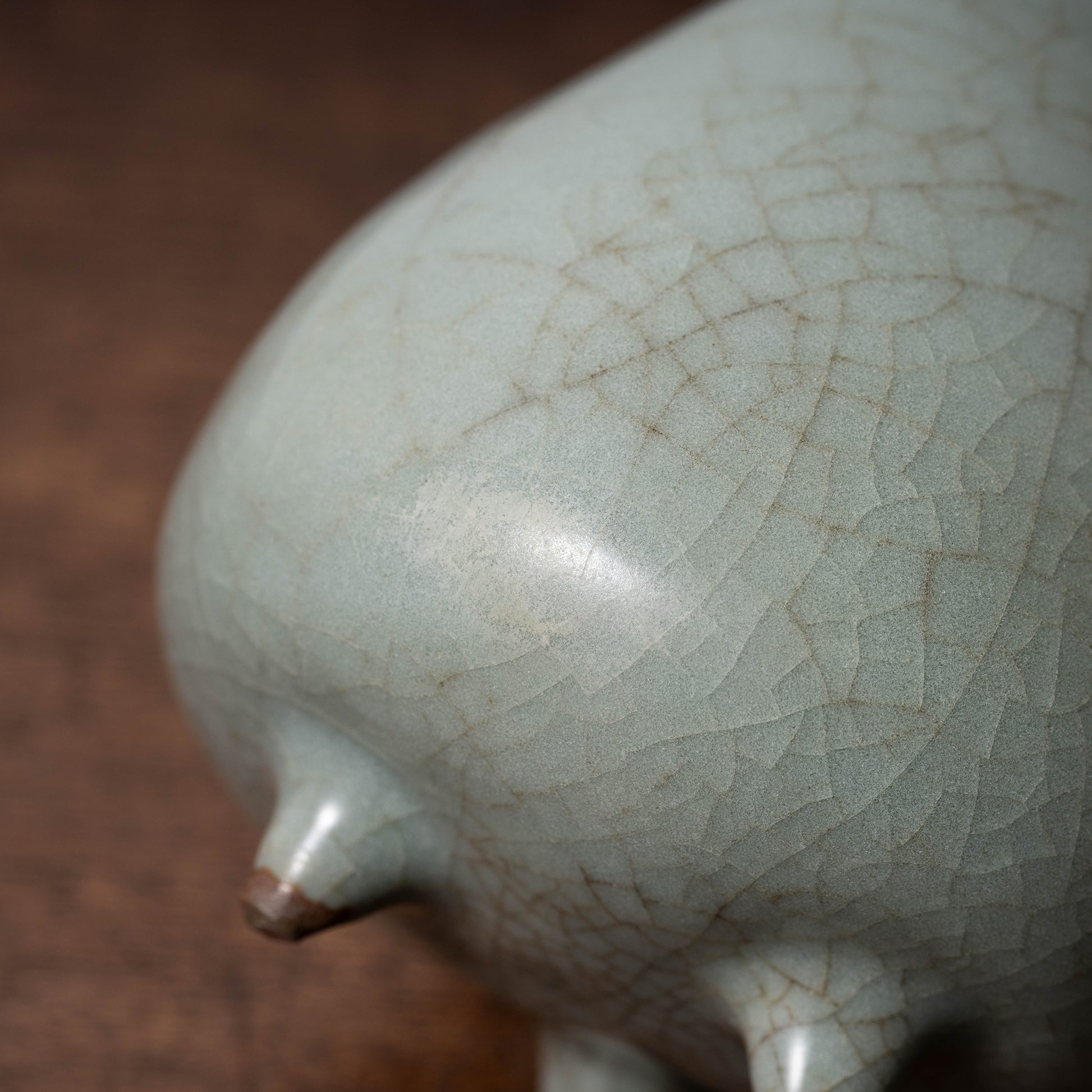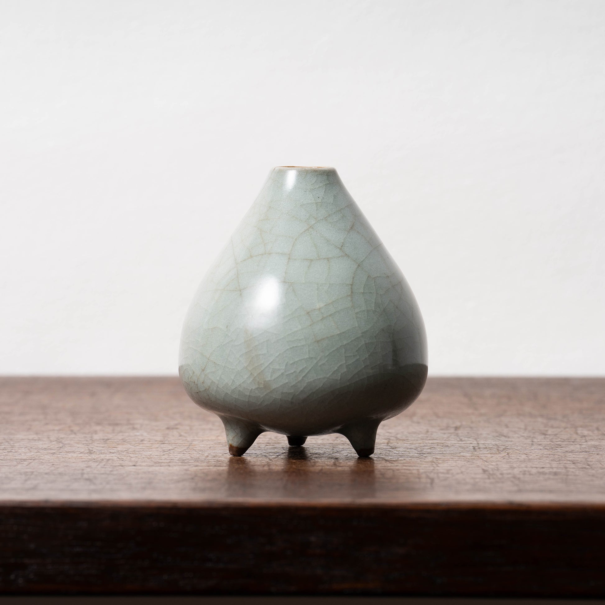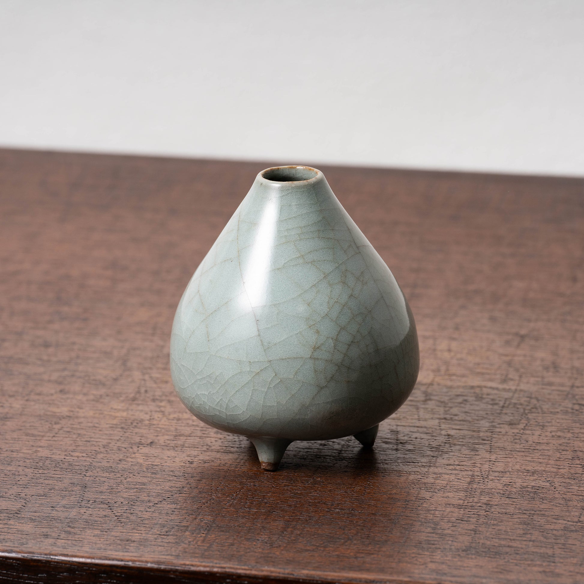 足の根本を露胎し、全体にはやや灰色がかった南宋官窯独特の青磁釉が掛けられます。
