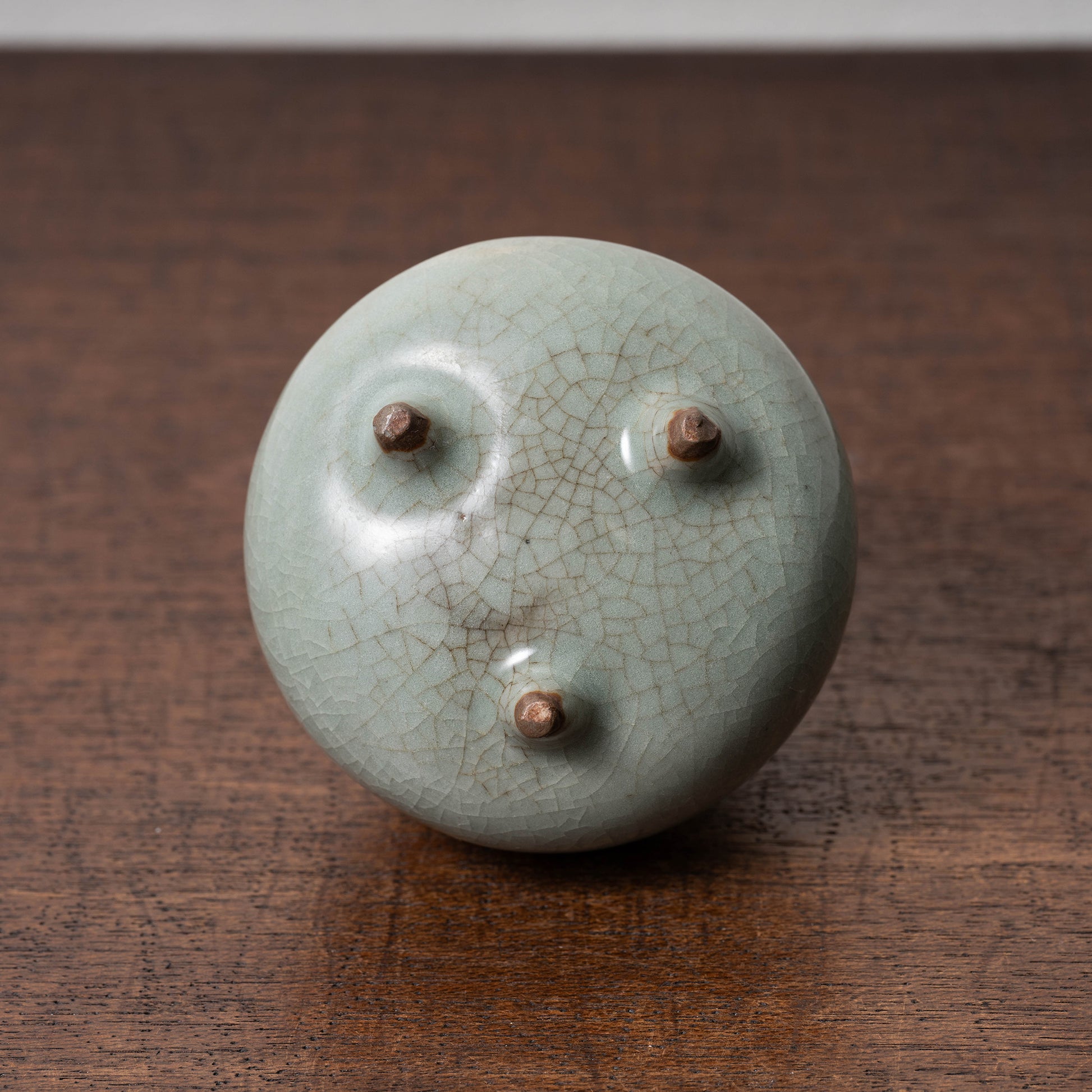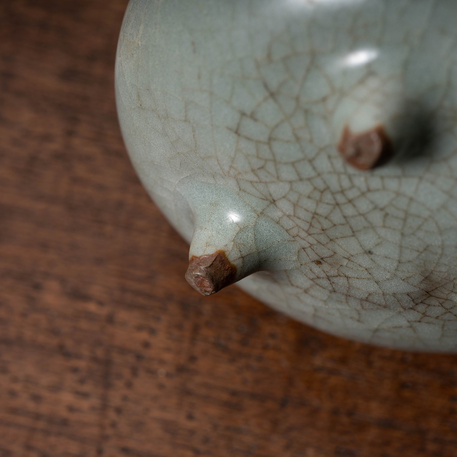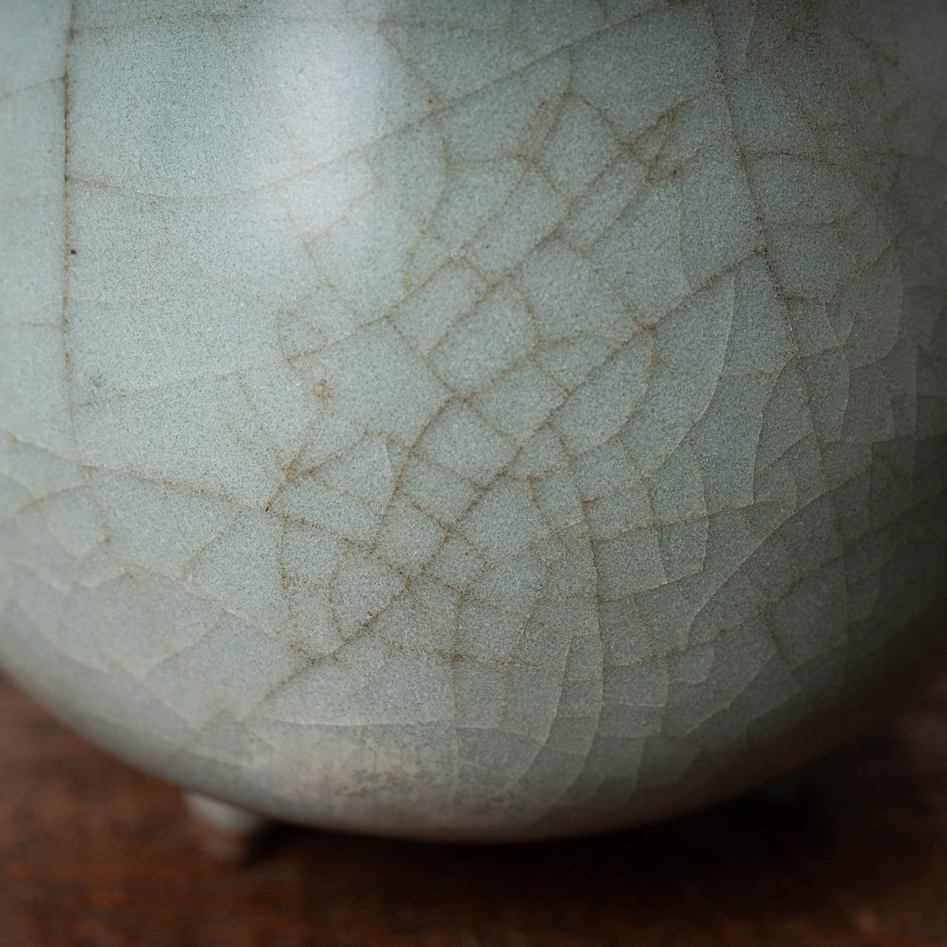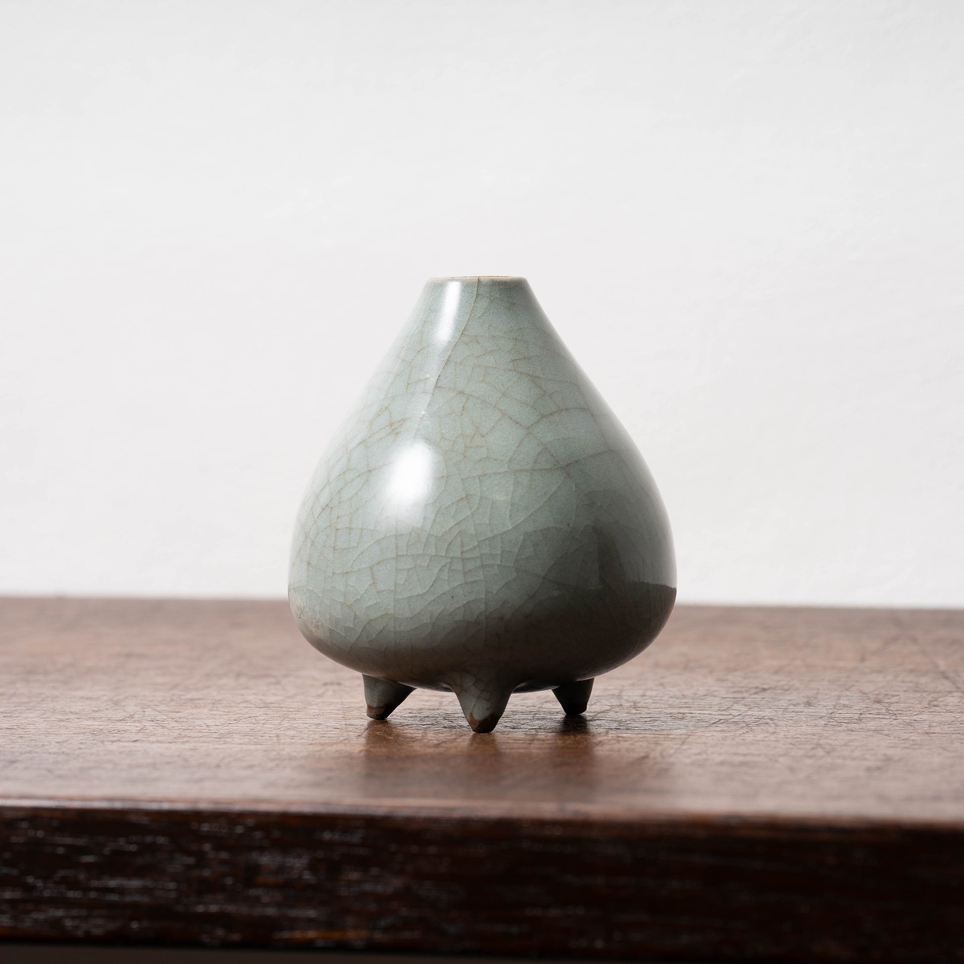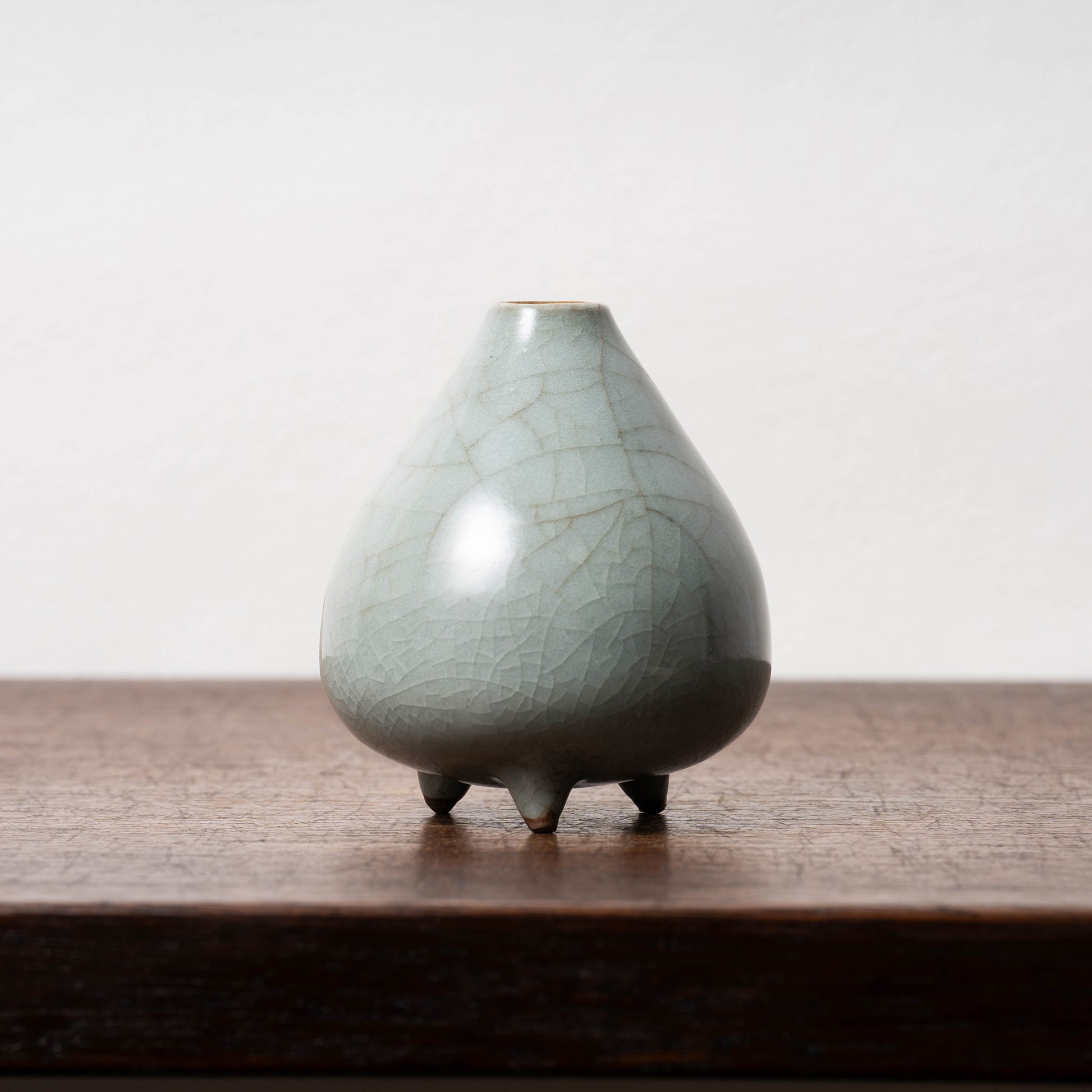 足の根本を露胎し、全体にはやや灰色がかった南宋官窯独特の青磁釉が掛けられます。