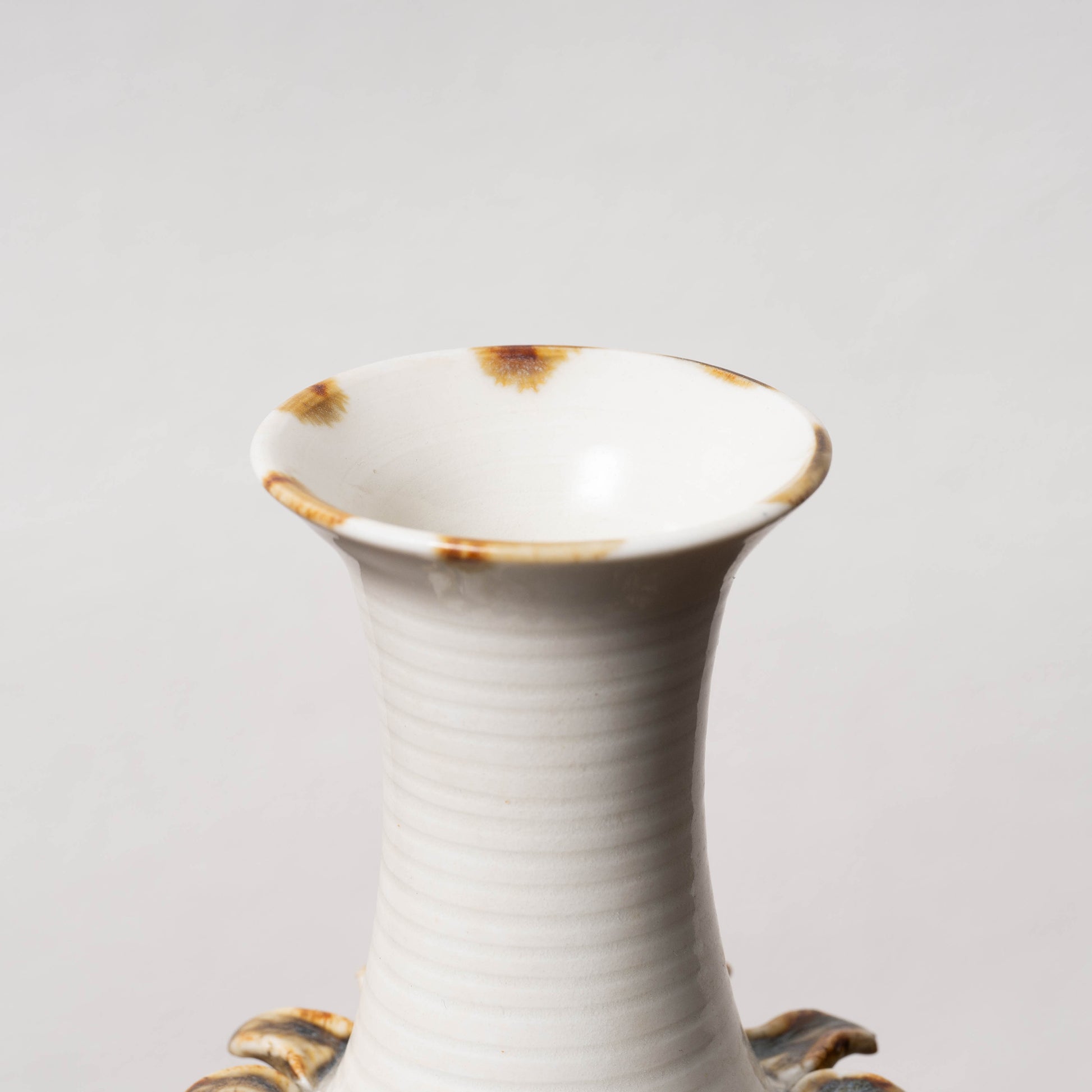 胴や口の鉄斑、器形や頸の線文、そして葉の装飾が一体となり、まるで植物そのもののような雰囲気です。