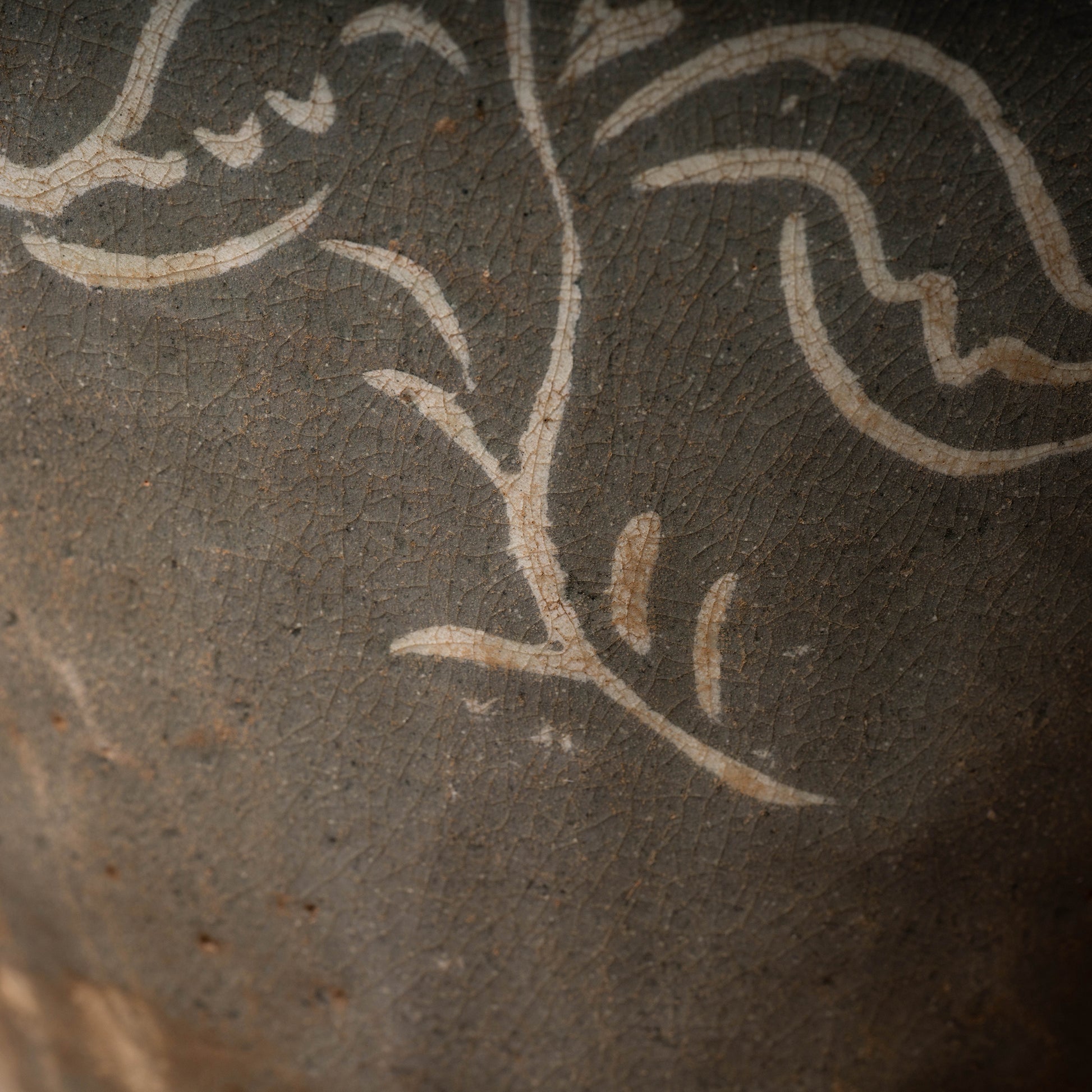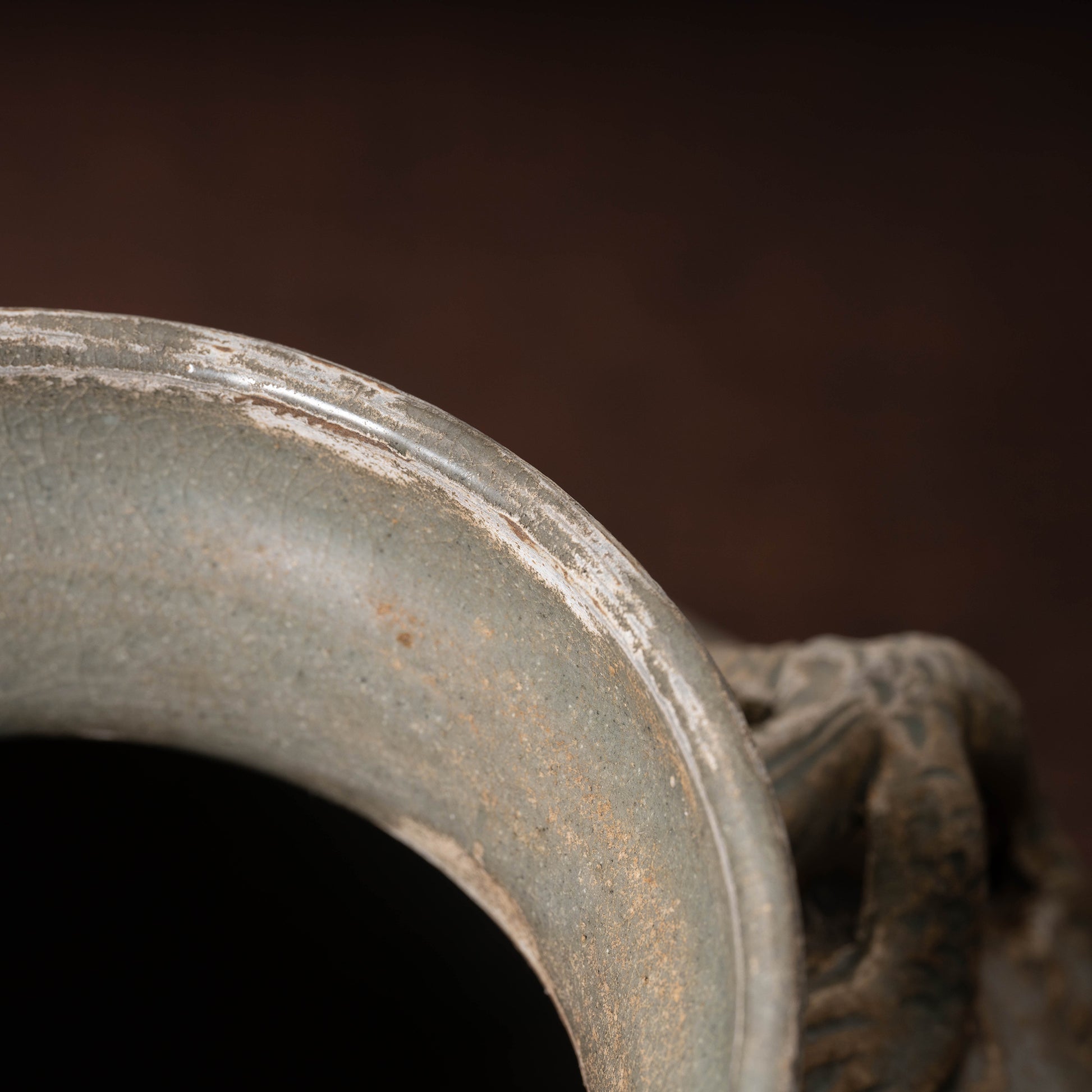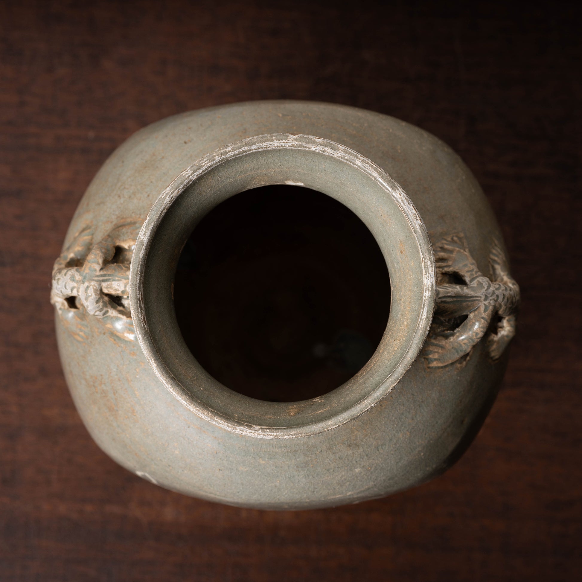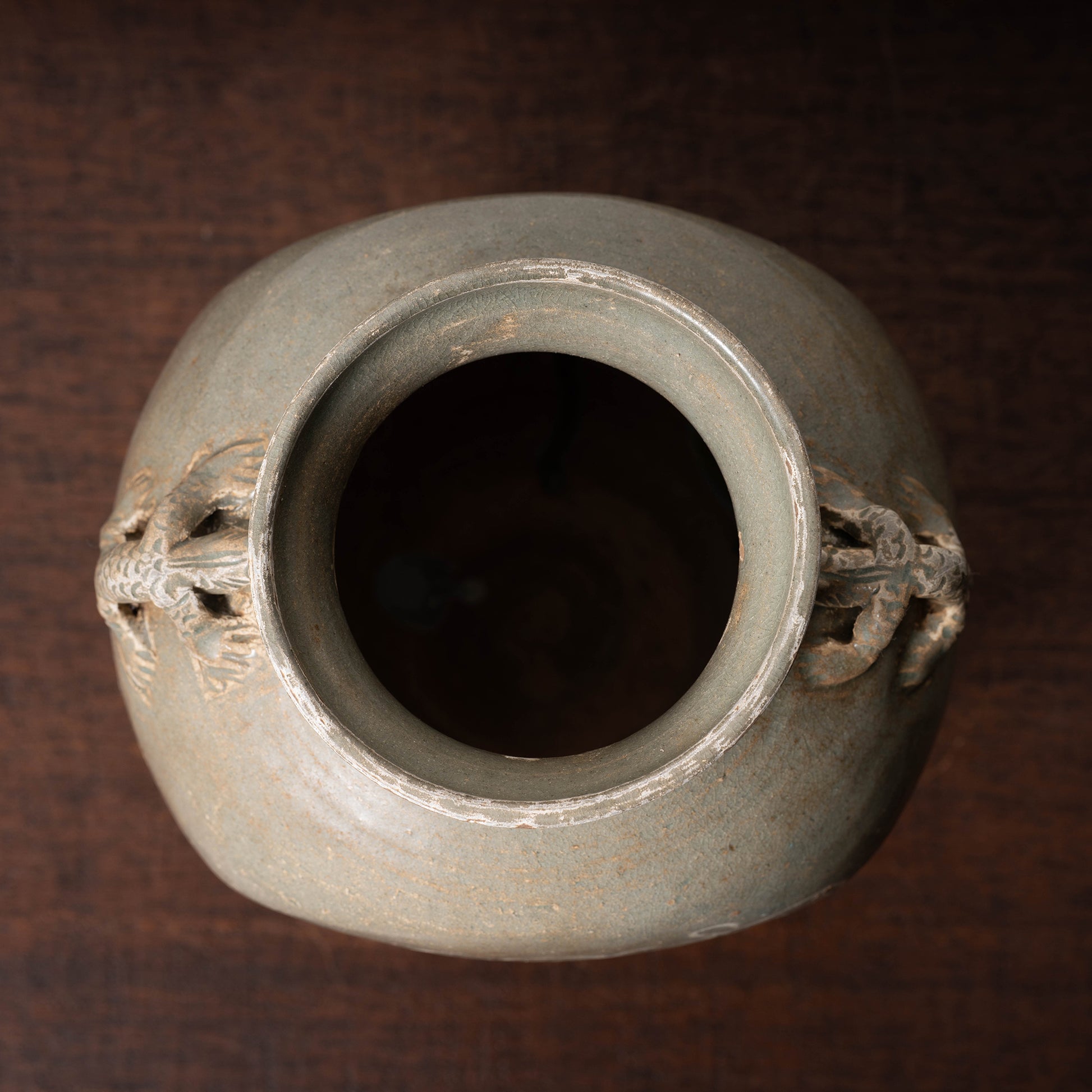 扁壺形状、獣耳、凛とした草花文がとてもバランスよく配置され、釉調も相まってとても高潔さを感じる品です。