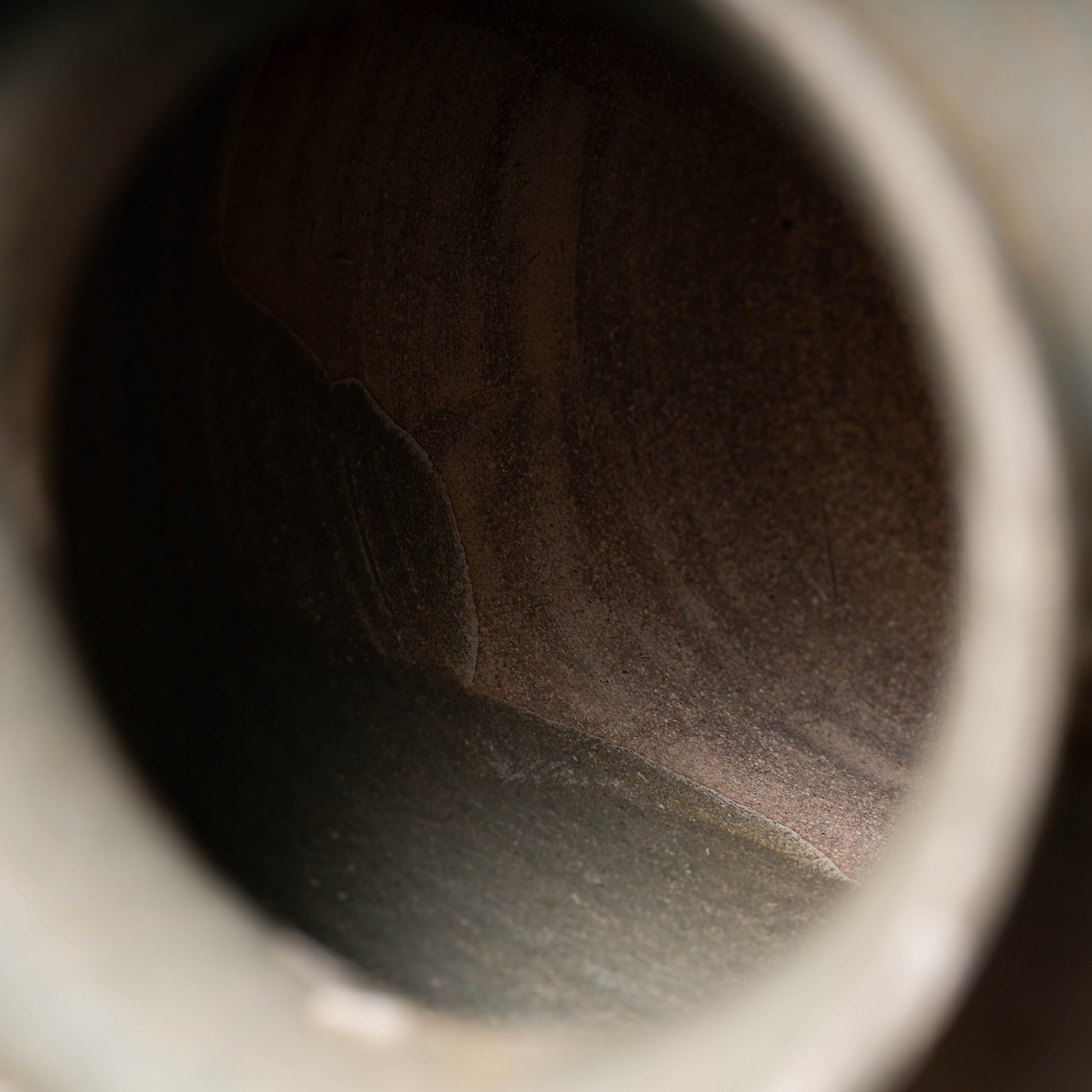 外面全体には灰青色の青磁釉が掛り、内側も上から3分の2くらいまで掛かります。