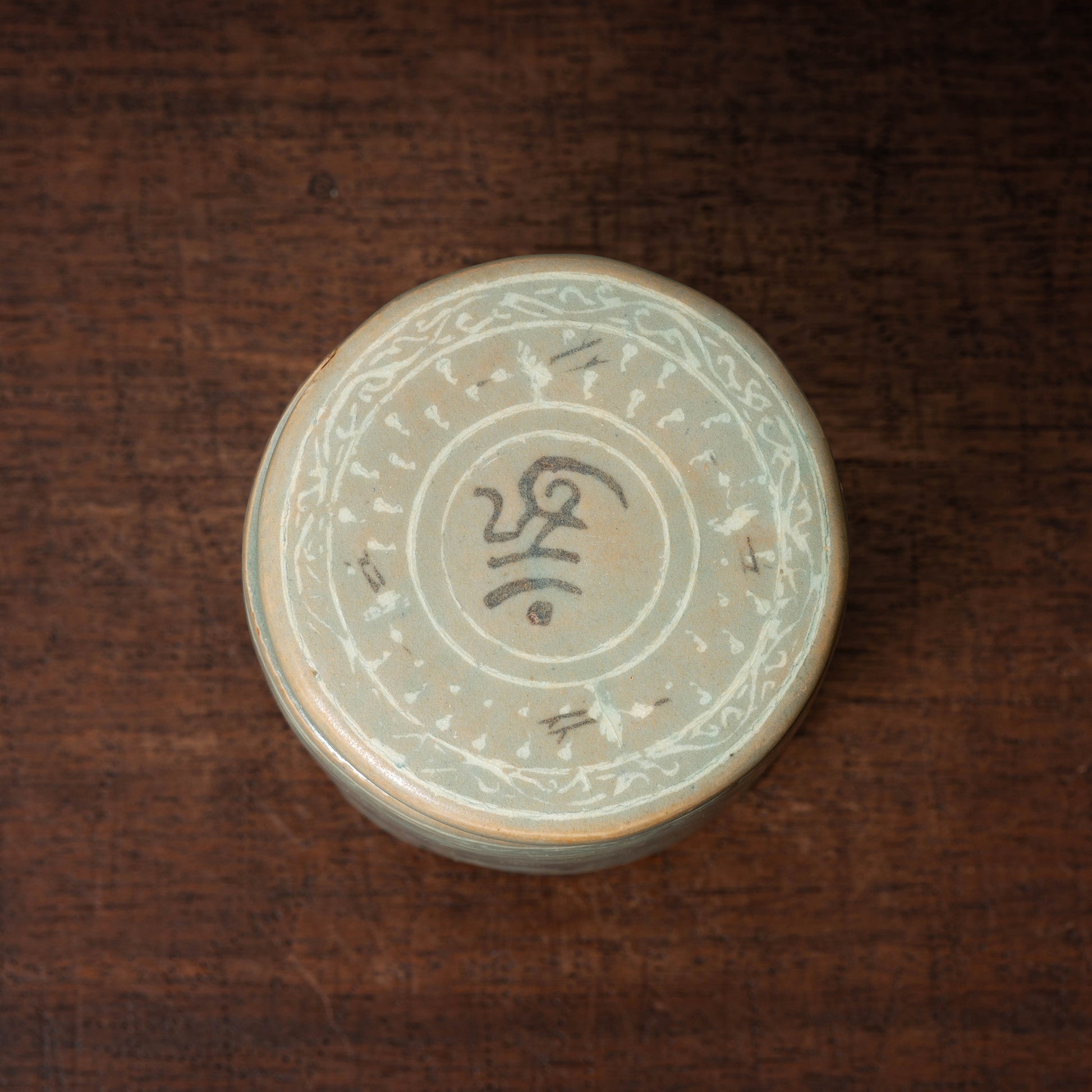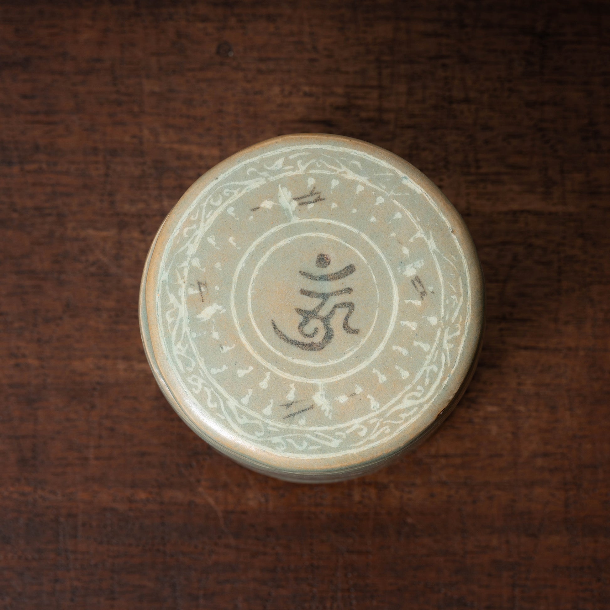胴と蓋の中央には白黒象嵌が施され、中でも珍しい梵字模様が2種類描かれます。