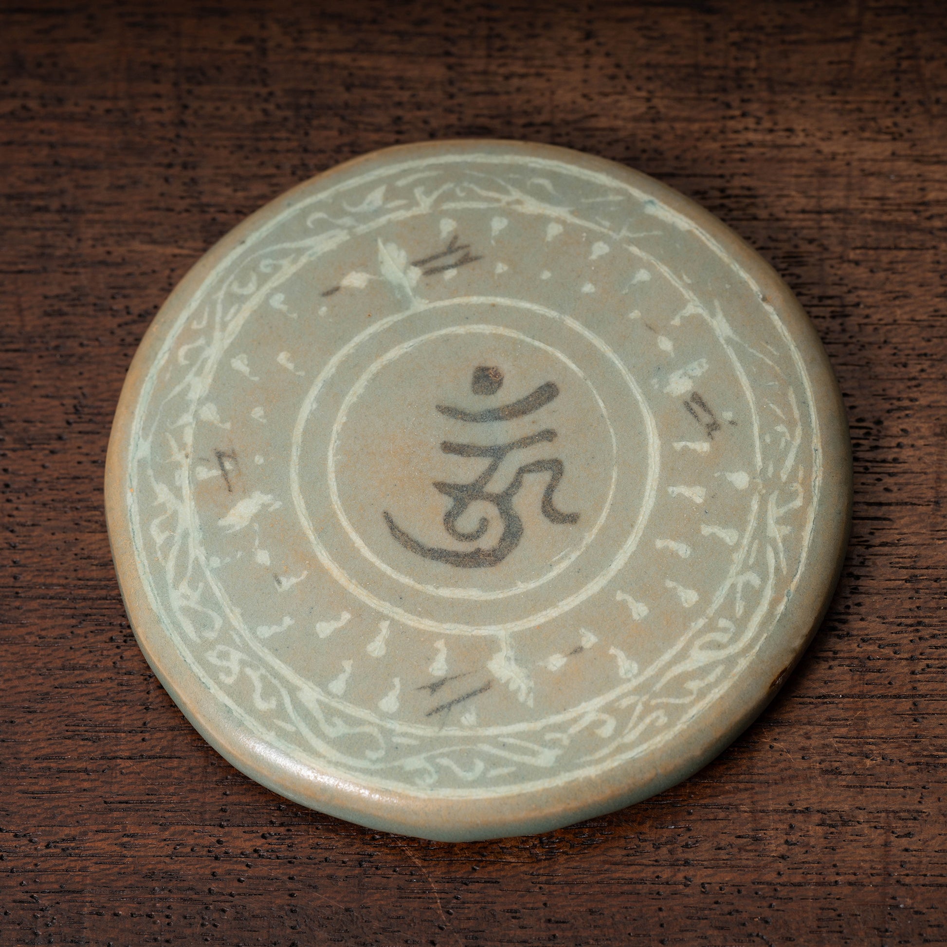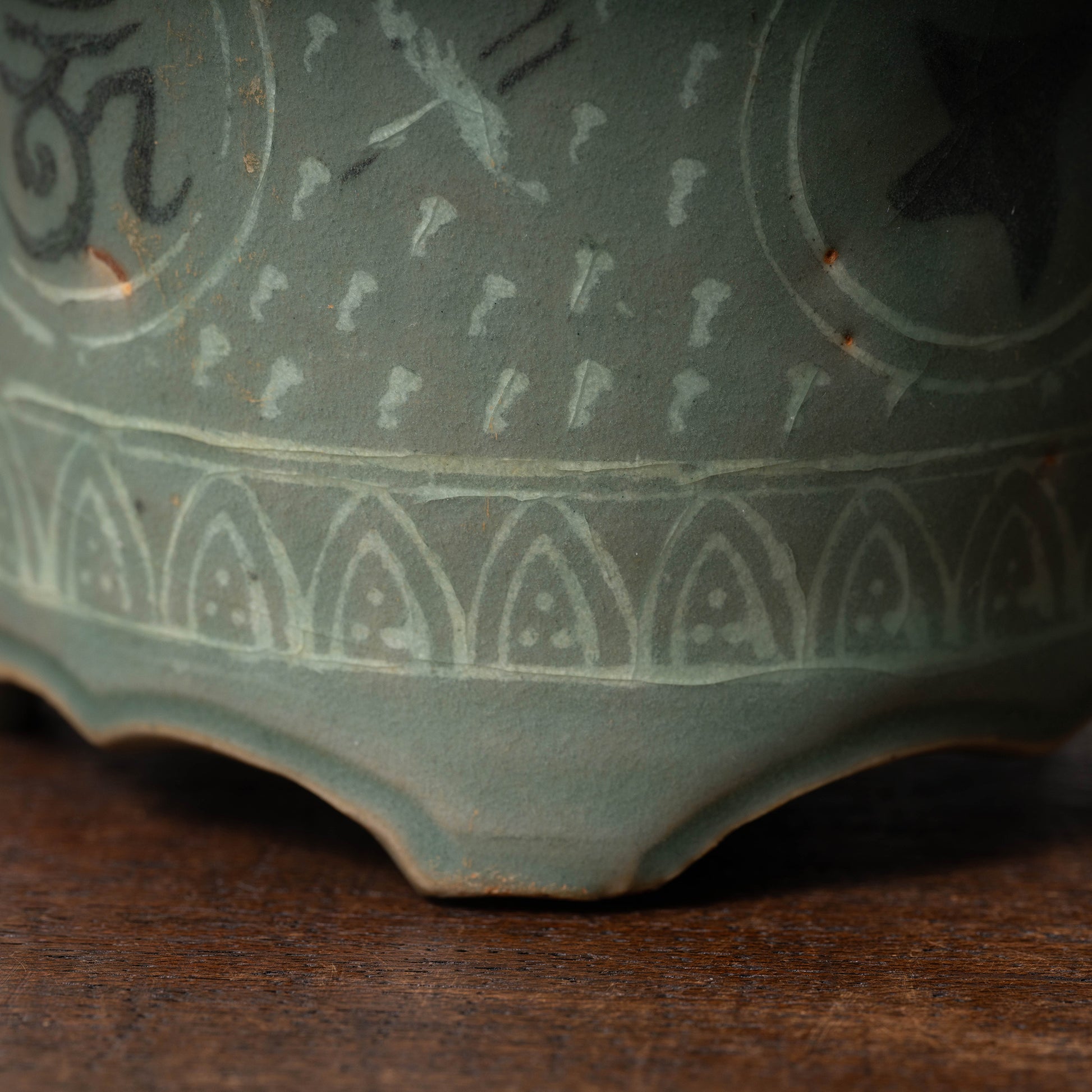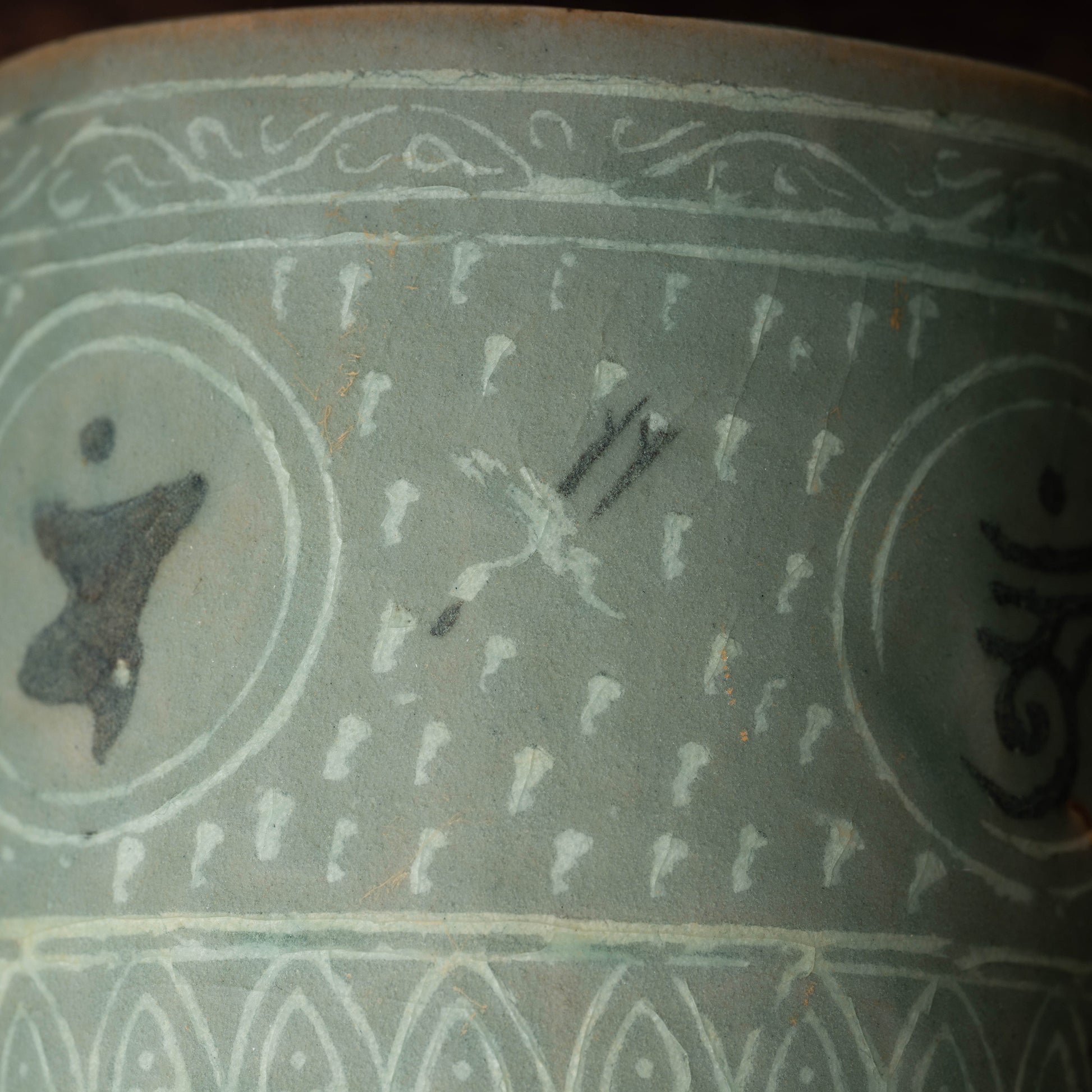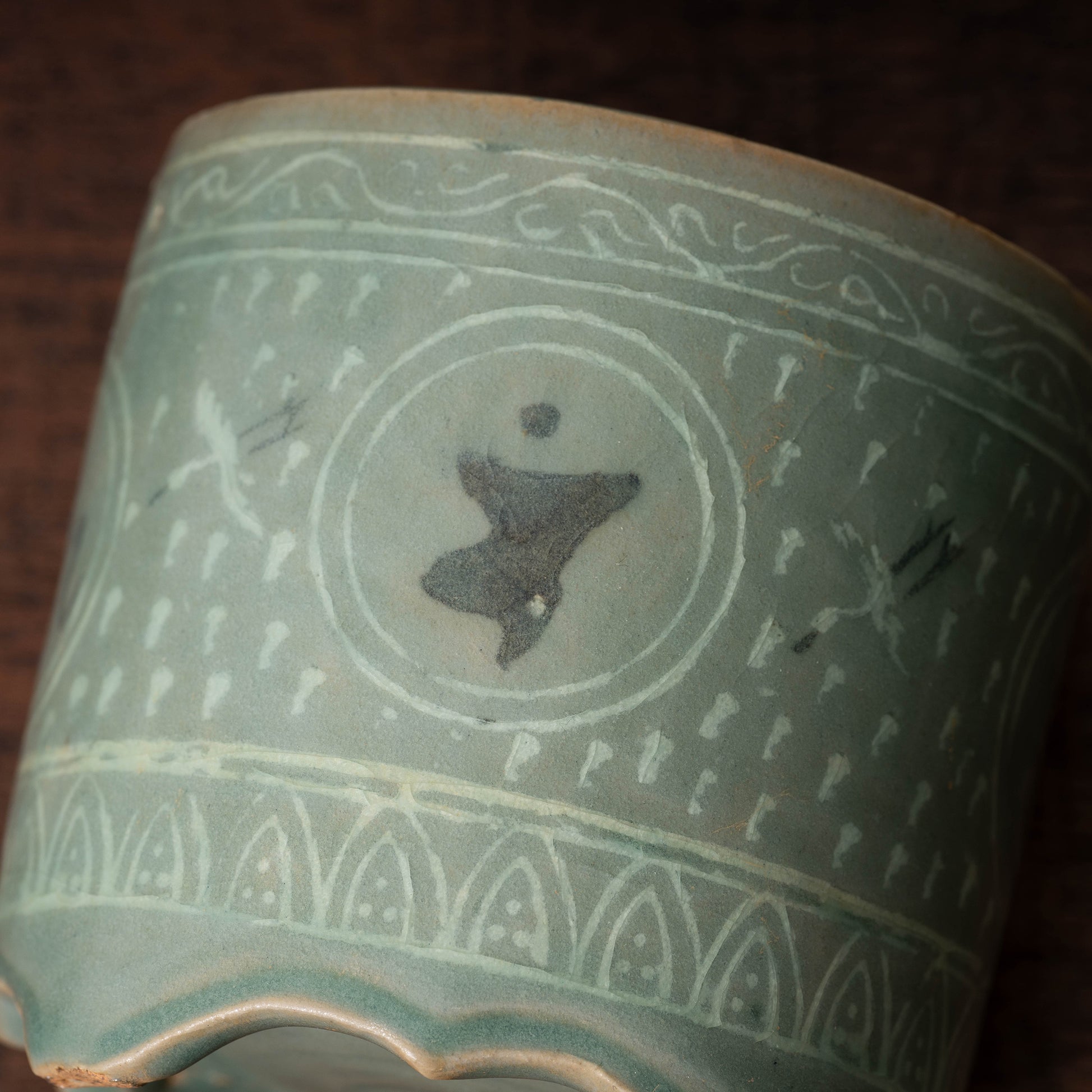 高麗時代には瓦や青銅器に使用された遺例はありますが、青磁象嵌に使用されるのは大変珍しいです。