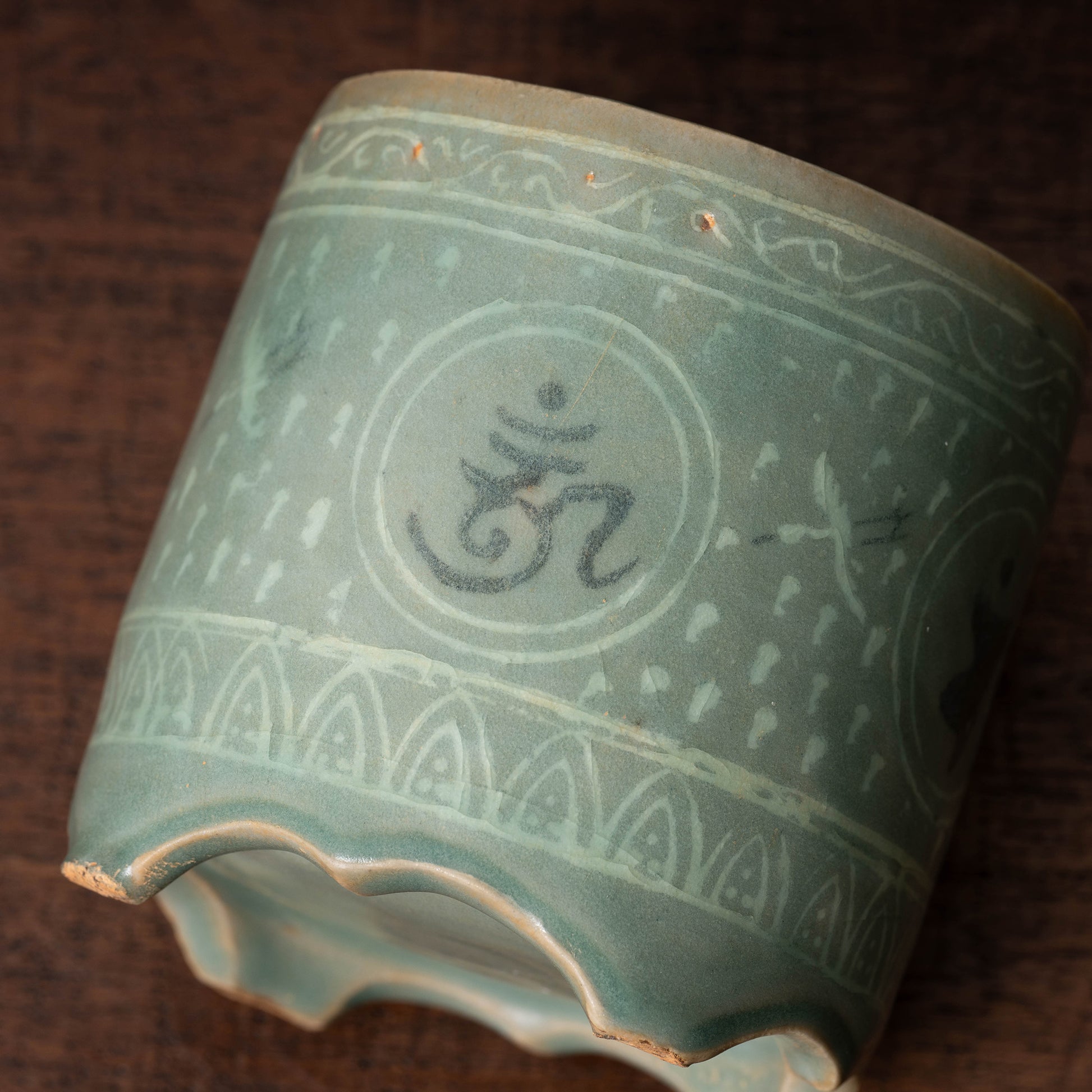 インドはイスラーム政権の出現で朝鮮や中国の陶磁器を輸入するようになり、その流れでインドに向けて作られたもの、もしくは朝鮮の仏教徒に向けて作られたものと考えられます。