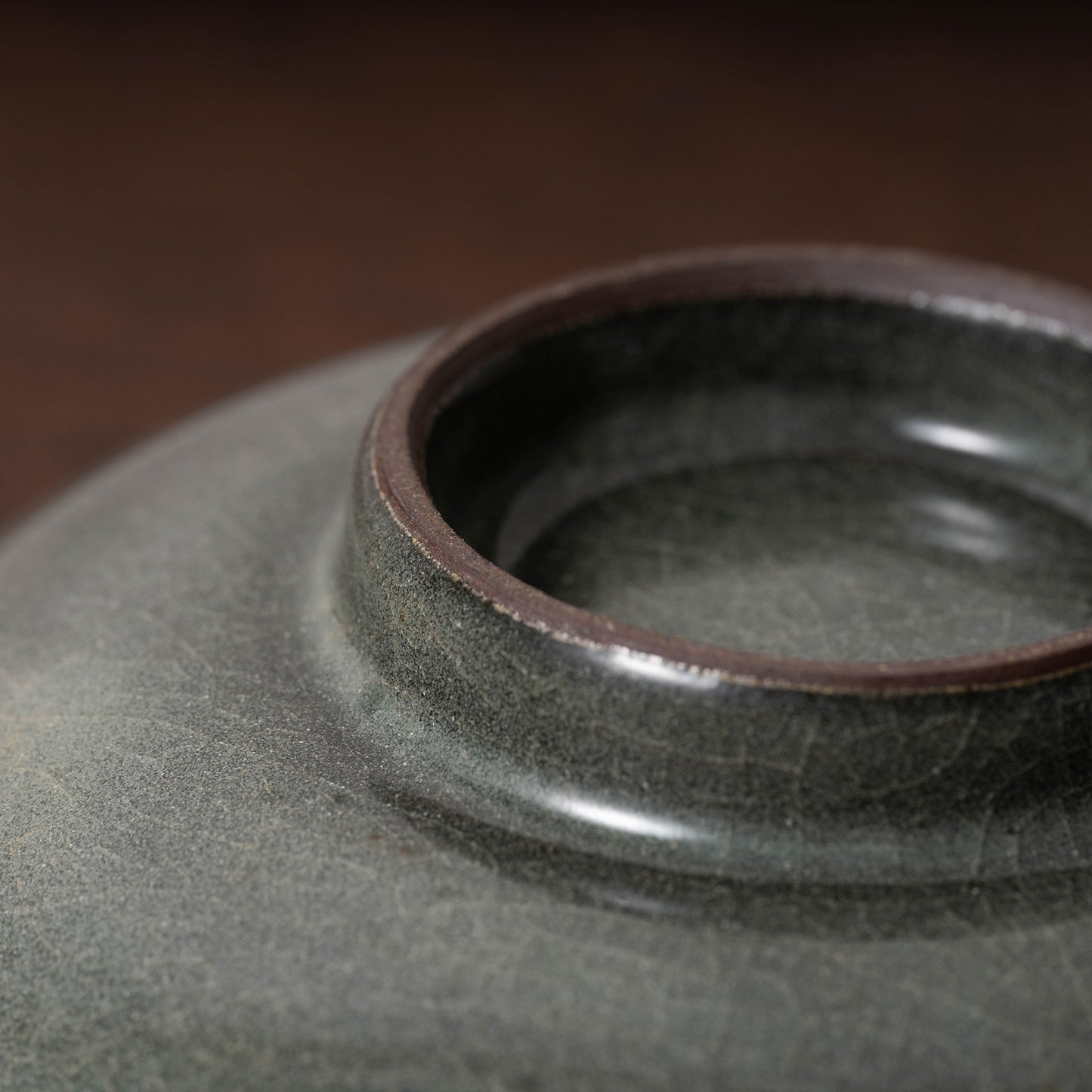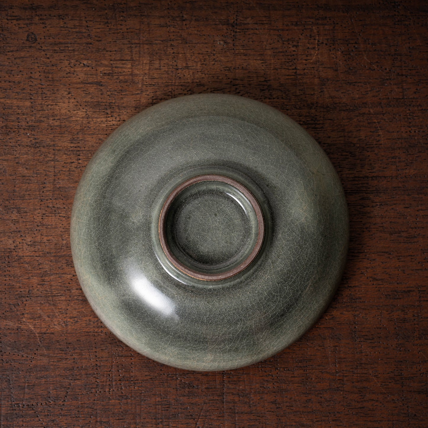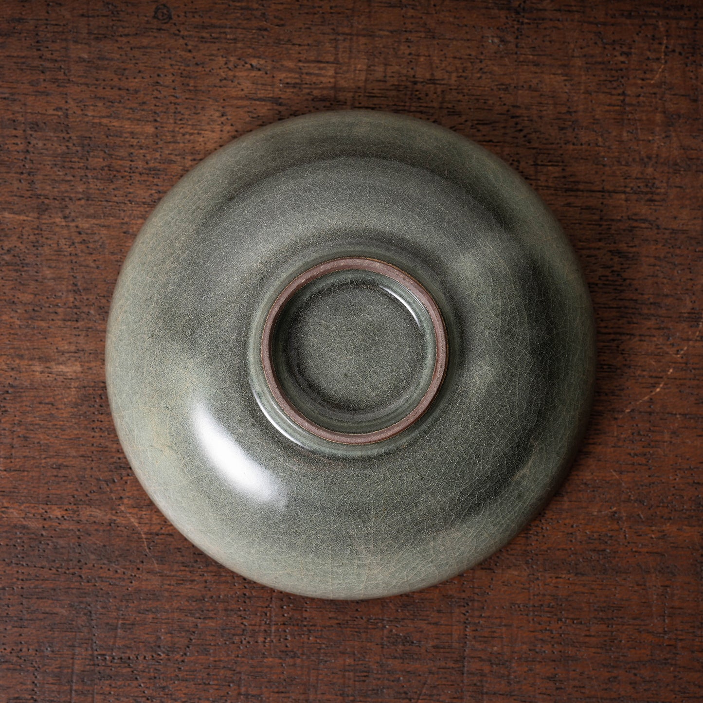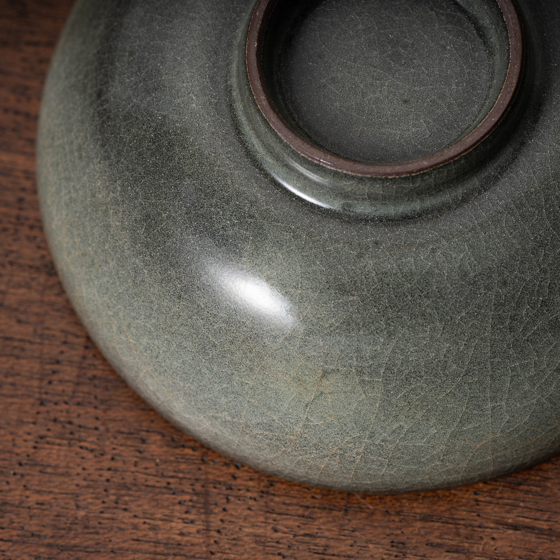鉄分が多く含まれた青磁釉がたっぷり掛けられ、畳付けの際までしっかり施釉される薄胎厚釉の作りです。