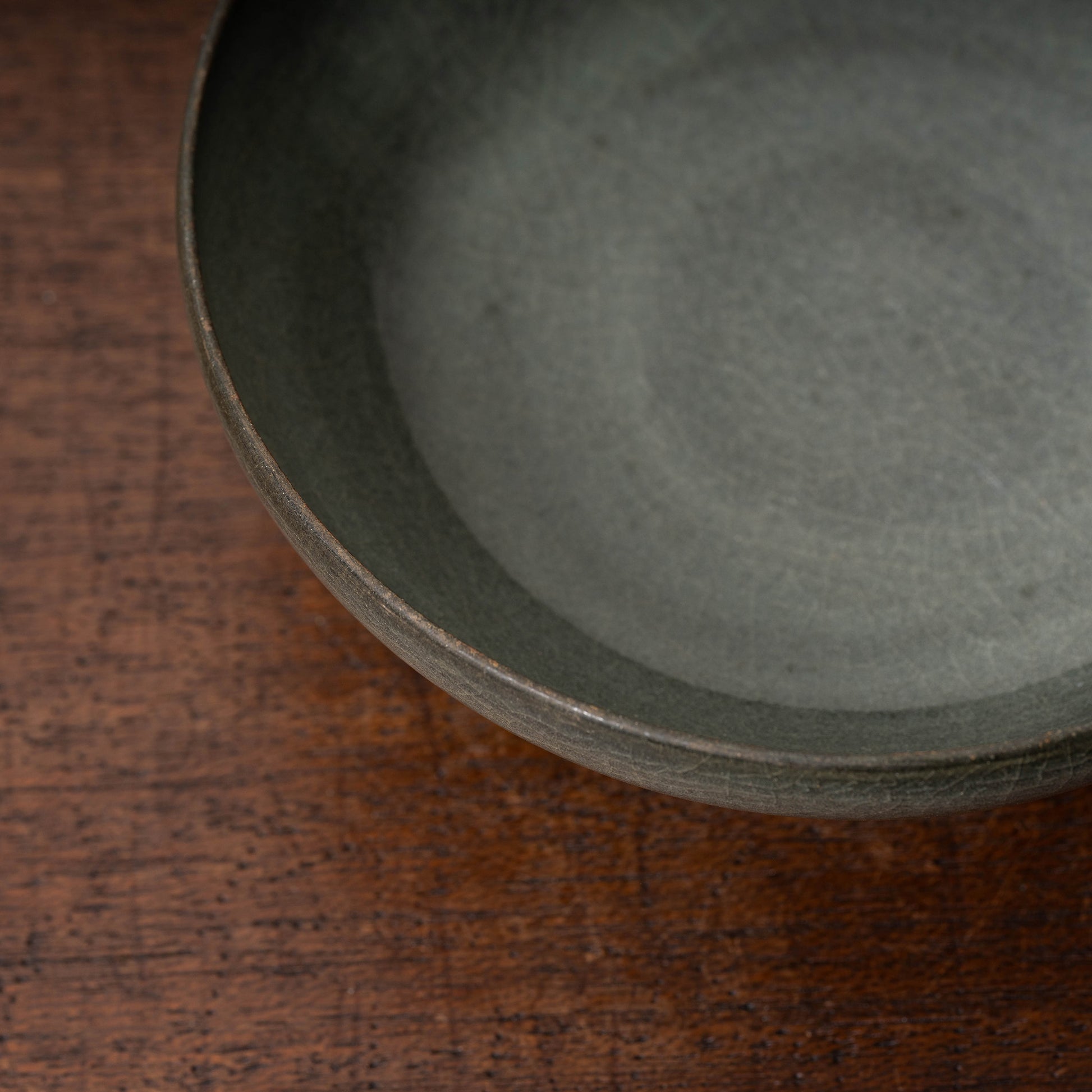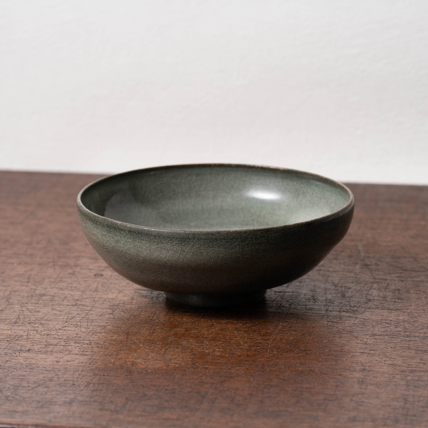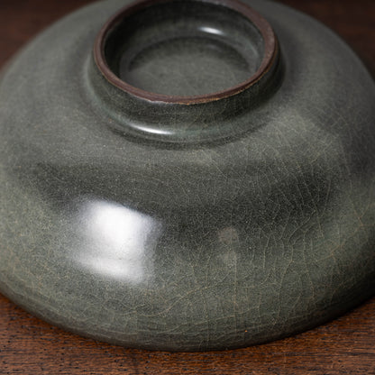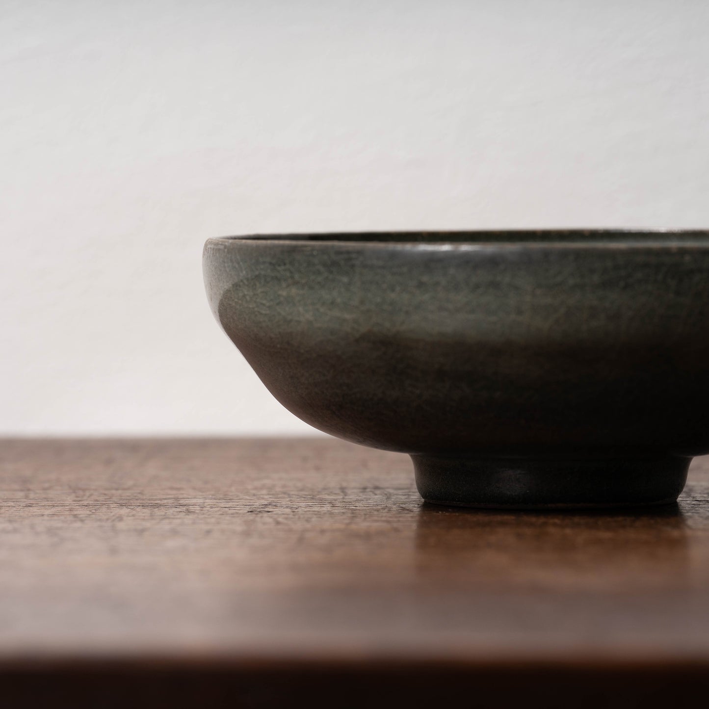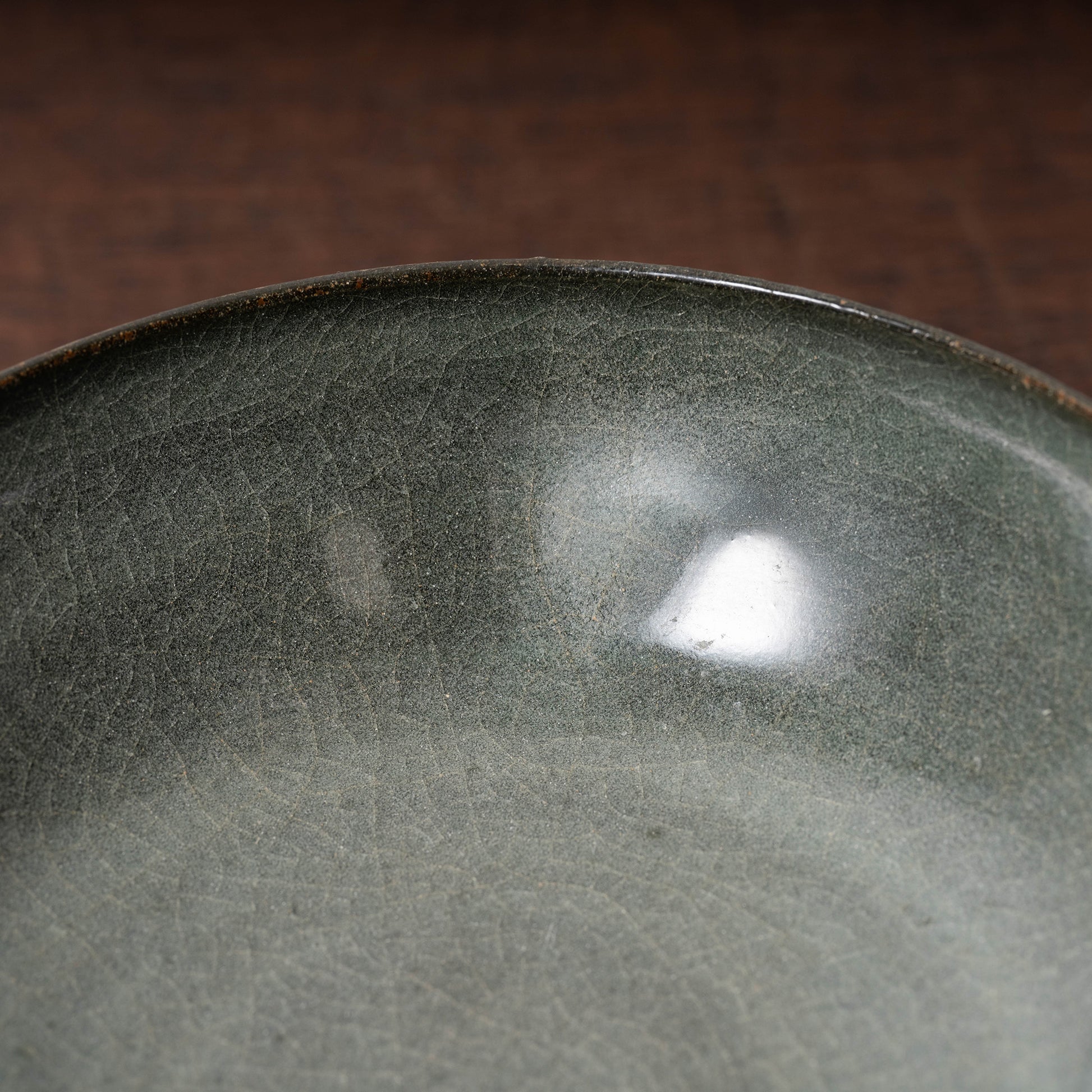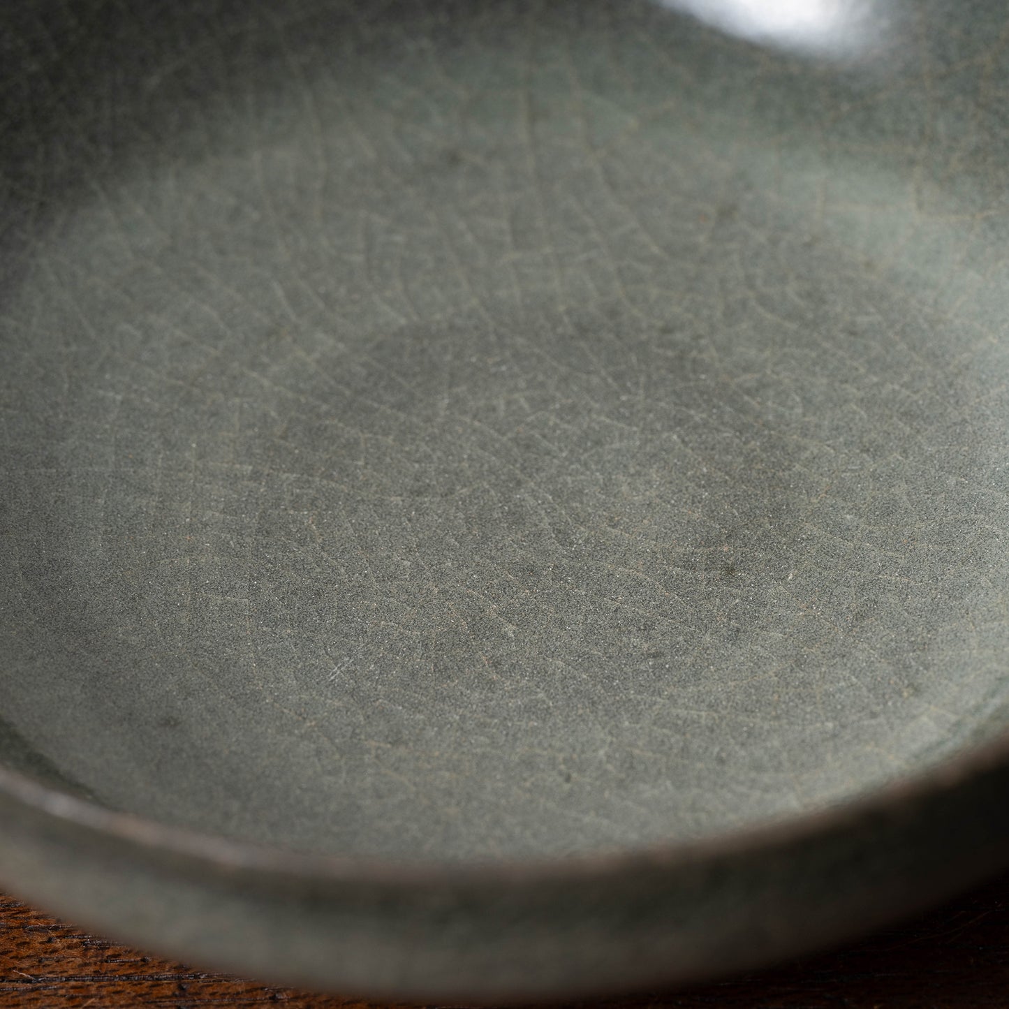 鉄分が多く含まれた青磁釉がたっぷり掛けられ、畳付けの際までしっかり施釉される薄胎厚釉の作りです。
