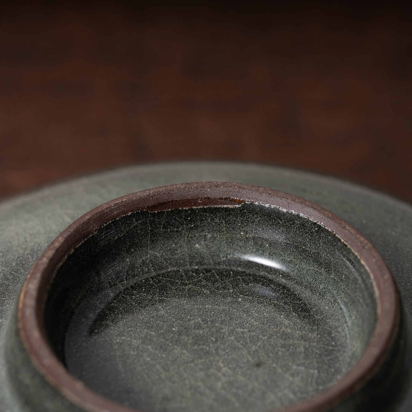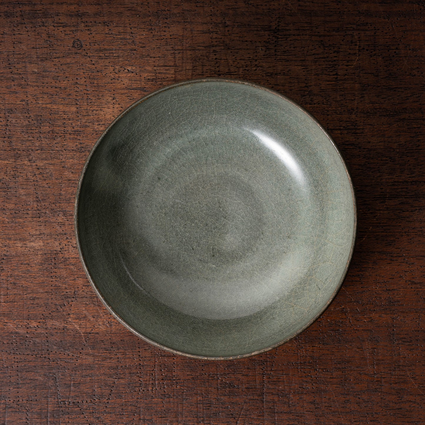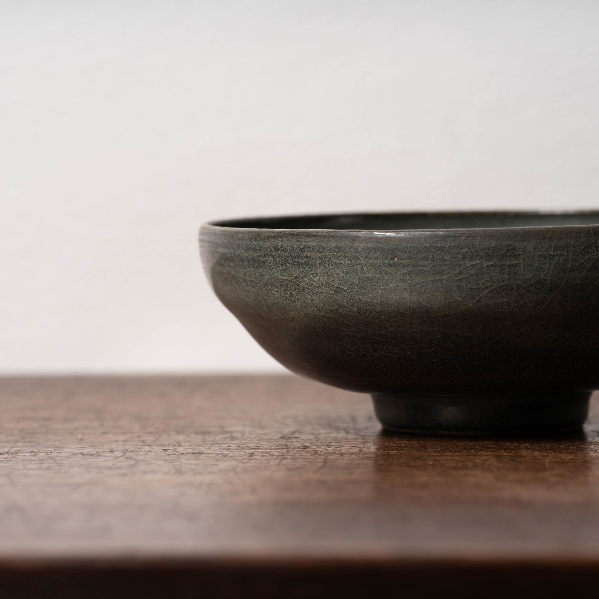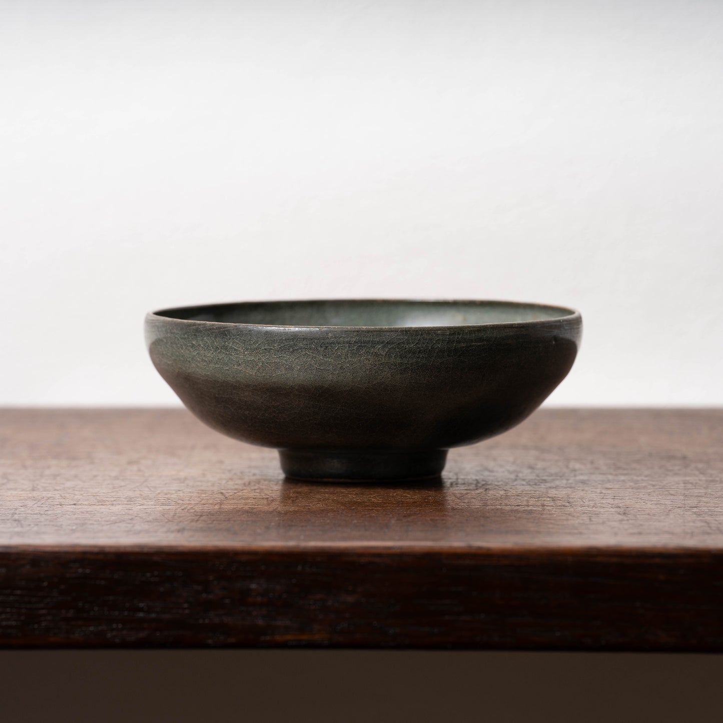 鉄分が多く含まれた青磁釉がたっぷり掛けられ、畳付けの際までしっかり施釉される薄胎厚釉の作りです。