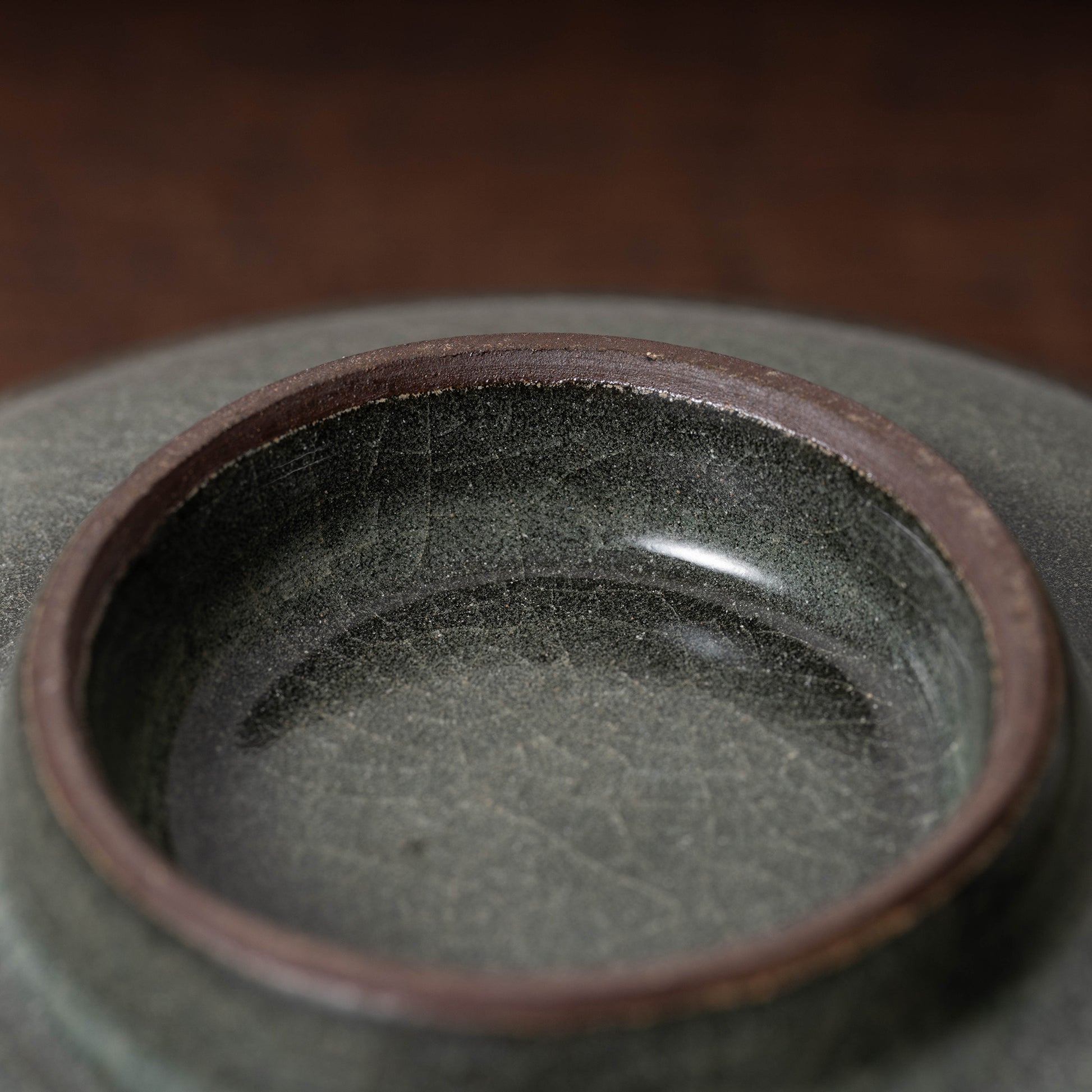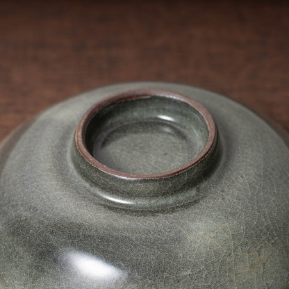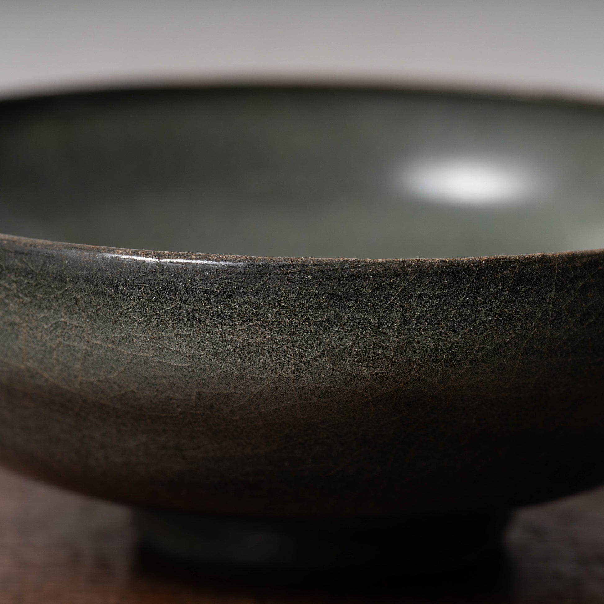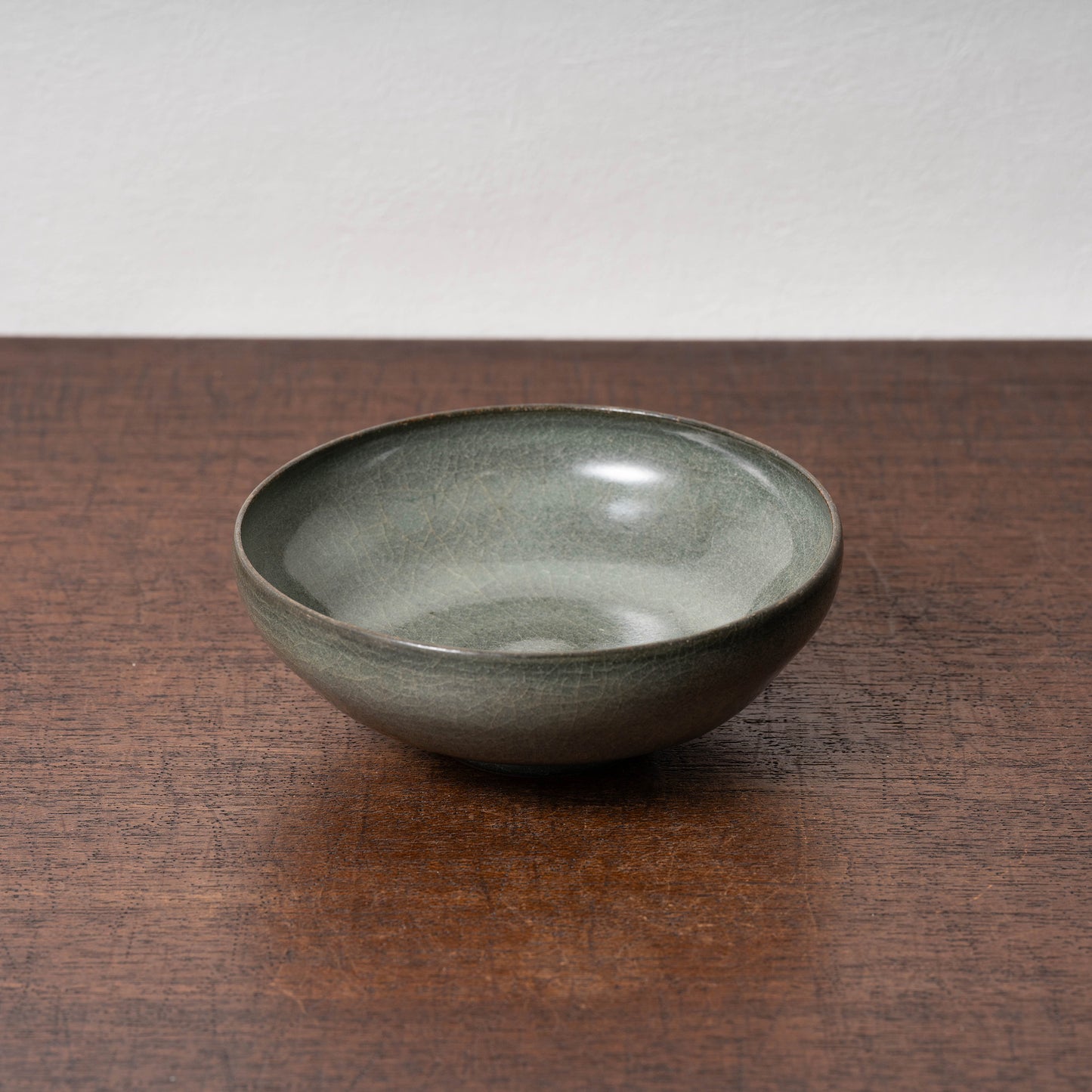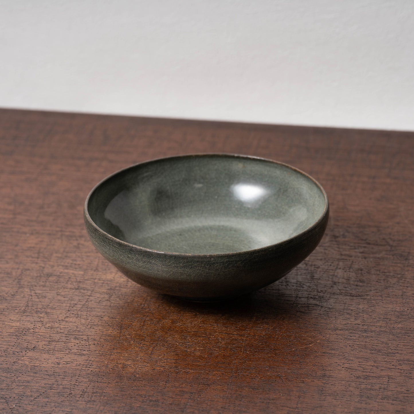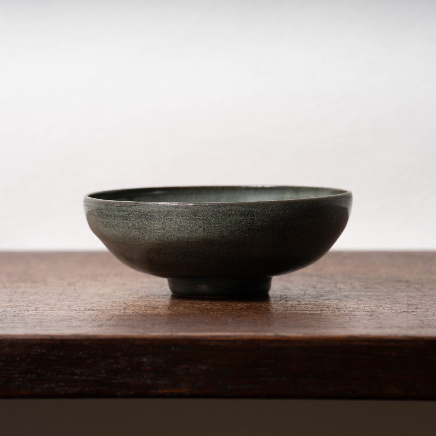 鉄分が多く含まれた青磁釉がたっぷり掛けられ、畳付けの際までしっかり施釉される薄胎厚釉の作りです。