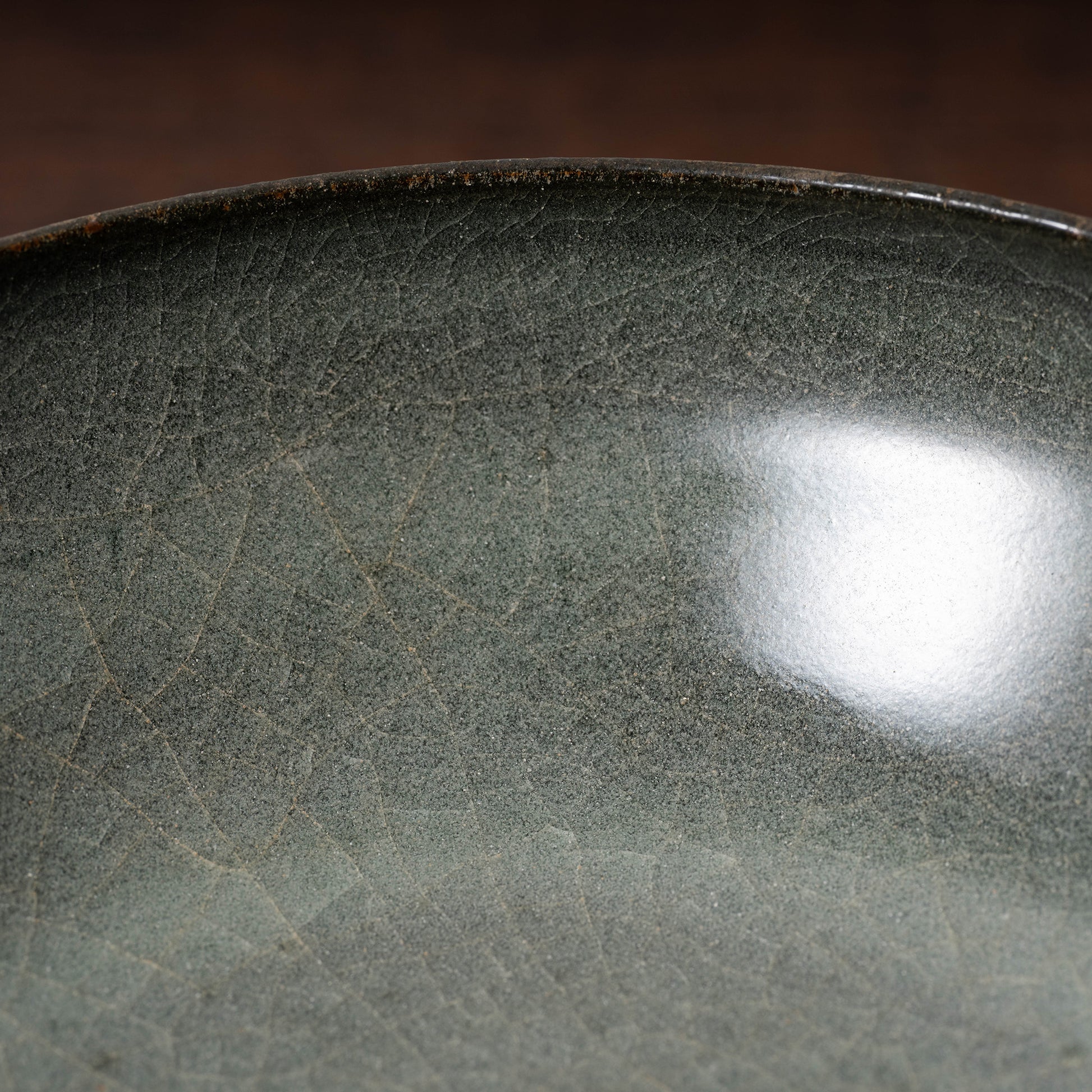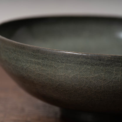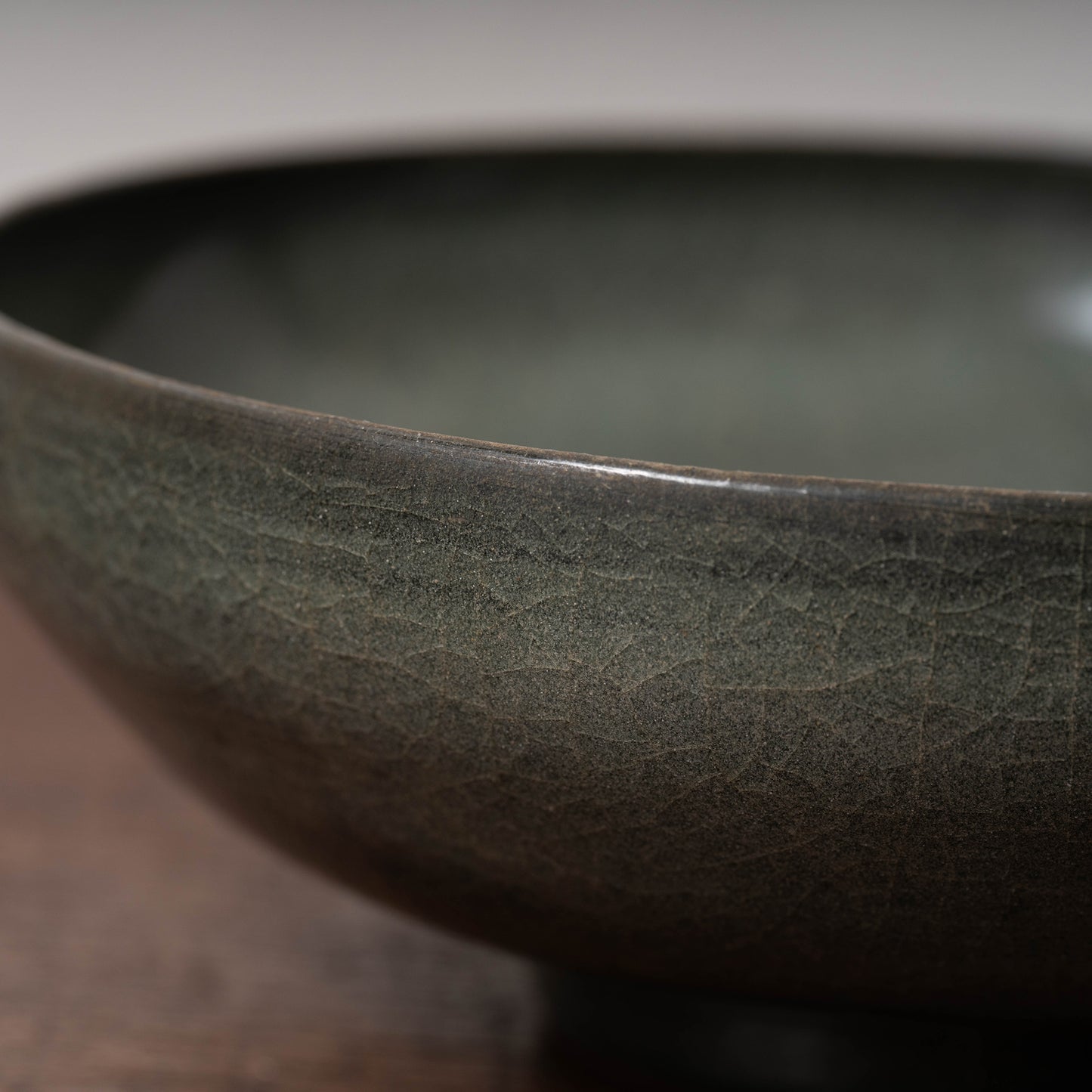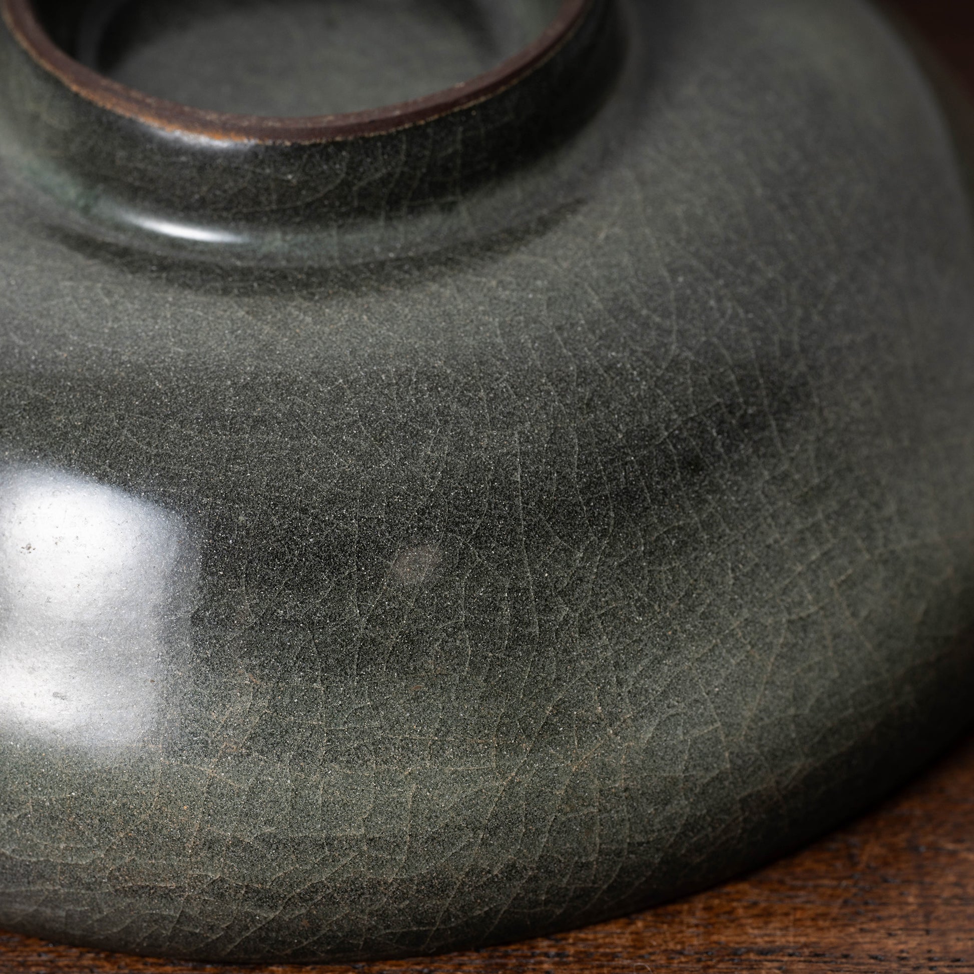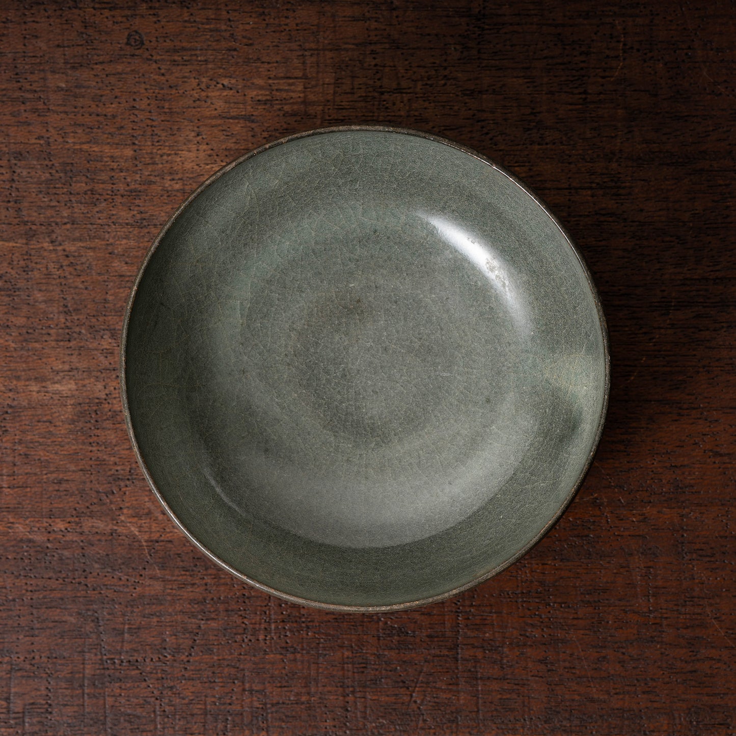 鉄分が多く含まれた青磁釉がたっぷり掛けられ、畳付けの際までしっかり施釉される薄胎厚釉の作りです。