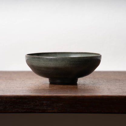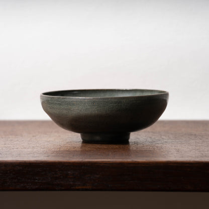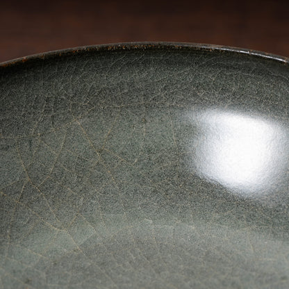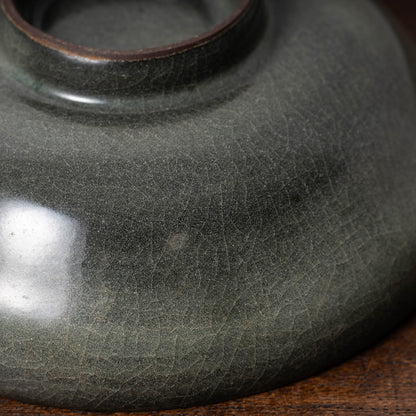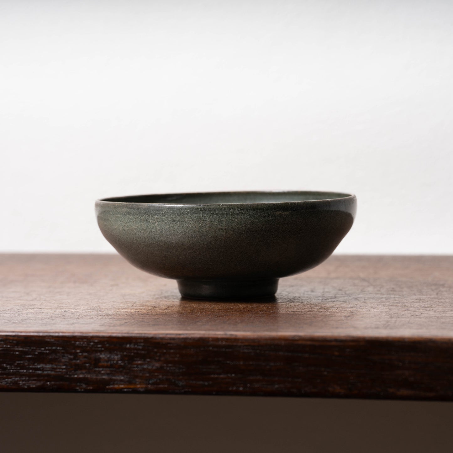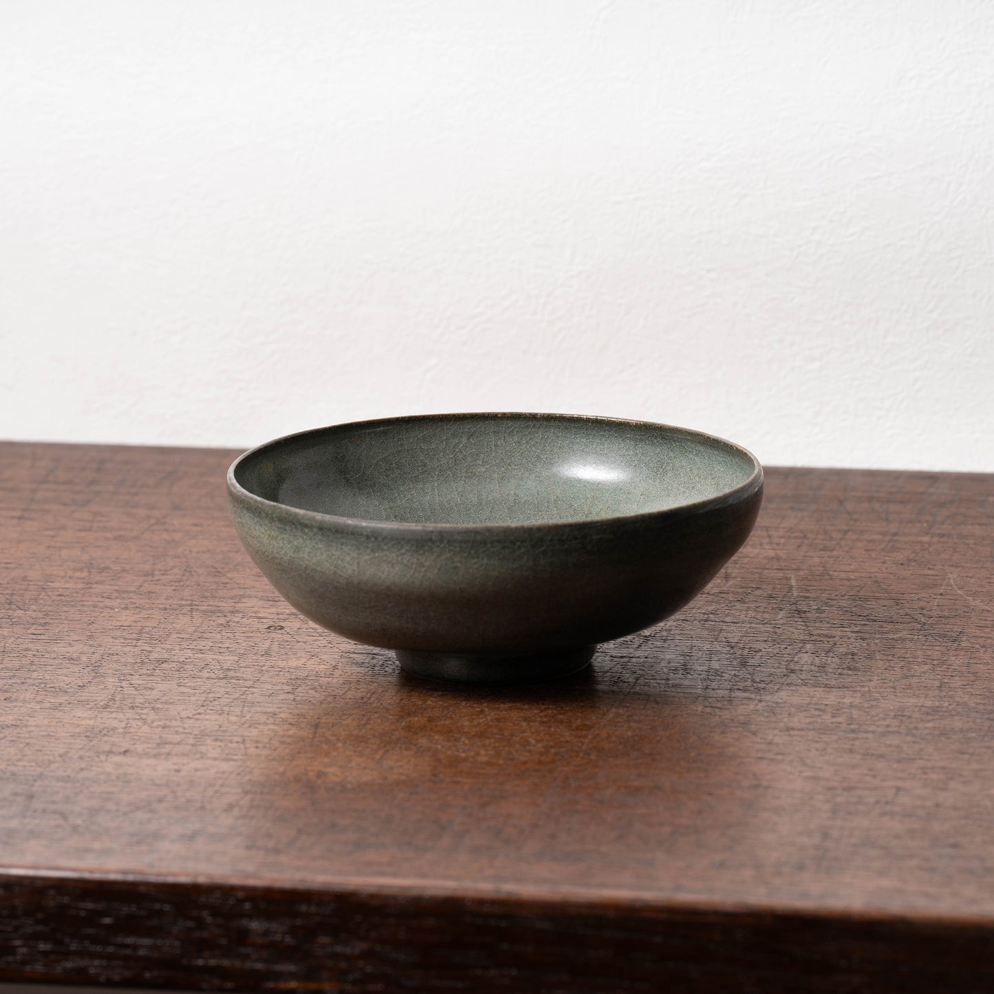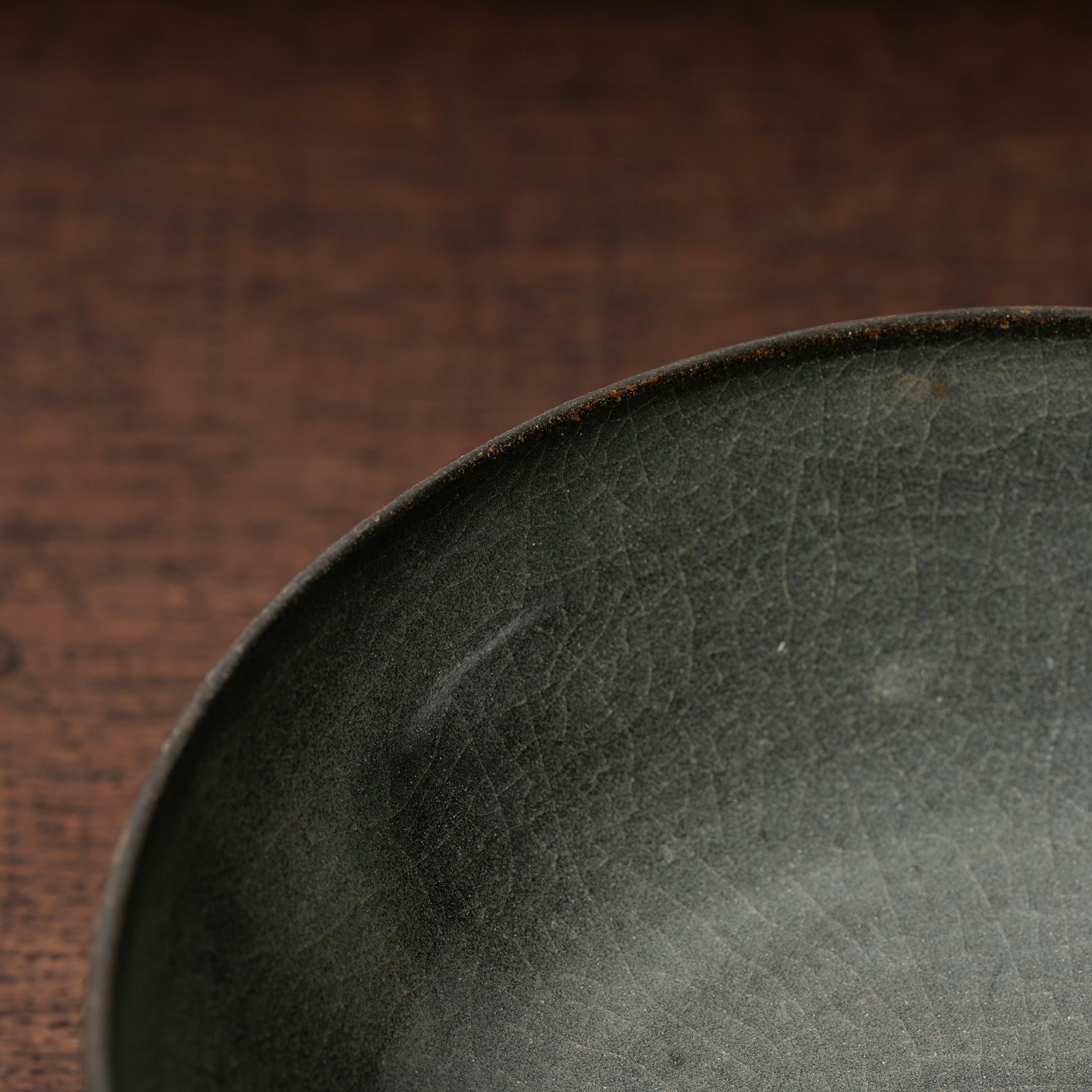 鉄分が多いことにより黒みのある緑色の青磁となりますが、器面の厚みや釉薬中の鉄分の量など色がまだらになっておりますが、これが朧げた夜空のようでとてもいい景色です。
