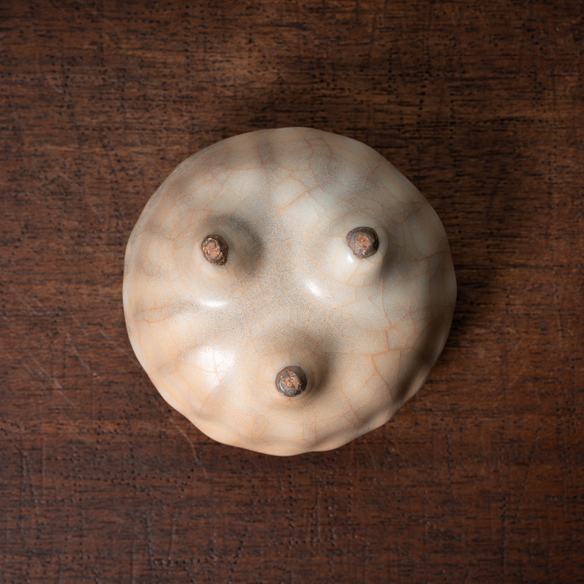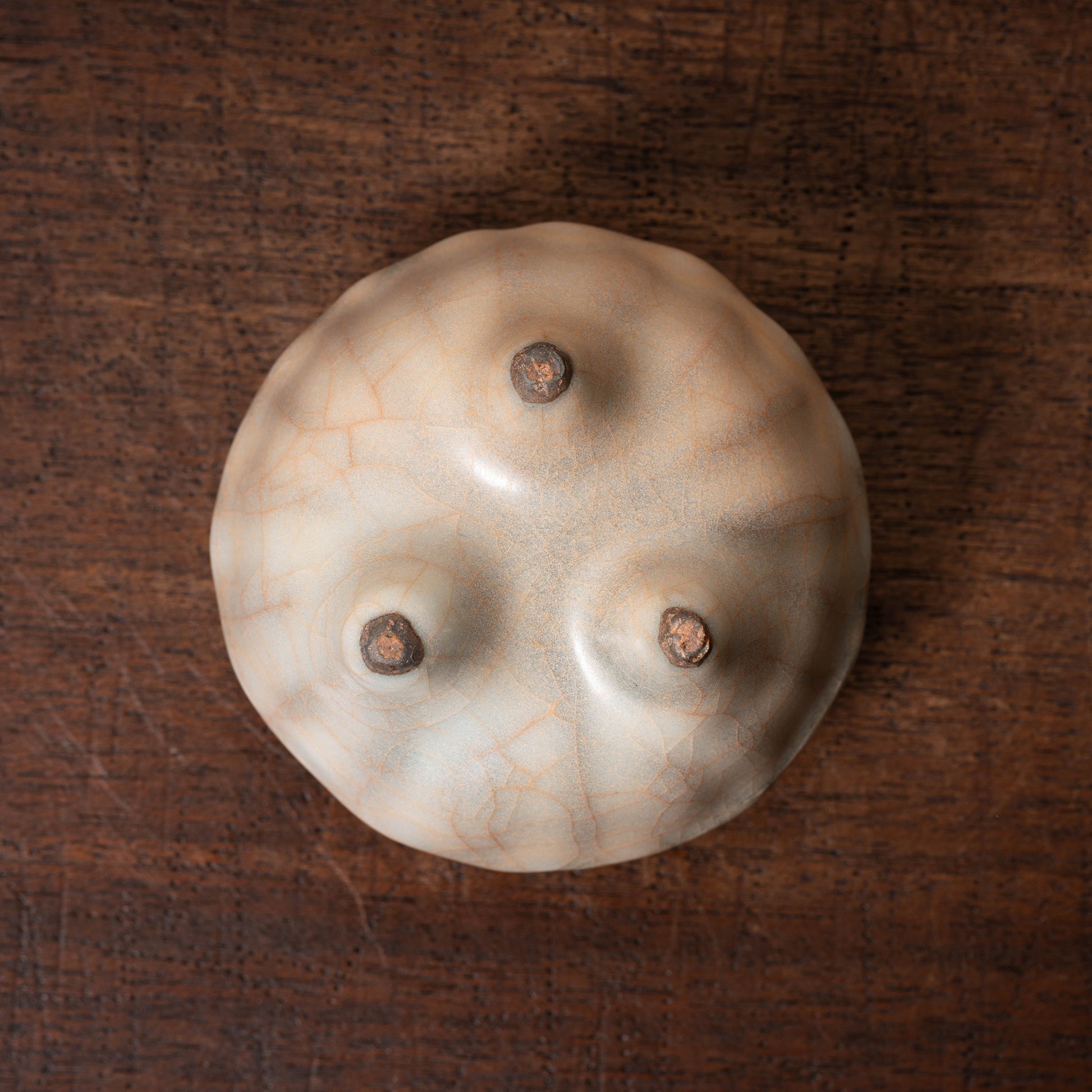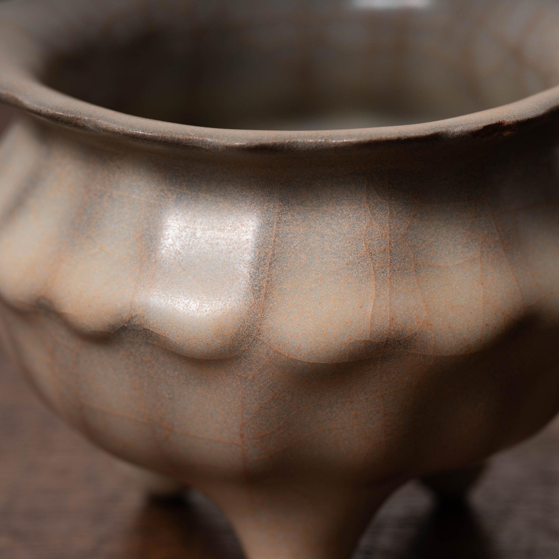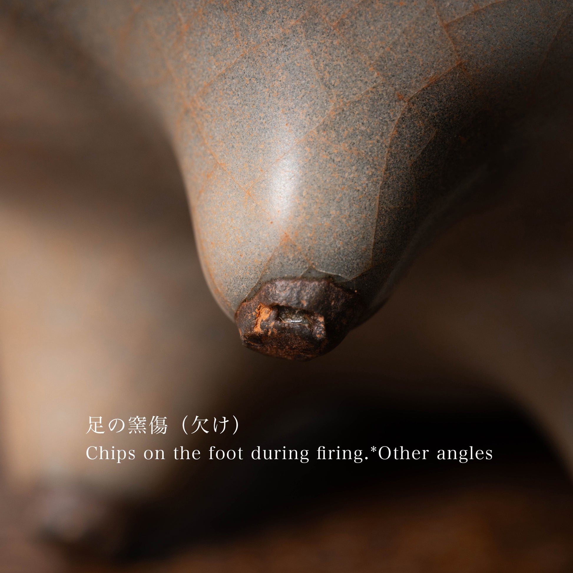 逆三角錐の足が3つ備えられ、露胎した底部からは南宋官窯特有の鉄分を含んだ黒い土が覗きます。