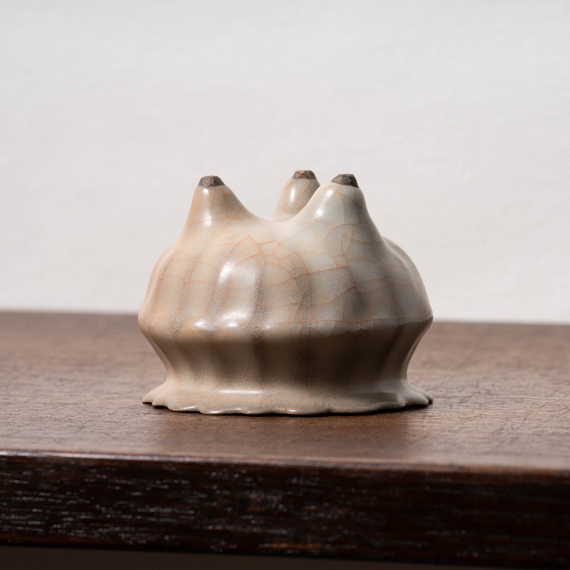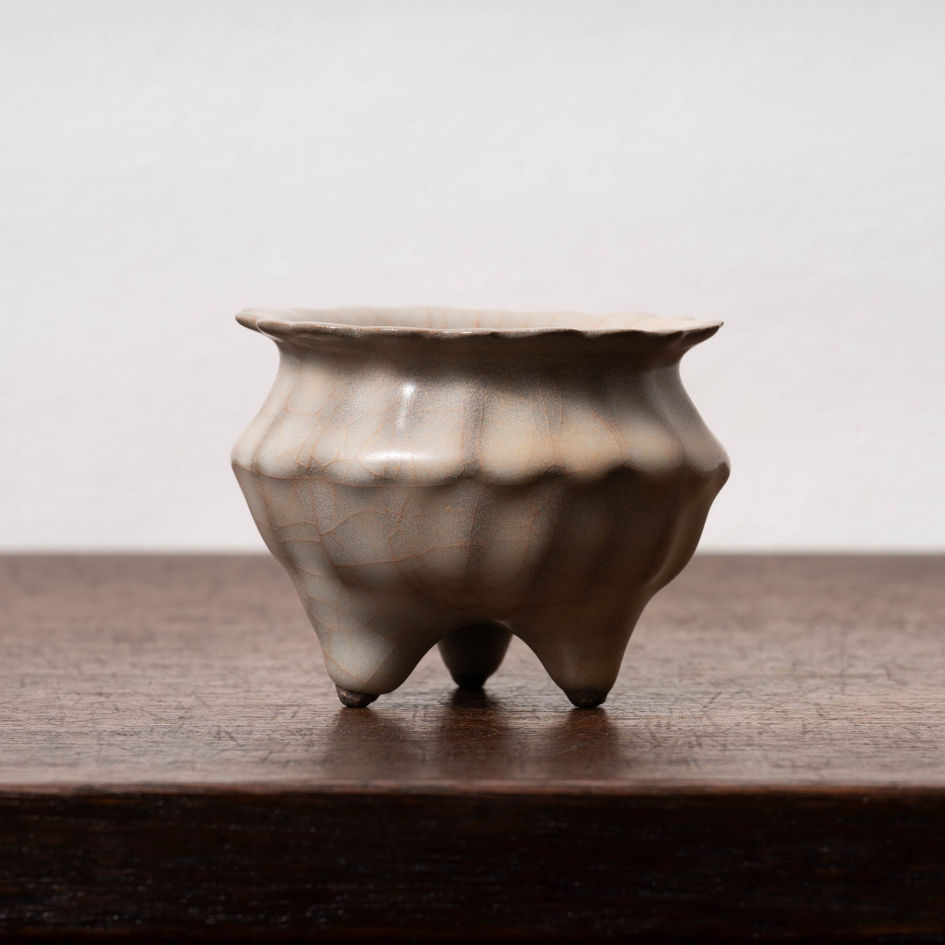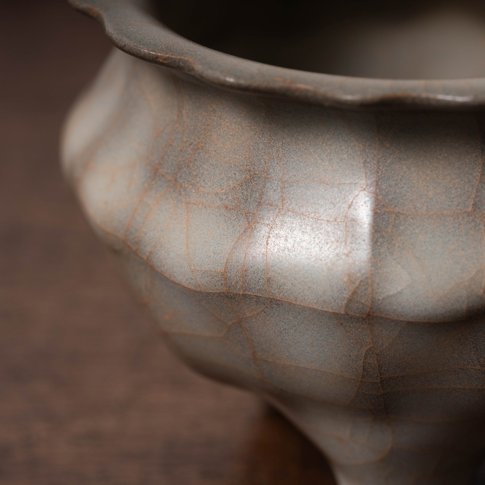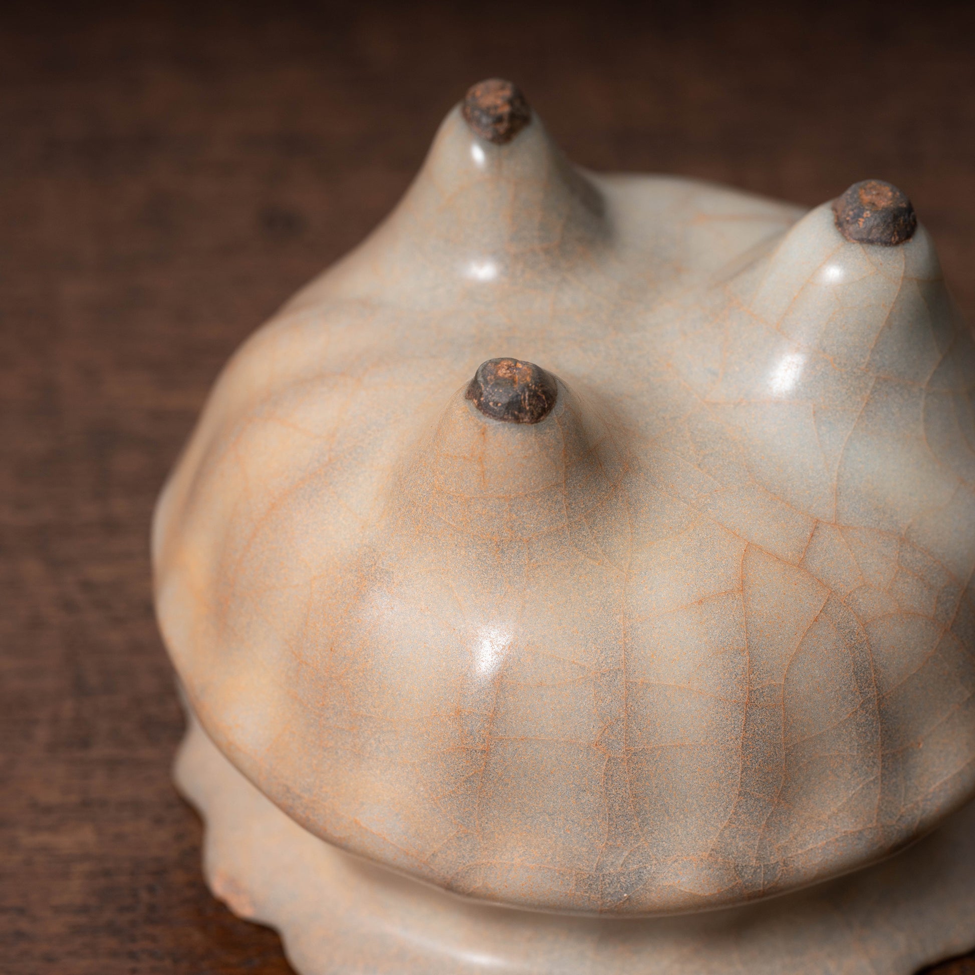 逆三角錐の足が3つ備えられ、露胎した底部からは南宋官窯特有の鉄分を含んだ黒い土が覗きます。