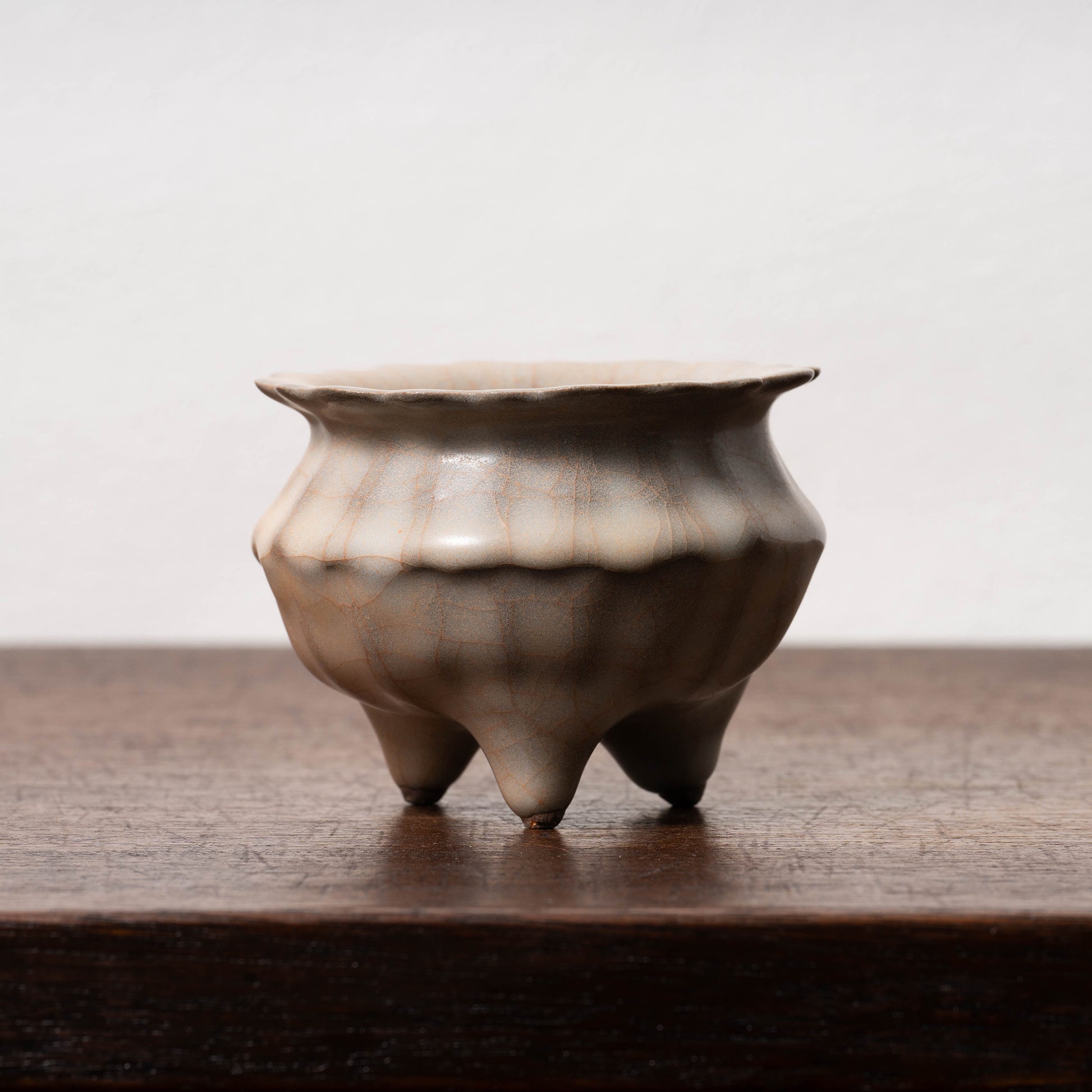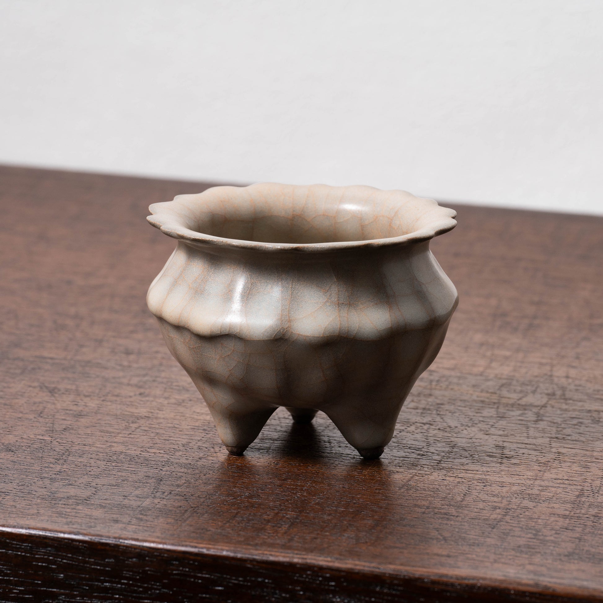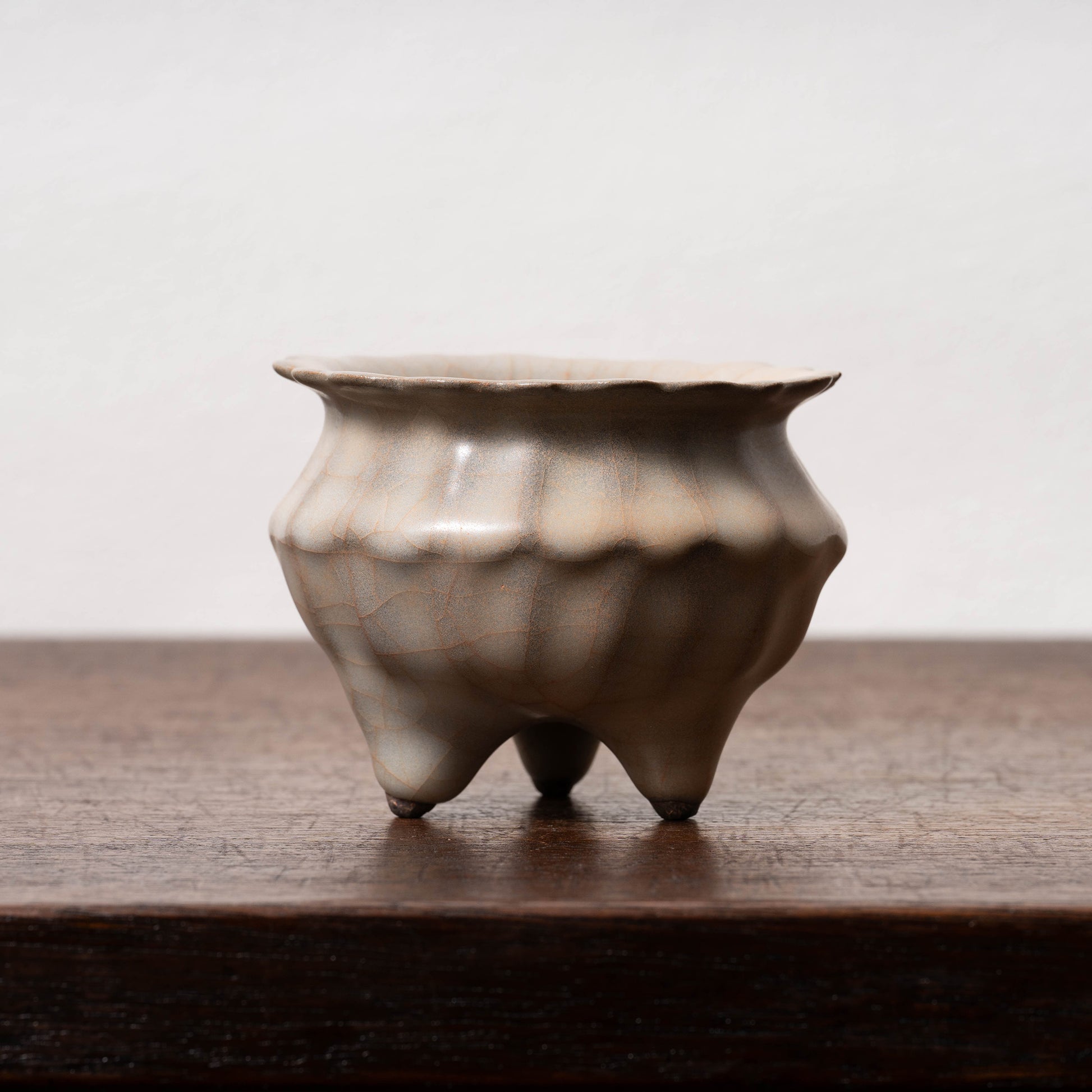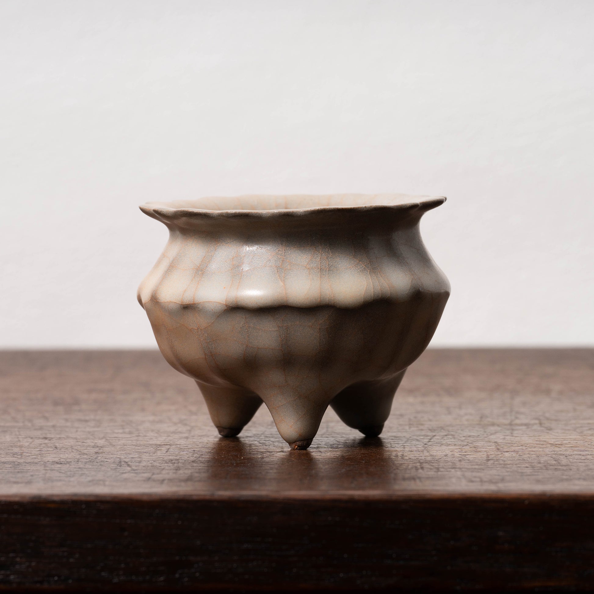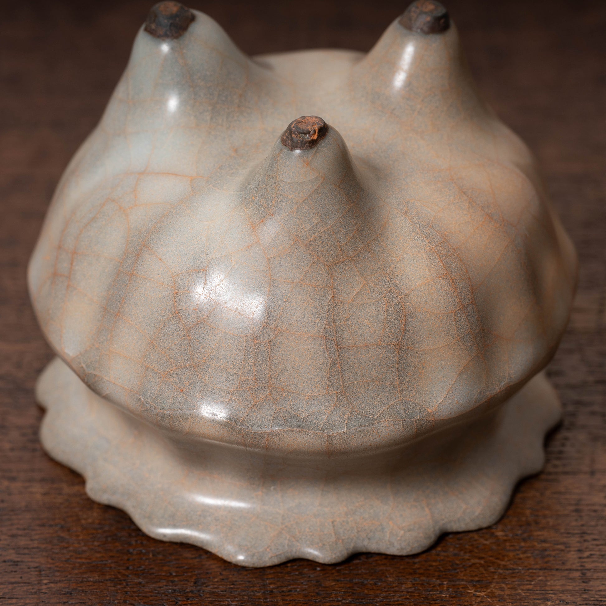 逆三角錐の足が3つ備えられ、露胎した底部からは南宋官窯特有の鉄分を含んだ黒い土が覗きます。