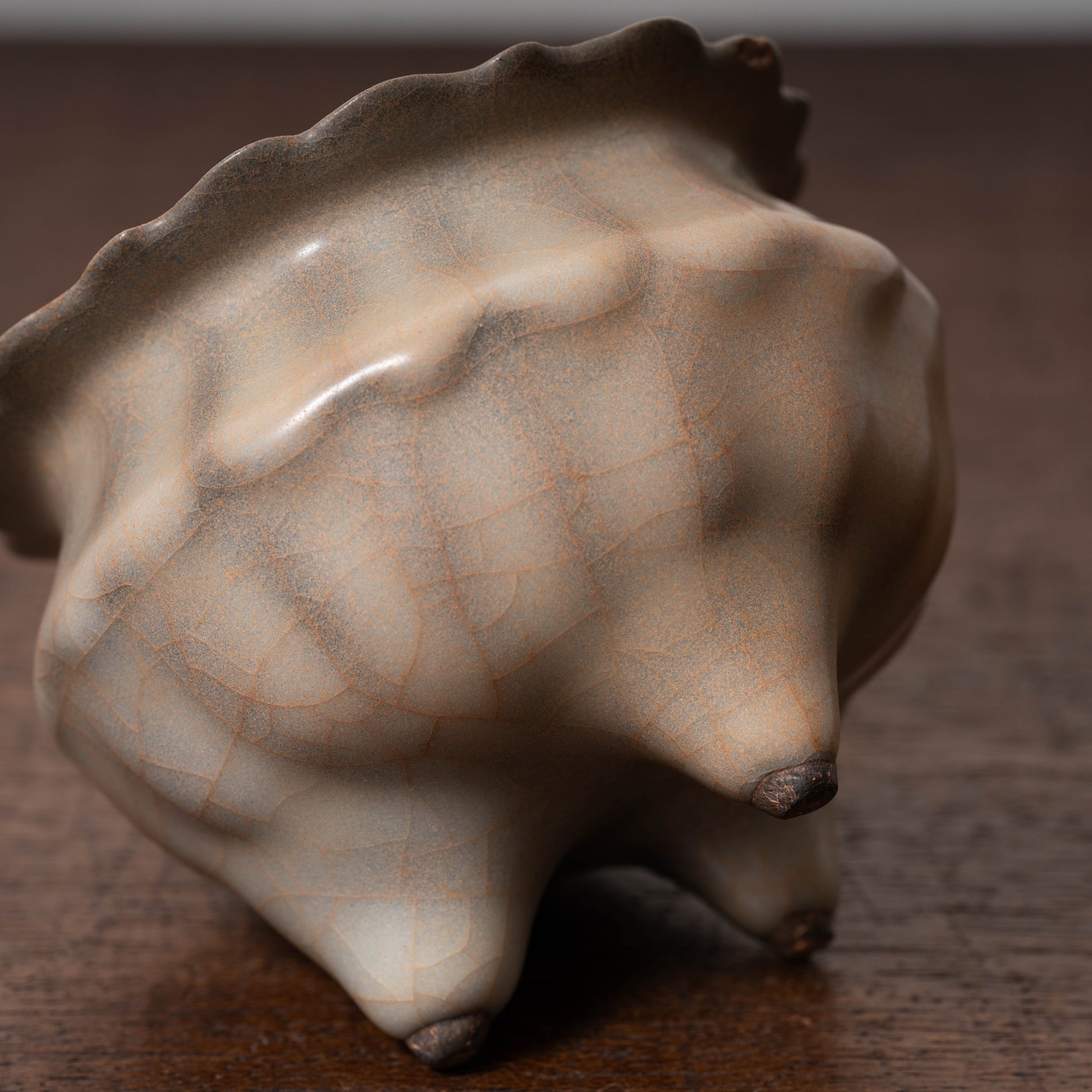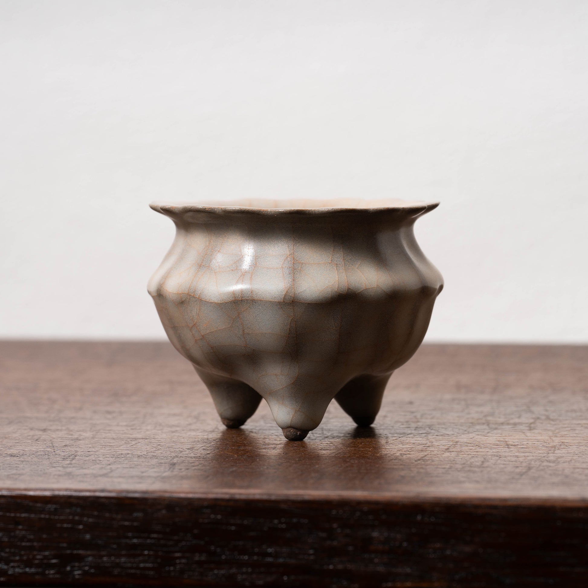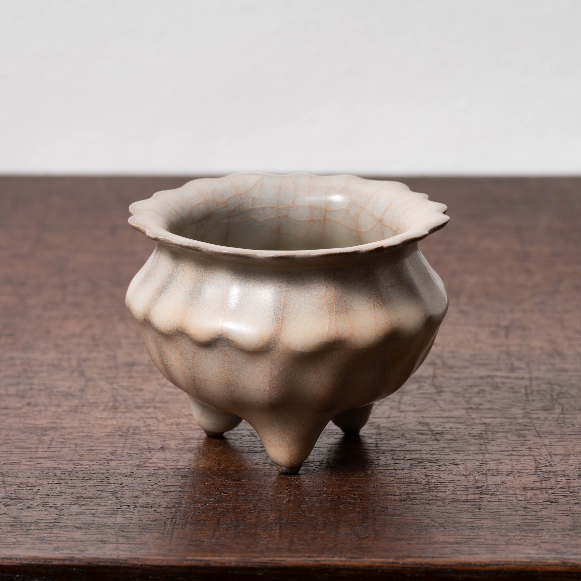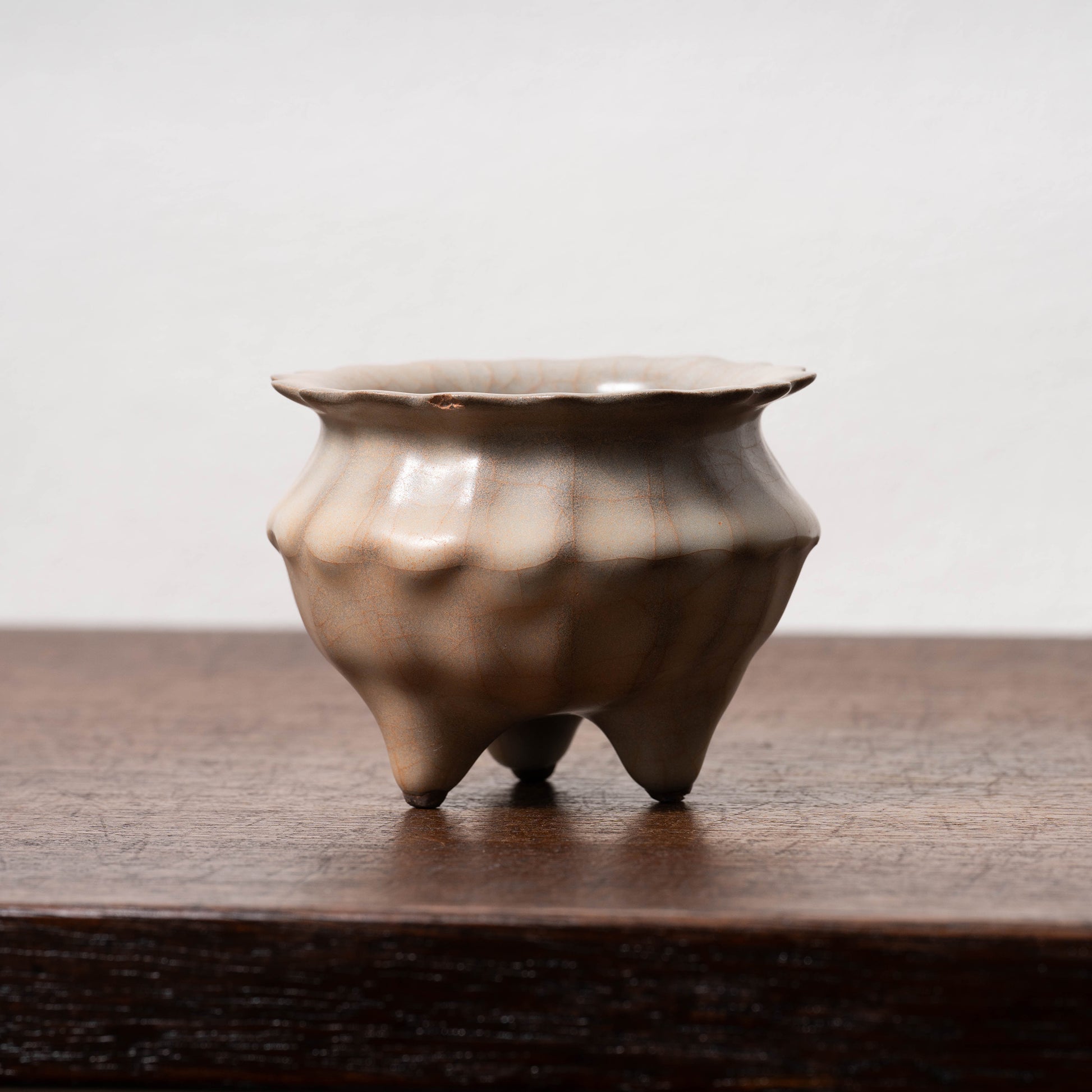 逆三角錐の足が3つ備えられ、露胎した底部からは南宋官窯特有の鉄分を含んだ黒い土が覗きます。