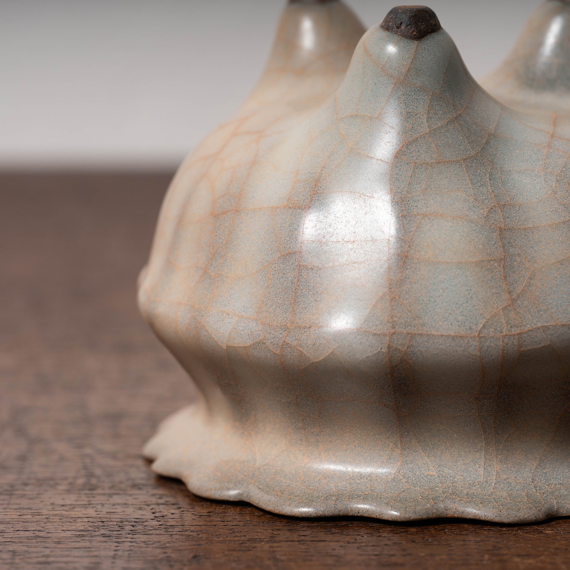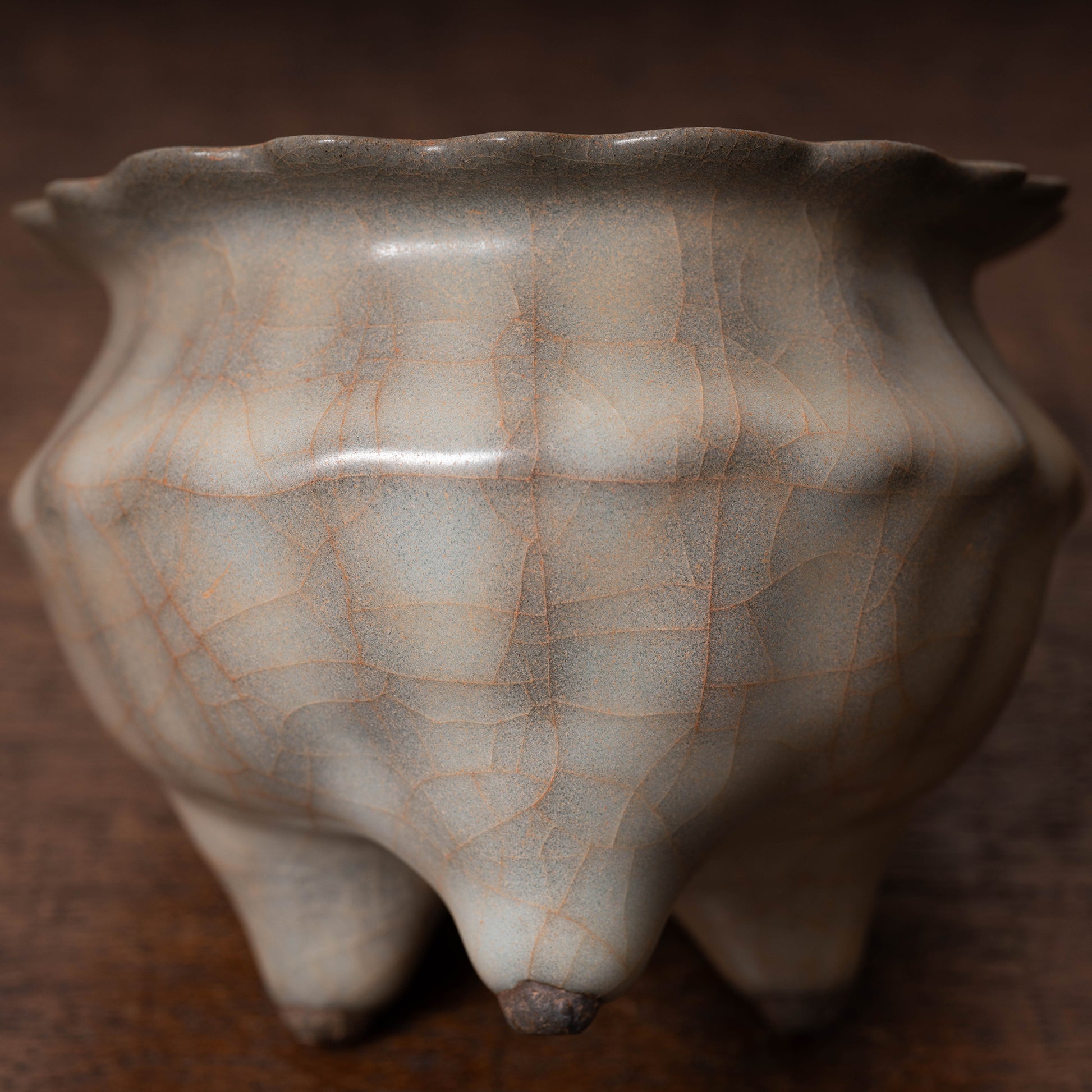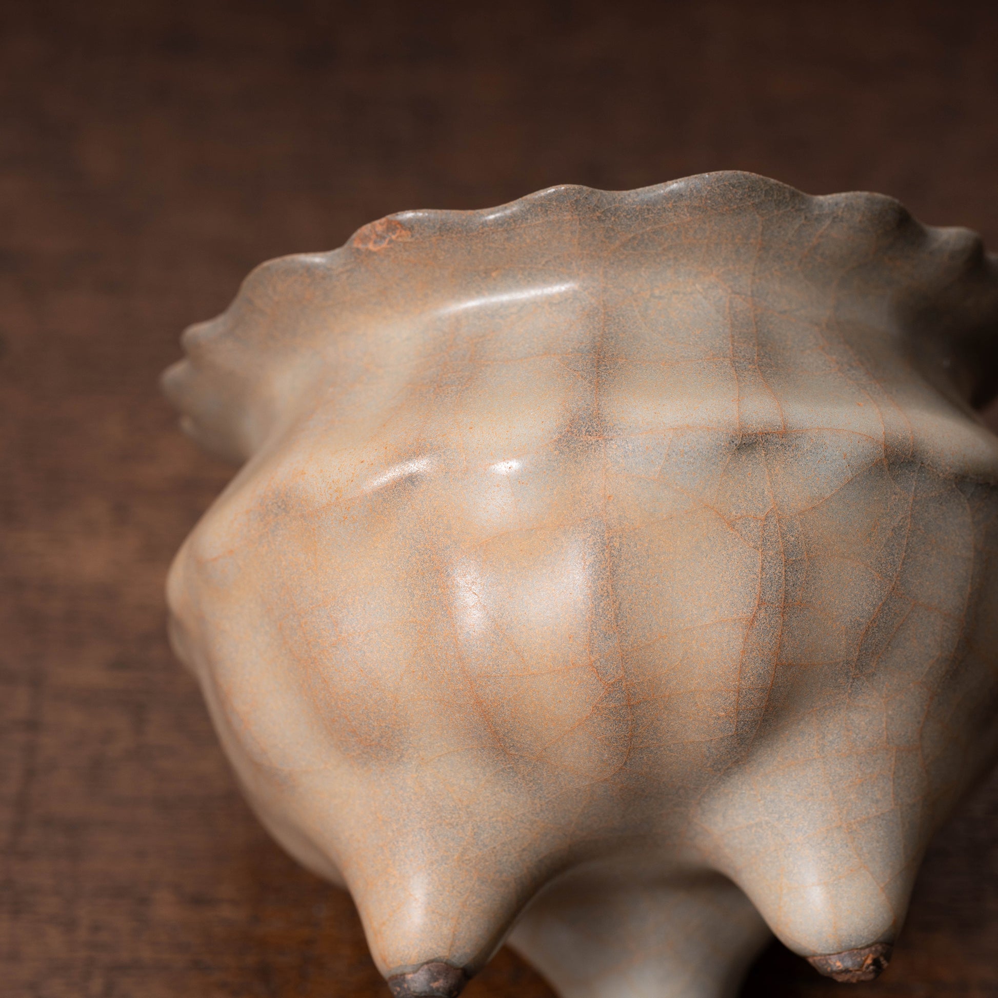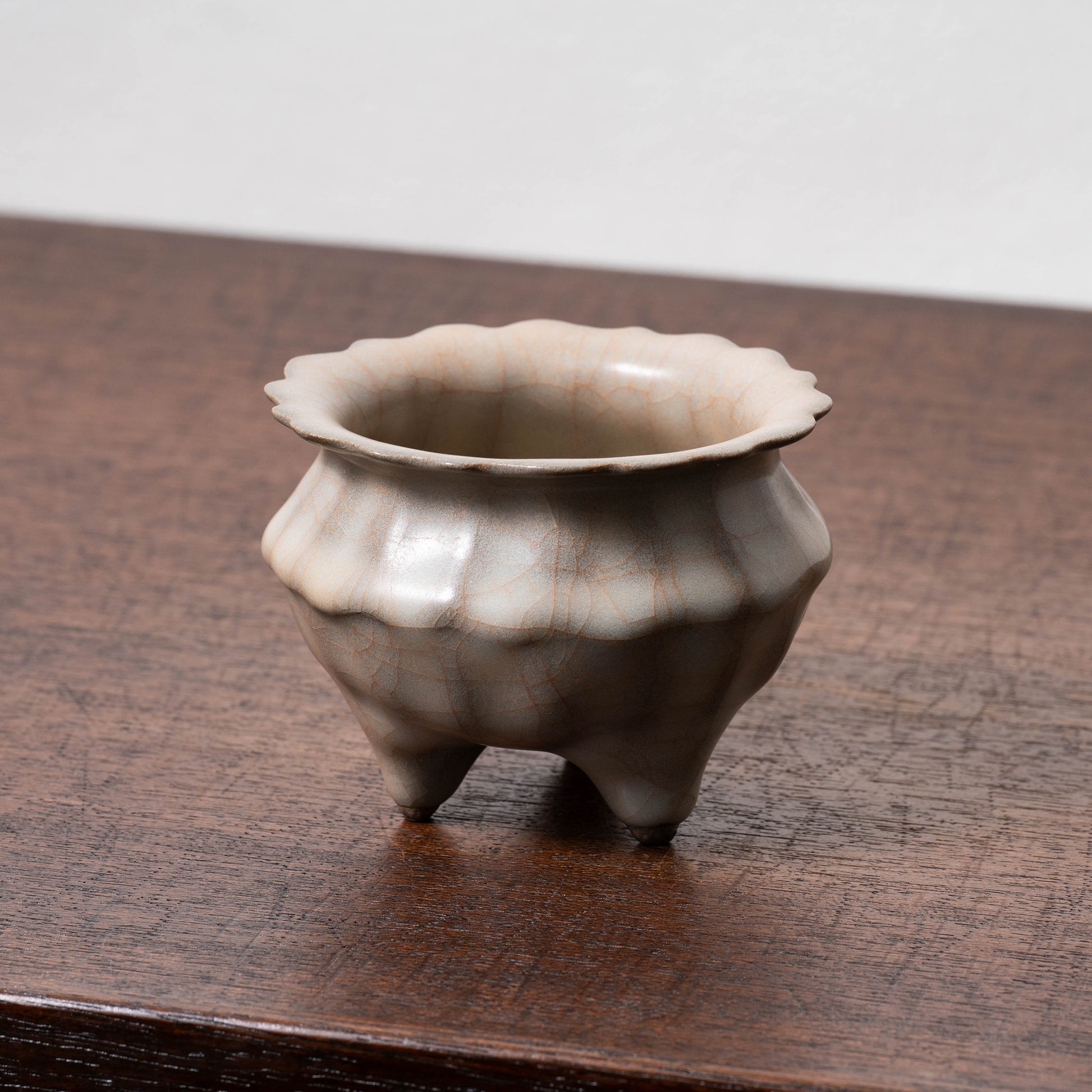 逆三角錐の足が3つ備えられ、露胎した底部からは南宋官窯特有の鉄分を含んだ黒い土が覗きます。