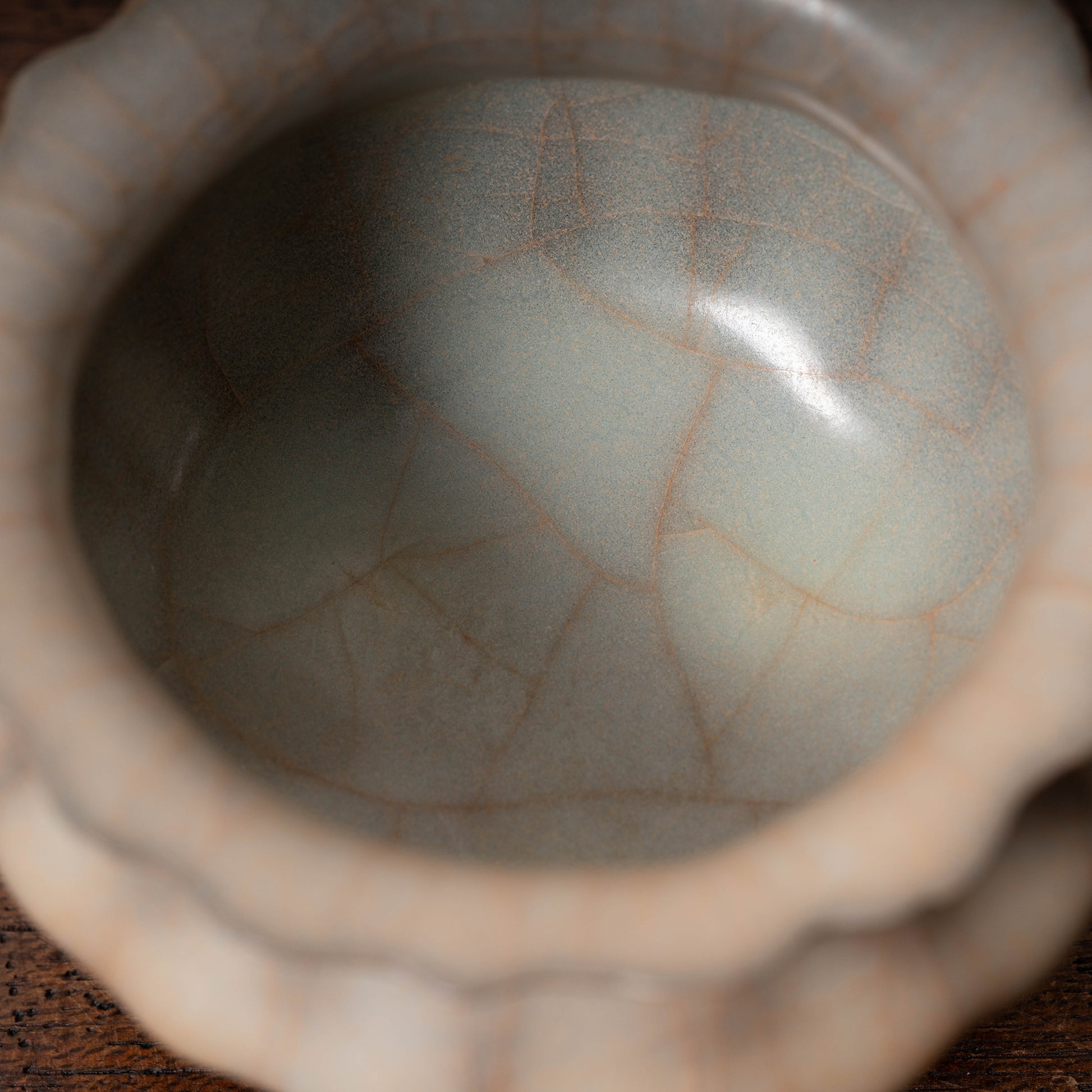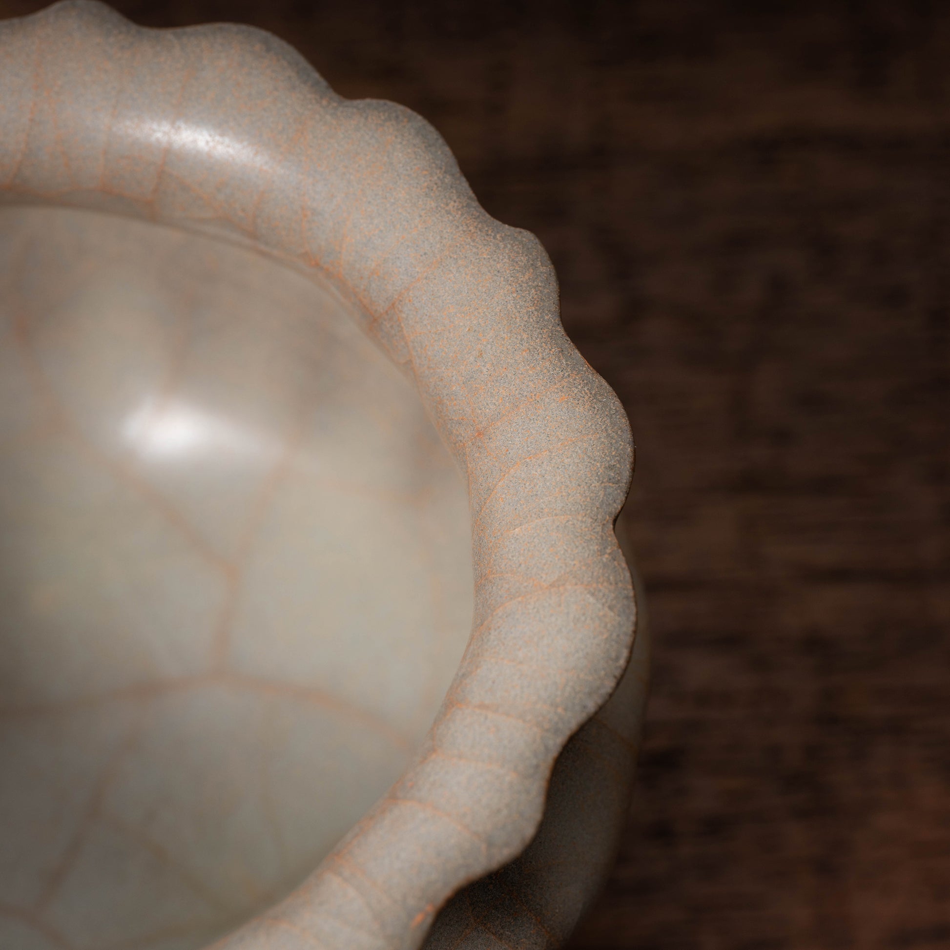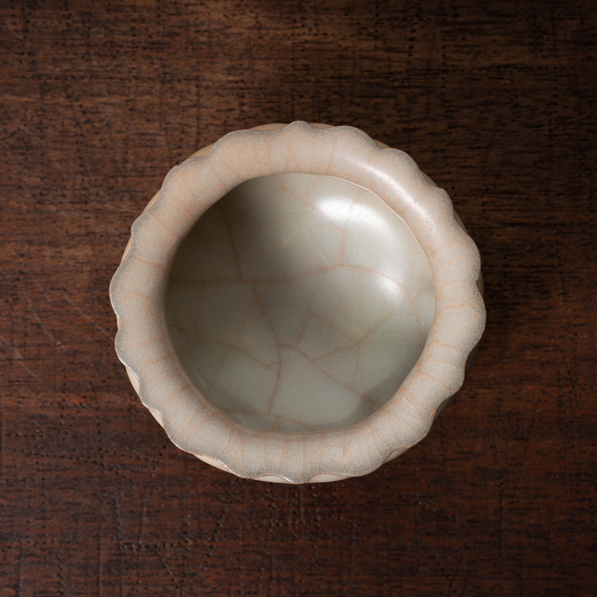 南宋官窯を代表する薄胎薄釉の品ですが、足には釉が溜まりどっしりとしています。