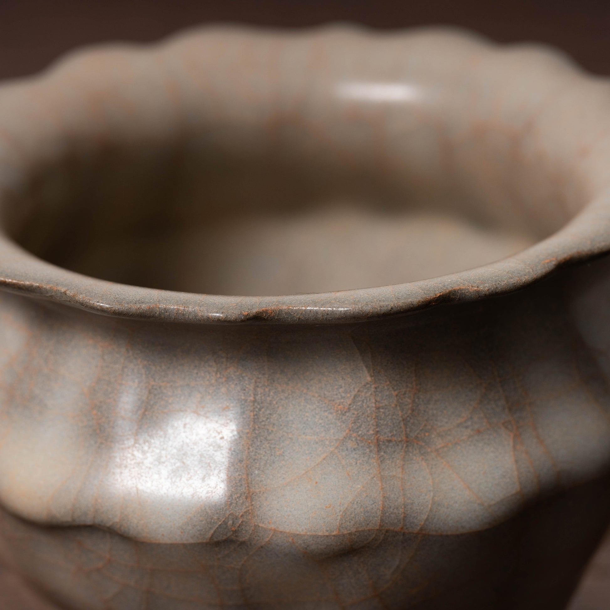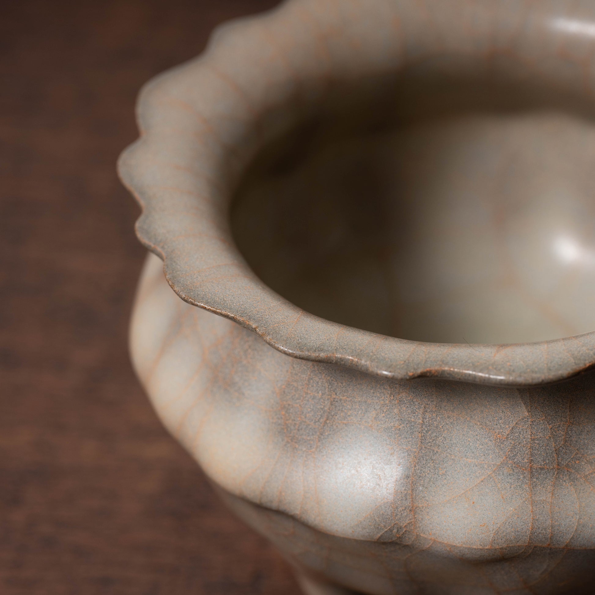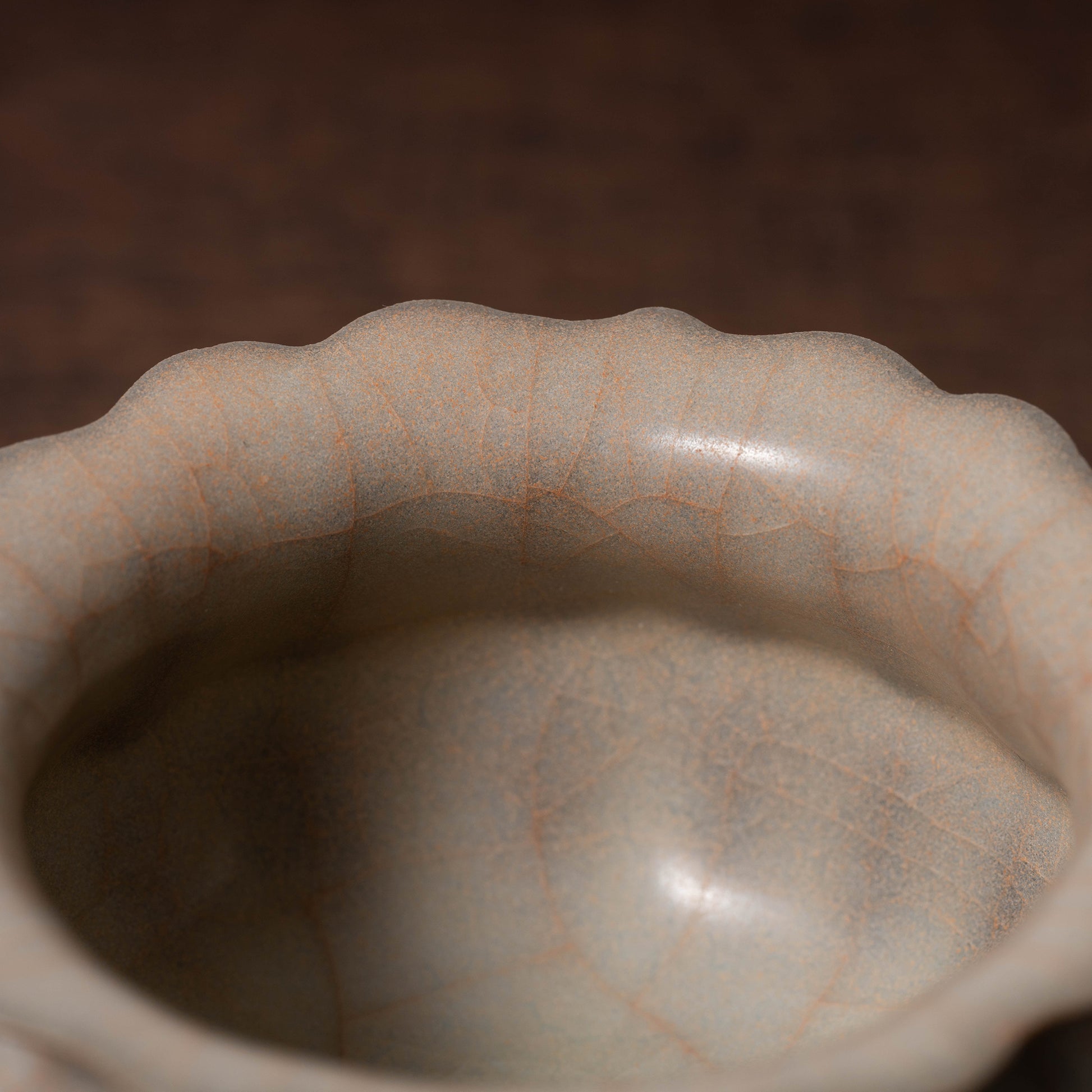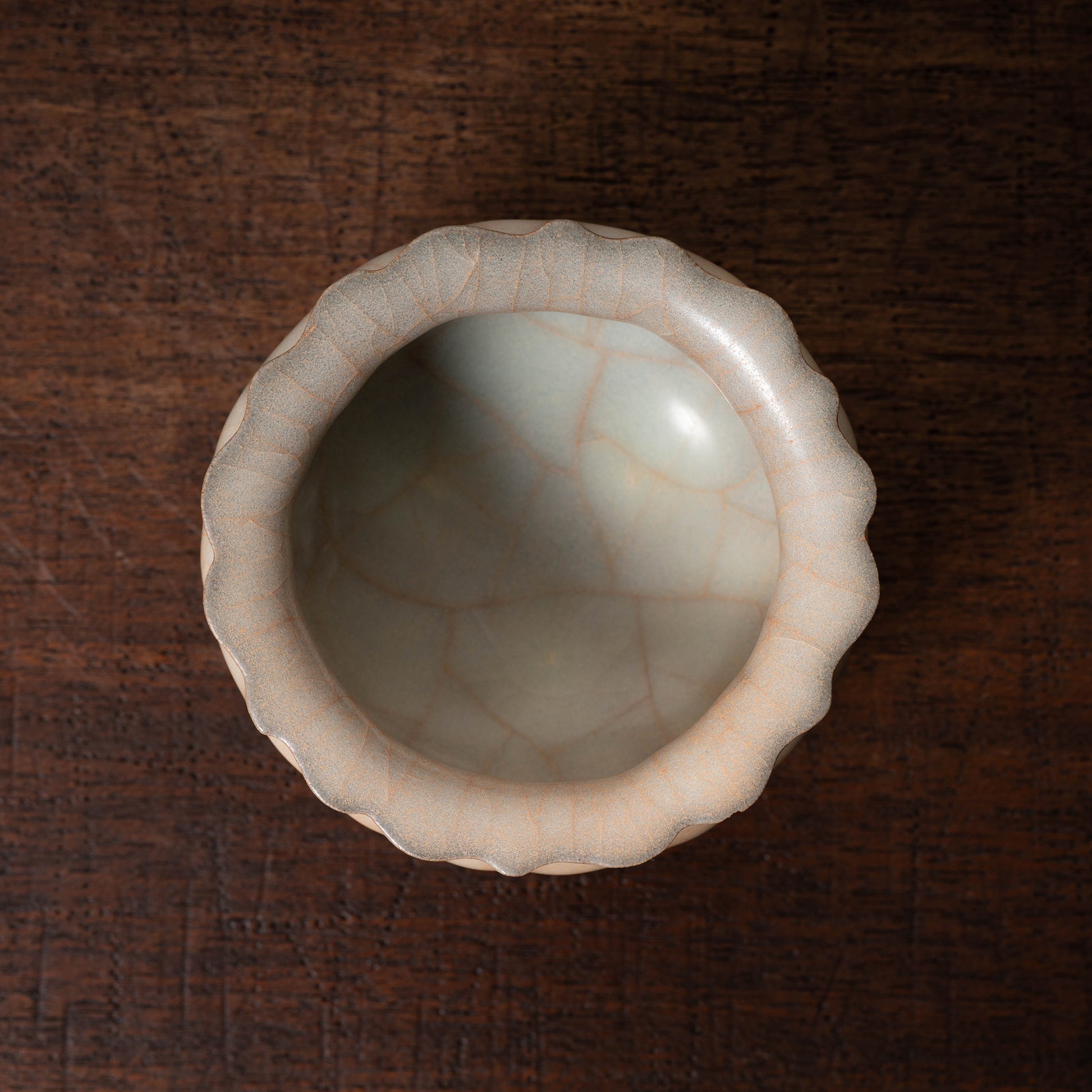 南宋官窯を代表する薄胎薄釉の品ですが、足には釉が溜まりどっしりとしています。