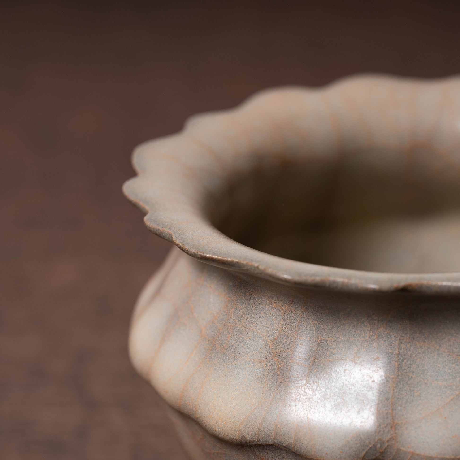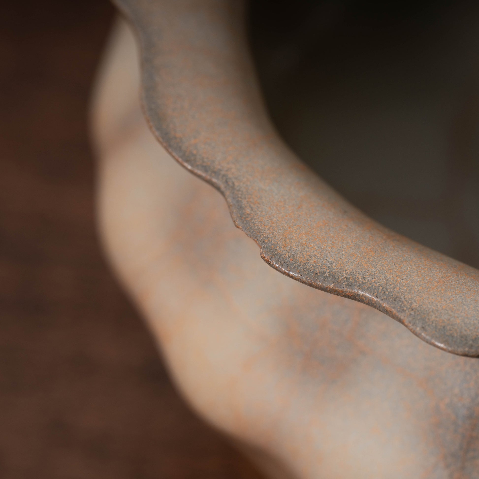 口縁部が細かな花の形、それに沿うように胴には稜線がつき、中腹が膨れて少し角ばります。