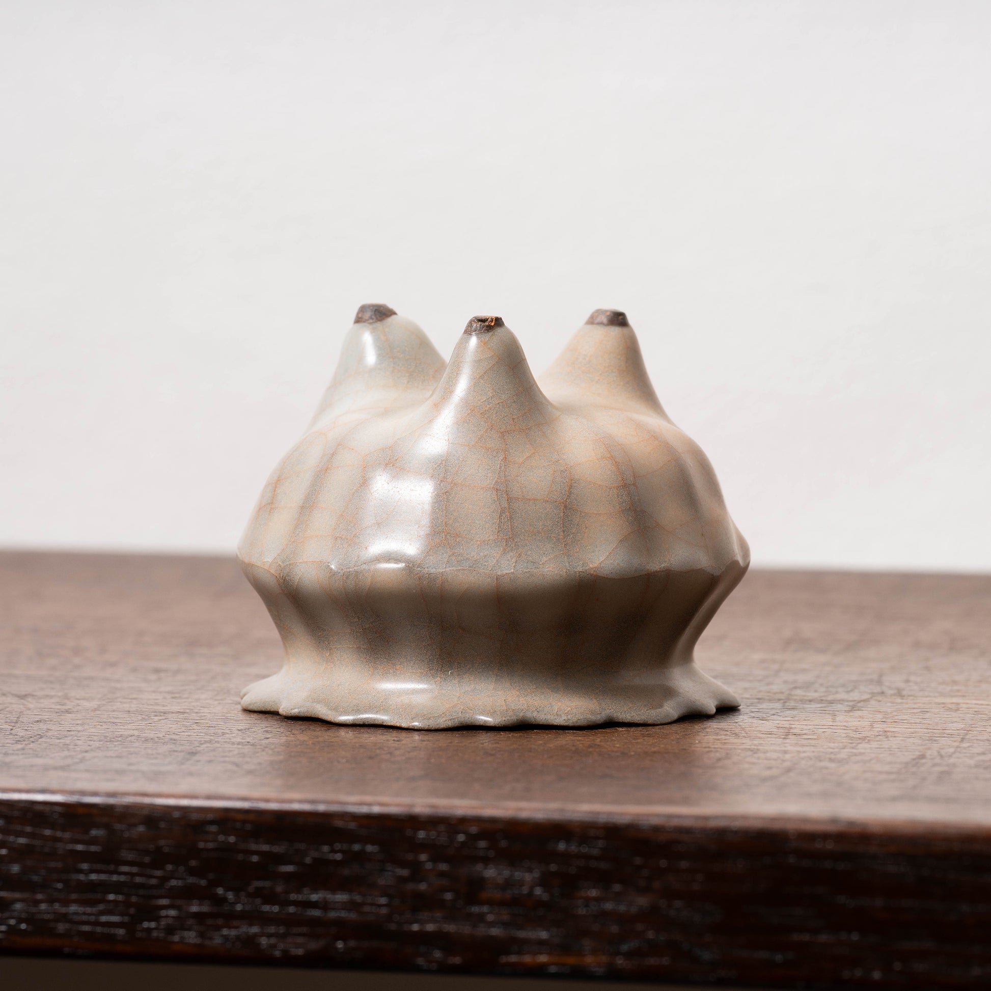 稜線の凸部分の釉が薄く土が黒く透け、その稜線に沿って入る細かな貫入により、花の蕾のような生命的な印象を与えます。