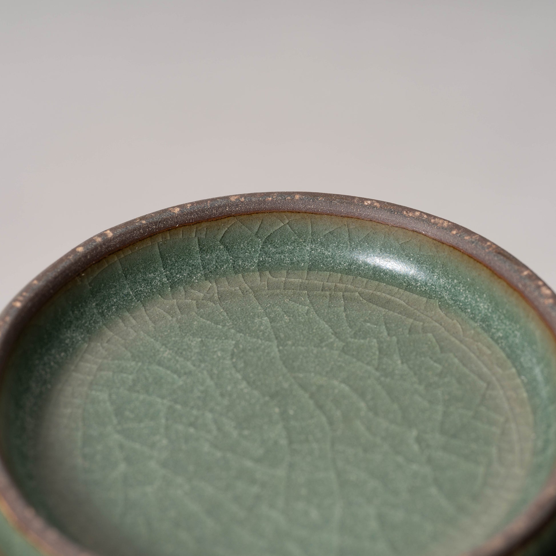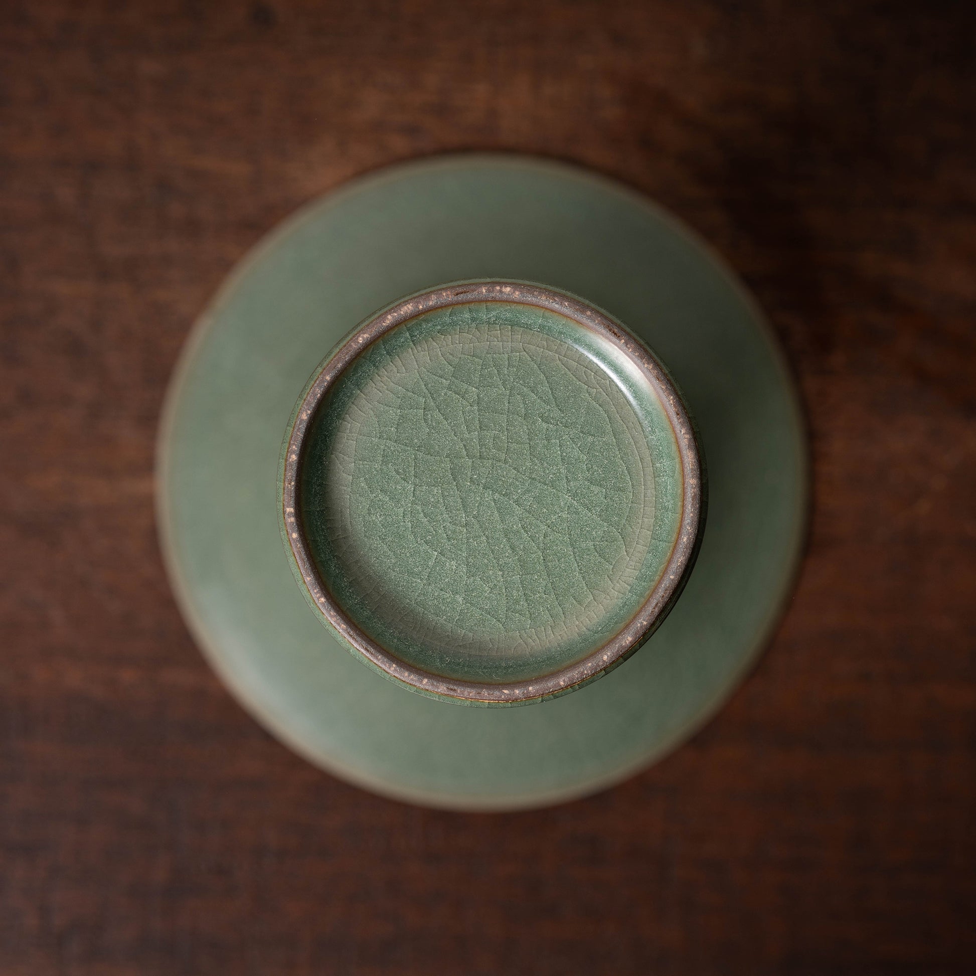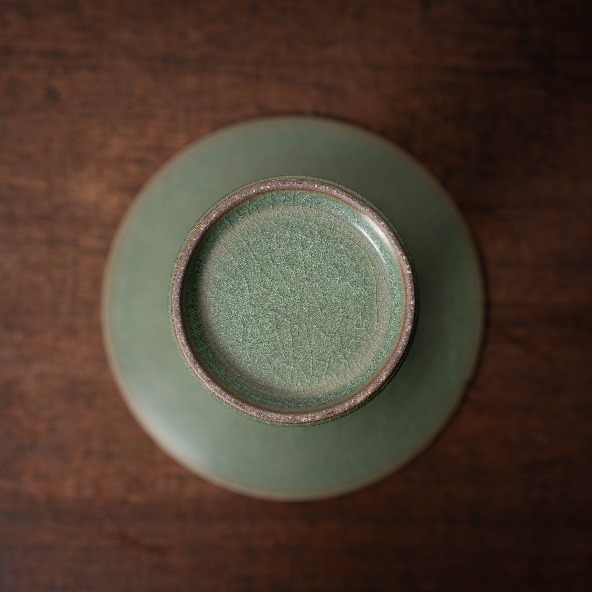 高台は細く均一に作られ、畳付からは南宋官窯らしい黒い土が露胎し、高台内まで施釉されます。