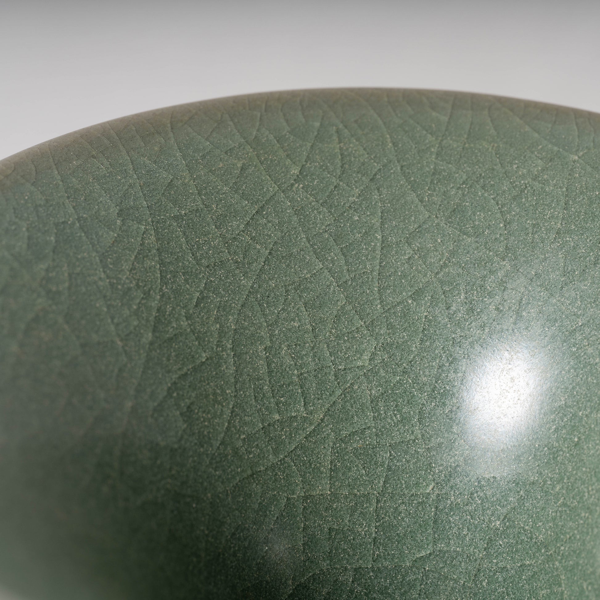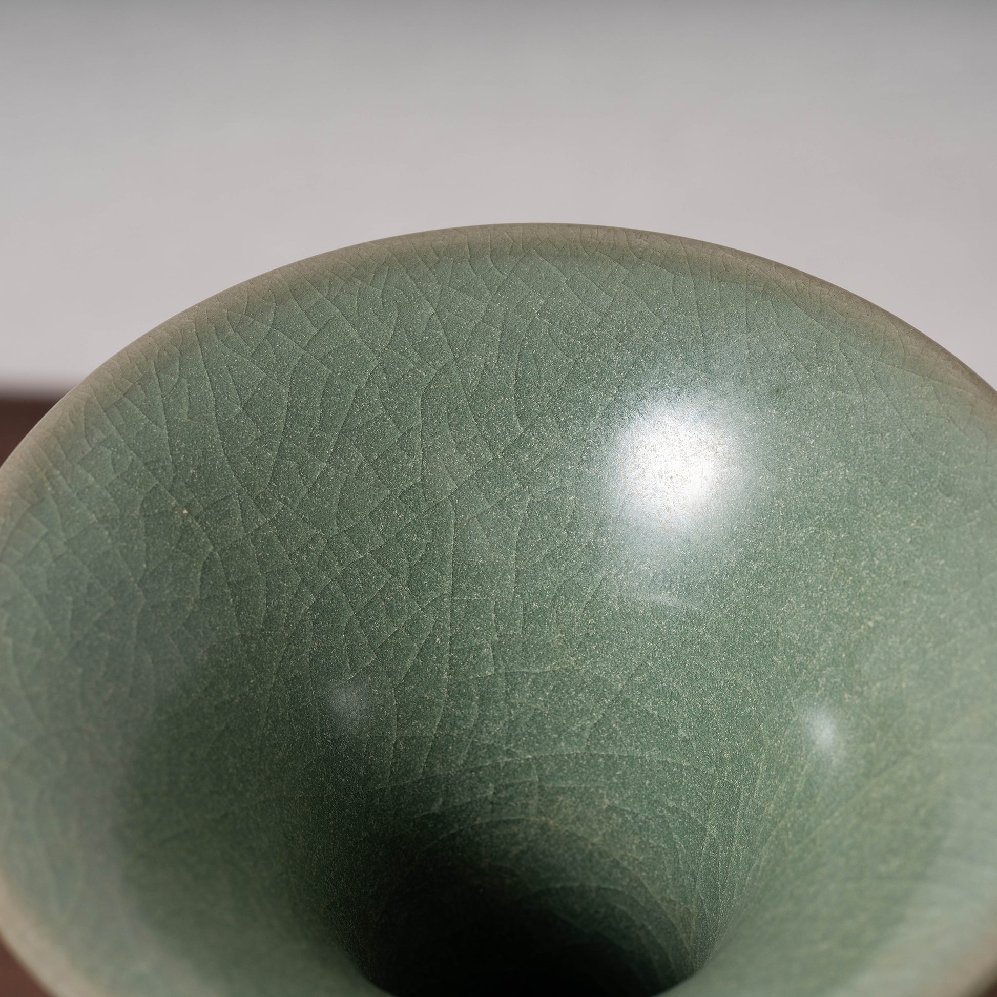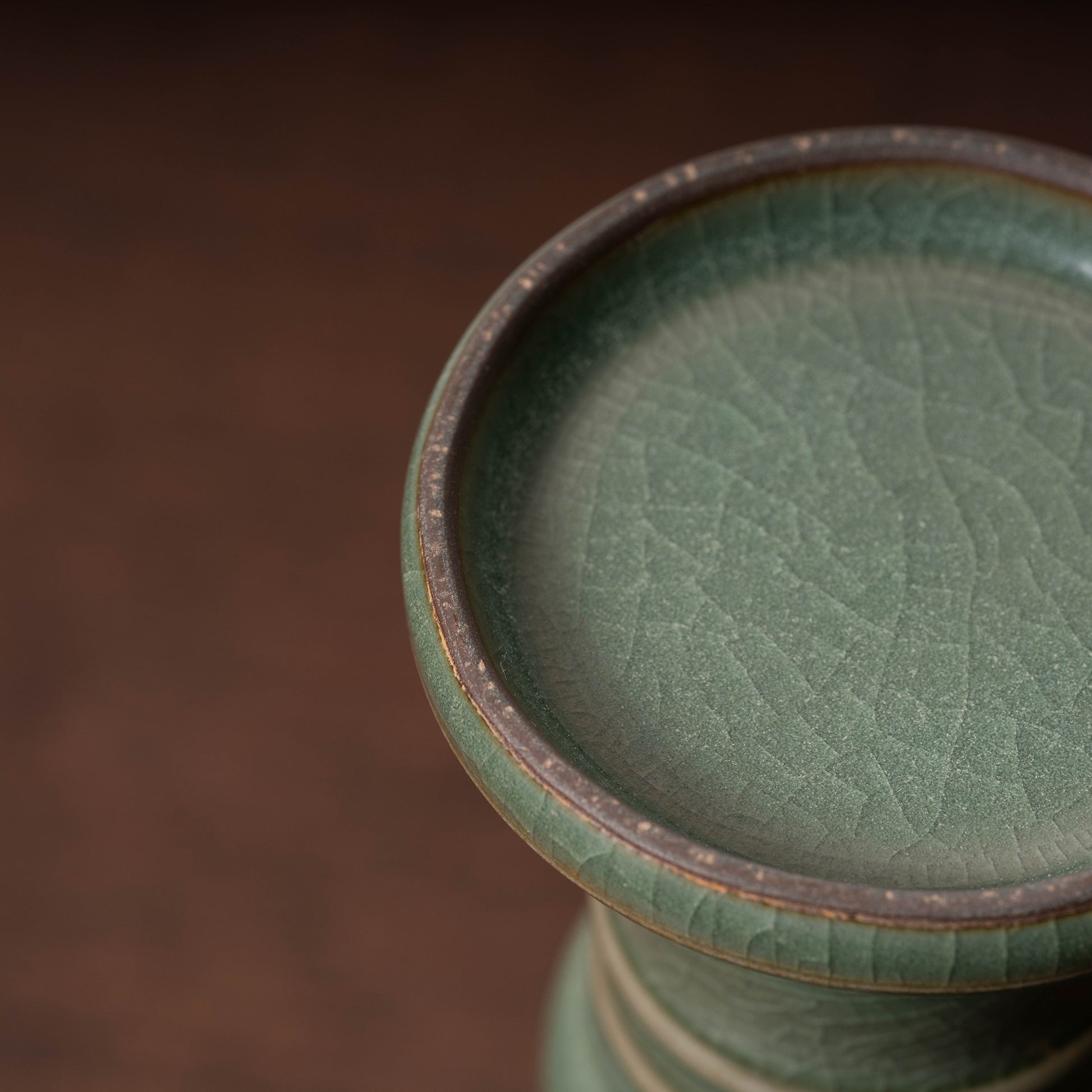 高台は細く均一に作られ、畳付からは南宋官窯らしい黒い土が露胎し、高台内まで施釉されます。