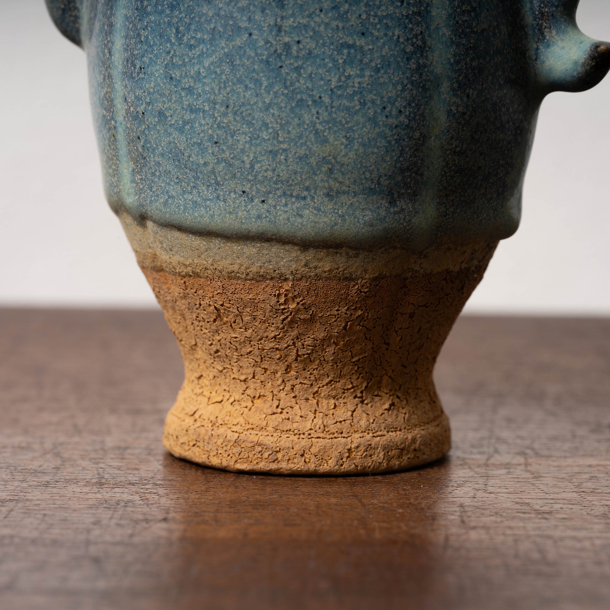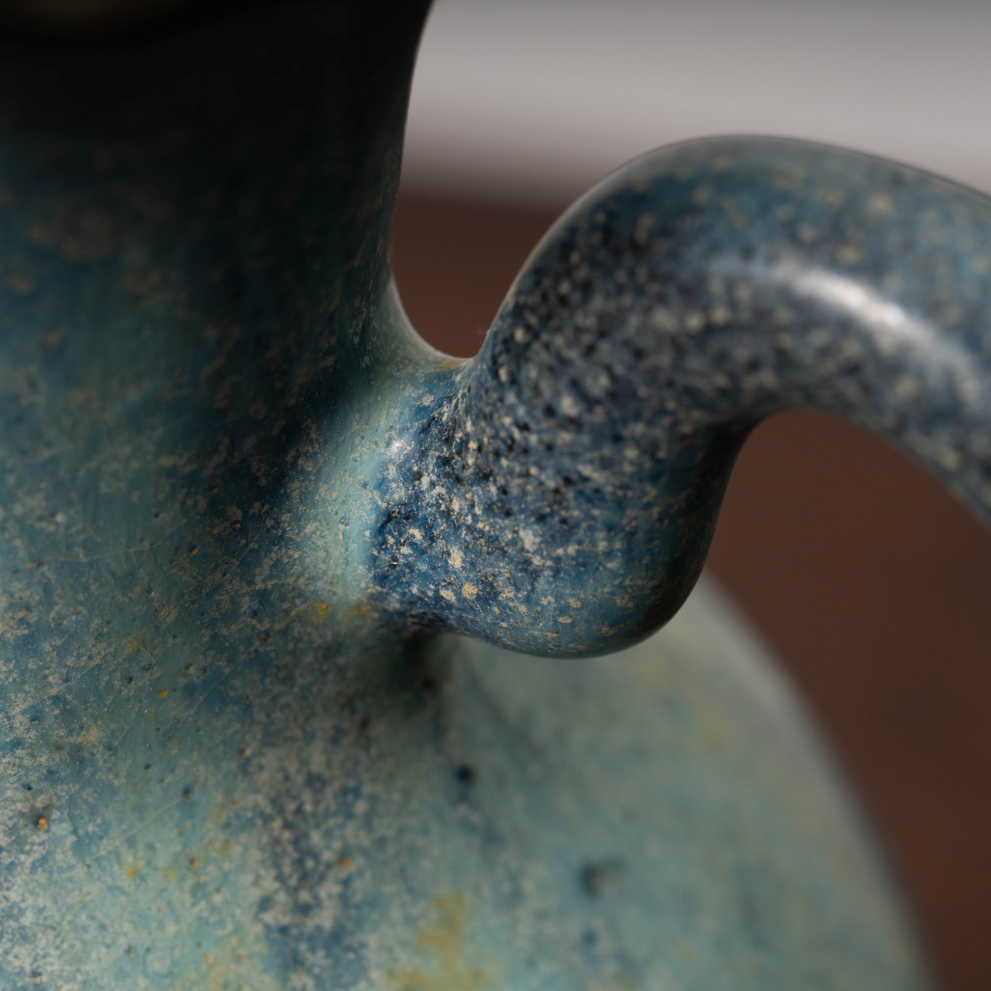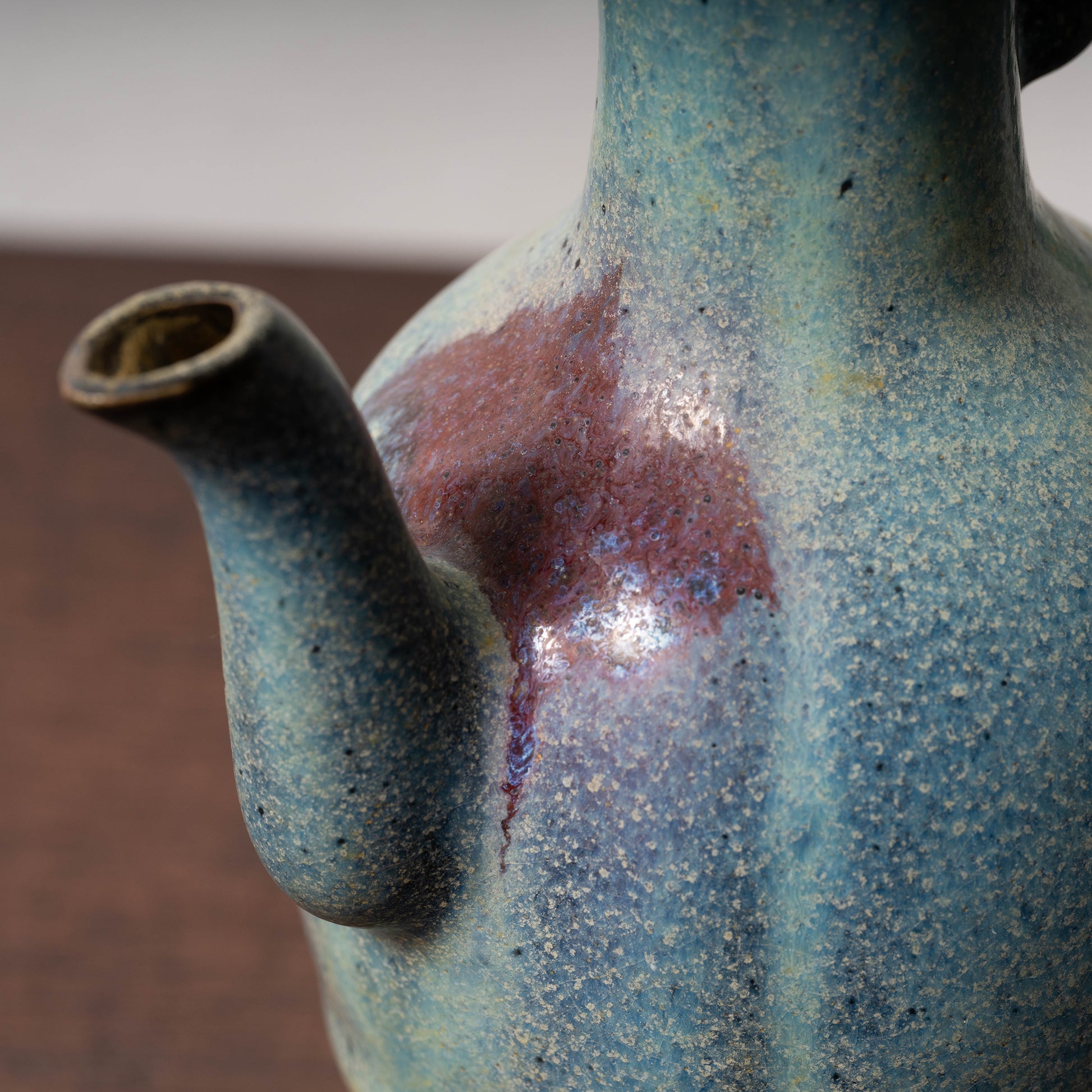 この青釉は口縁部や取手の上部は土が透け黒っぽく、釉の溜まりやすい形や溝などは白っぽくなっております。