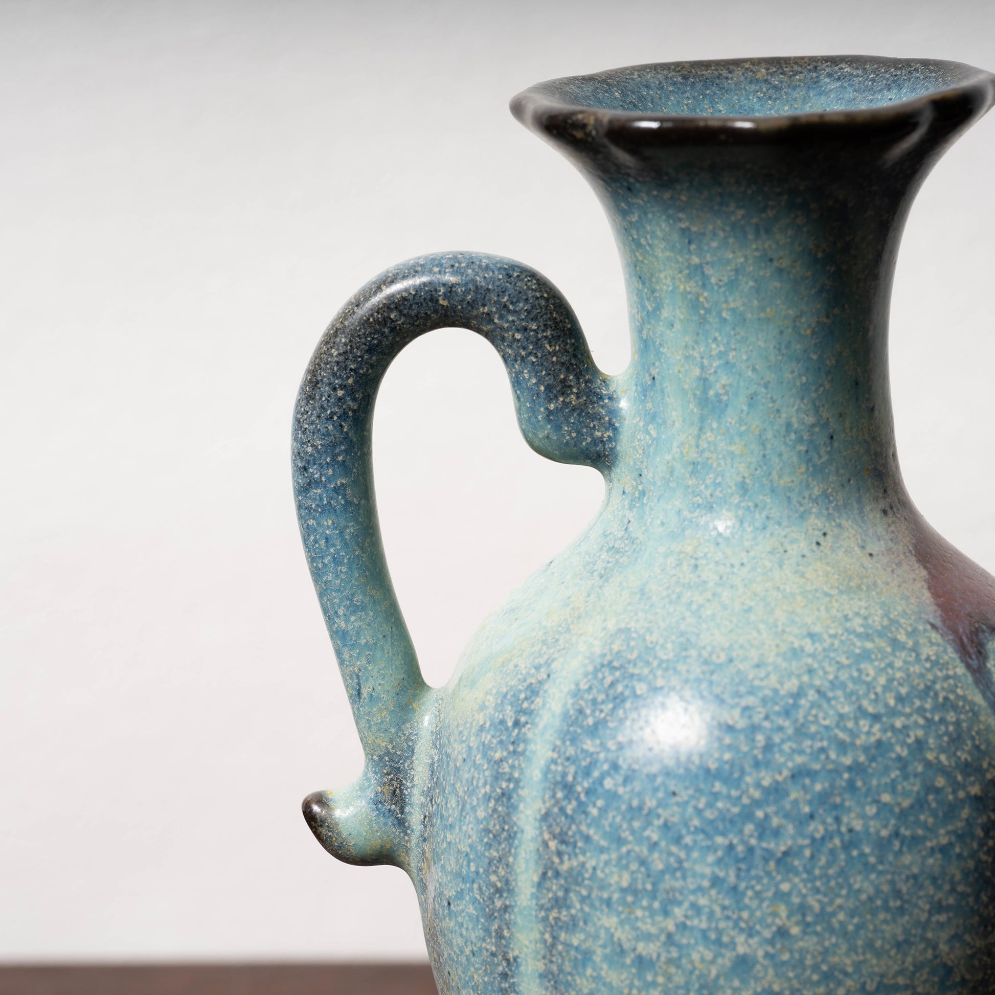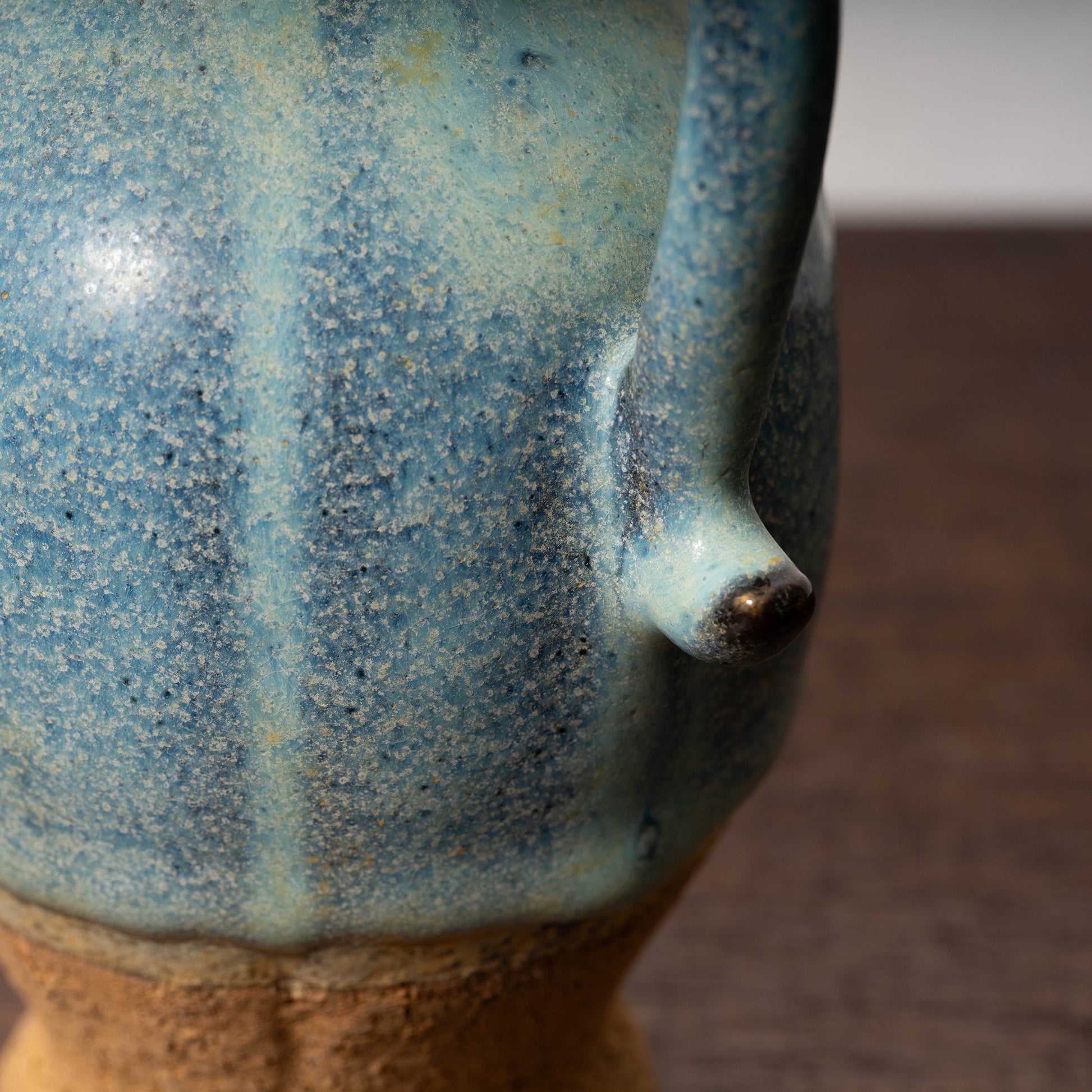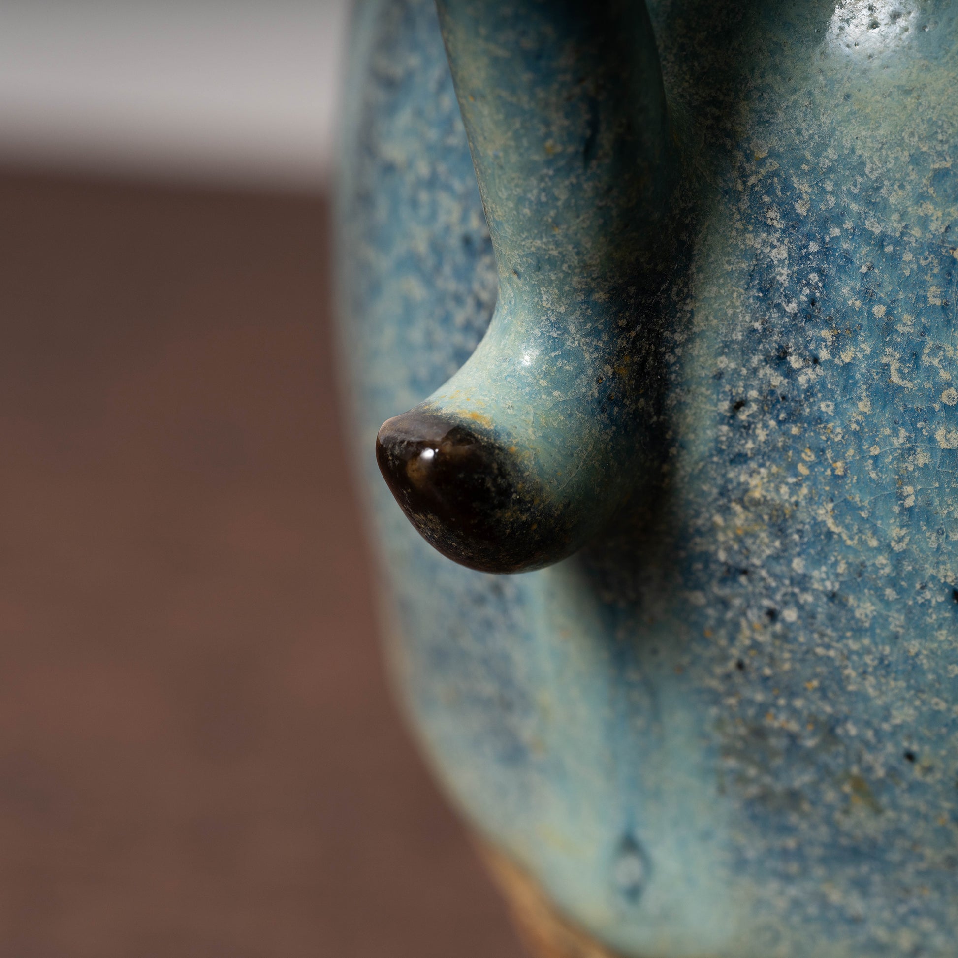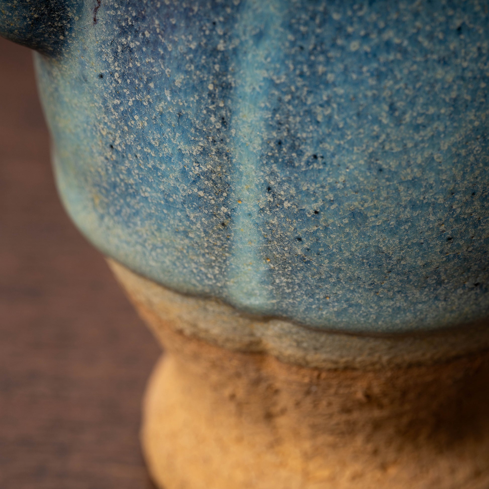 この青釉は口縁部や取手の上部は土が透け黒っぽく、釉の溜まりやすい形や溝などは白っぽくなっております。