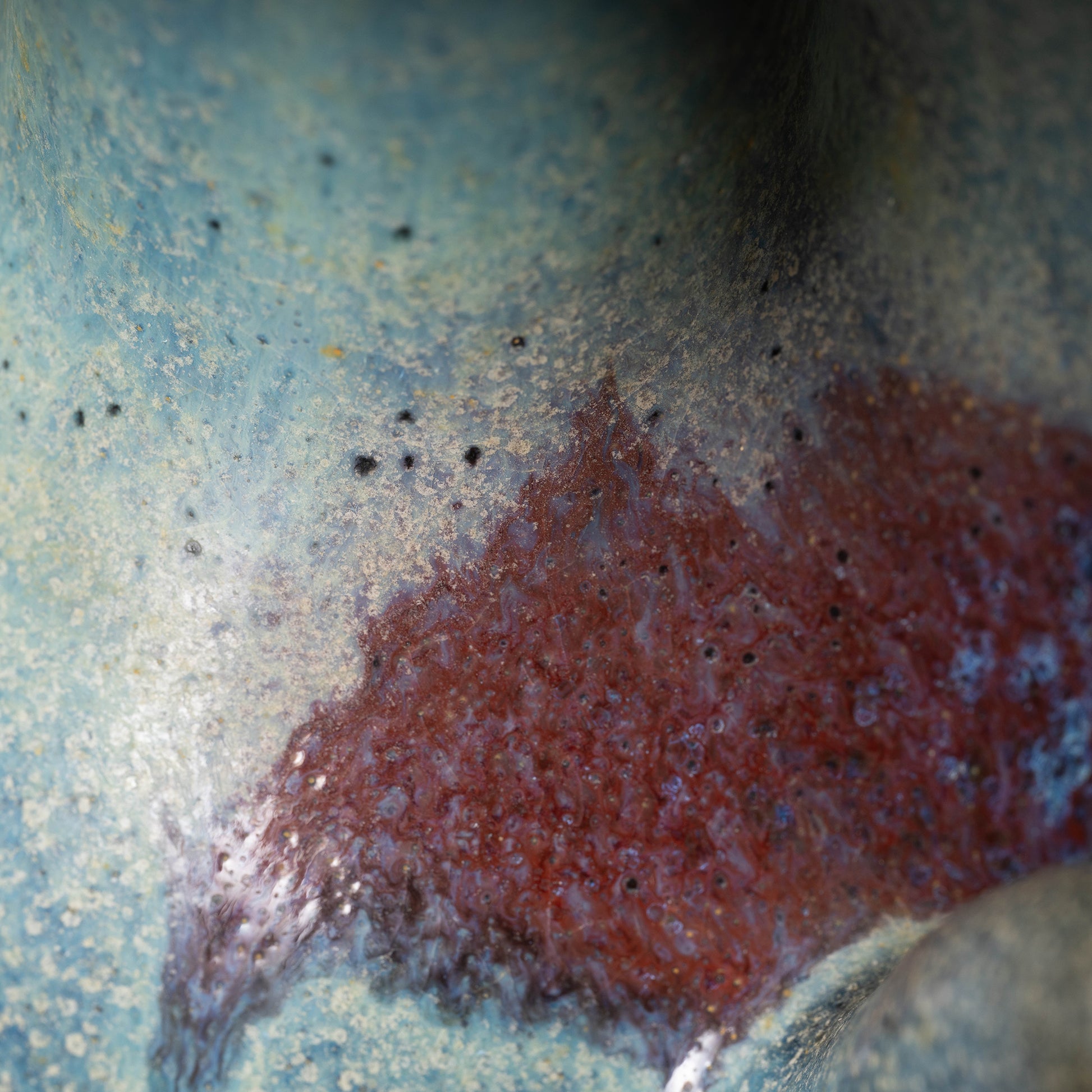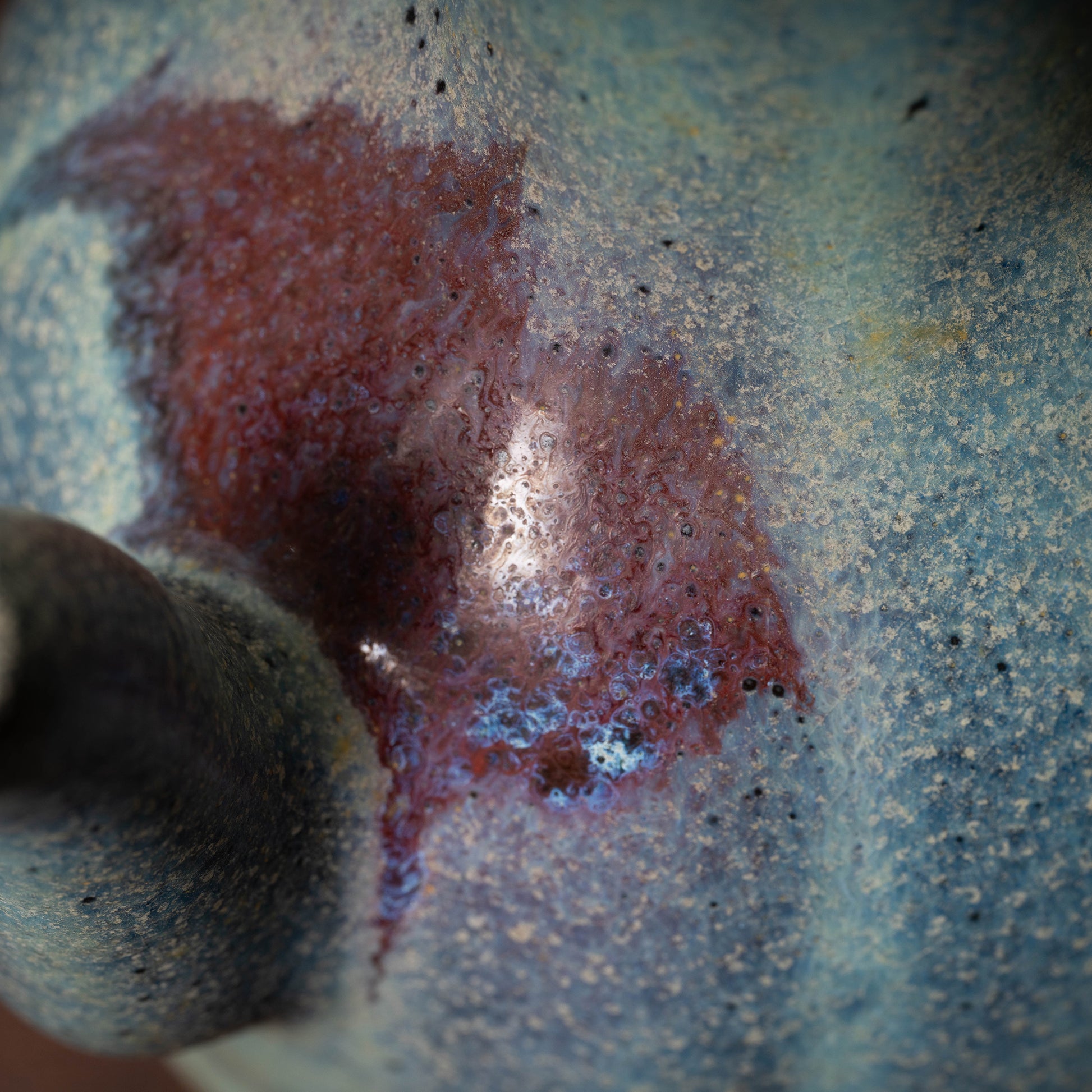 斑紋は窯変現象により一部に青白い結晶を作り、垂れた紫紅釉が澱青釉と混ざりグラデーションとなります。